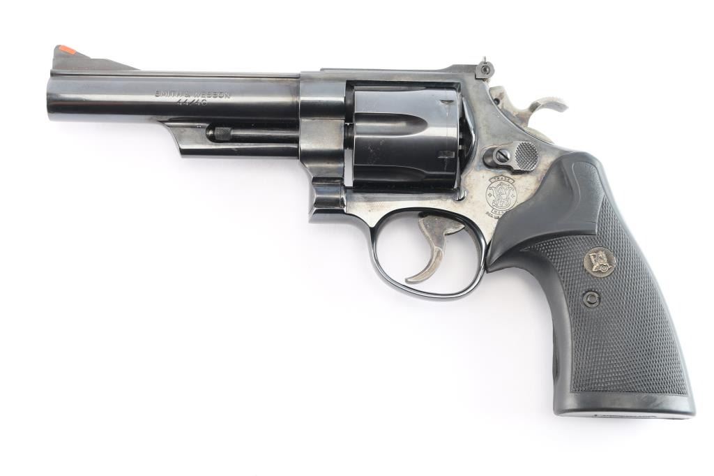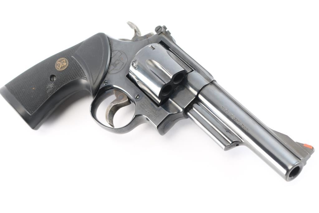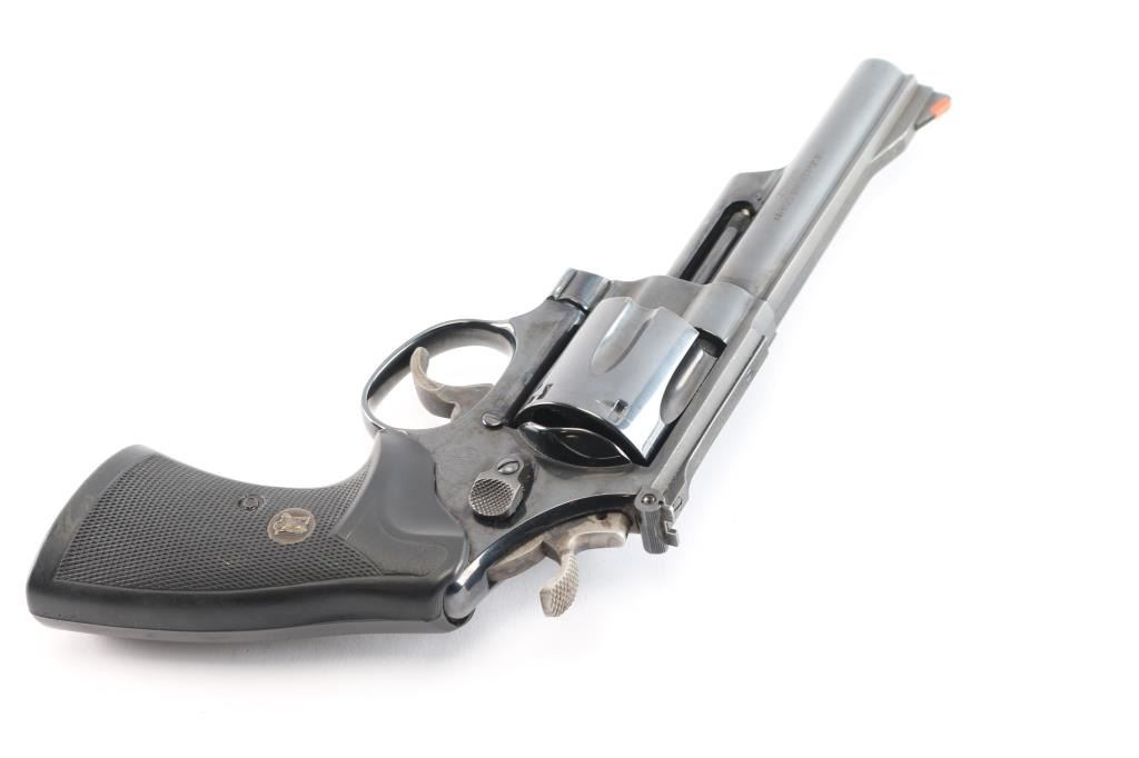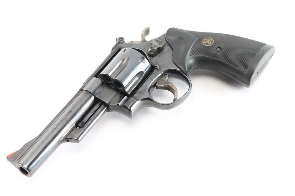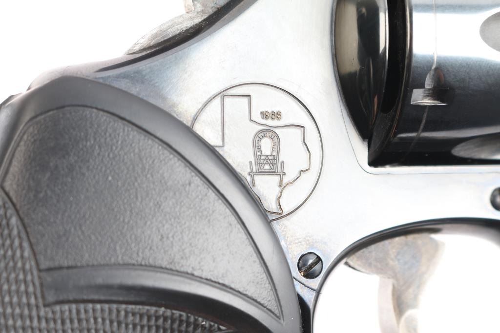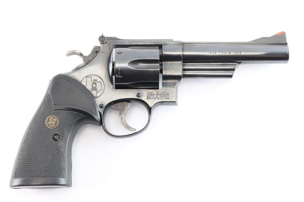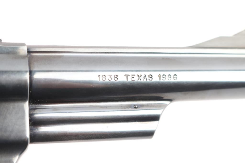 American made double action 'N' frame revolver chambered in .44-40 Winchester manufactured circa 1986 in Springfield, MA. This is a Texas Sesquicentennial Commemorative pistol recognizing a 150 years of statehood, with only 4782 pistols manufactured in total. It features a six-round fluted cylinder, five inch barrel with top rib, a curved serrated target trigger, a target hammer with a checkered spur, checkered rubber Pachmayr grips, red ramped front sight, white outline adjustable rear sight, shrouded extractor rod, and 10 groove serrations on the front and backstrap. The barrel is marked '1936 Texas 1986,' and the frame is marked with a circled state of Texas, a wagon, and the dates '1836' and '1986' on the right side of the frame. The bore is excellent, the grips are excellent, and the action is smooth and crisp. The remaining bluing is approximately 94% with a small amount of edge wear, a drag line and blemishes on the cylinder, and fading finish on the bottom of the under lug. This firearm is coated with a dried oil, or CLP which gums things up a little.