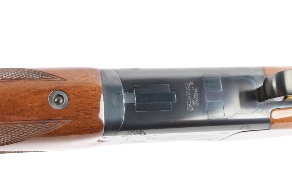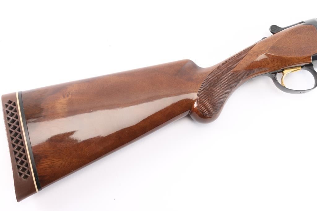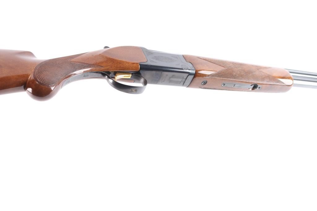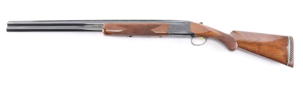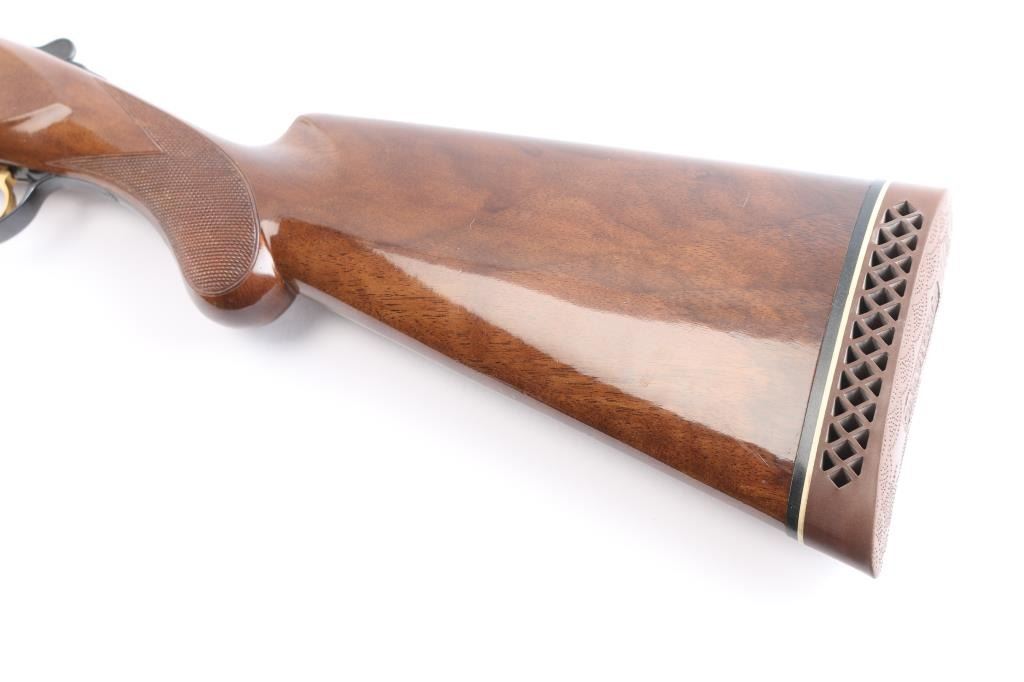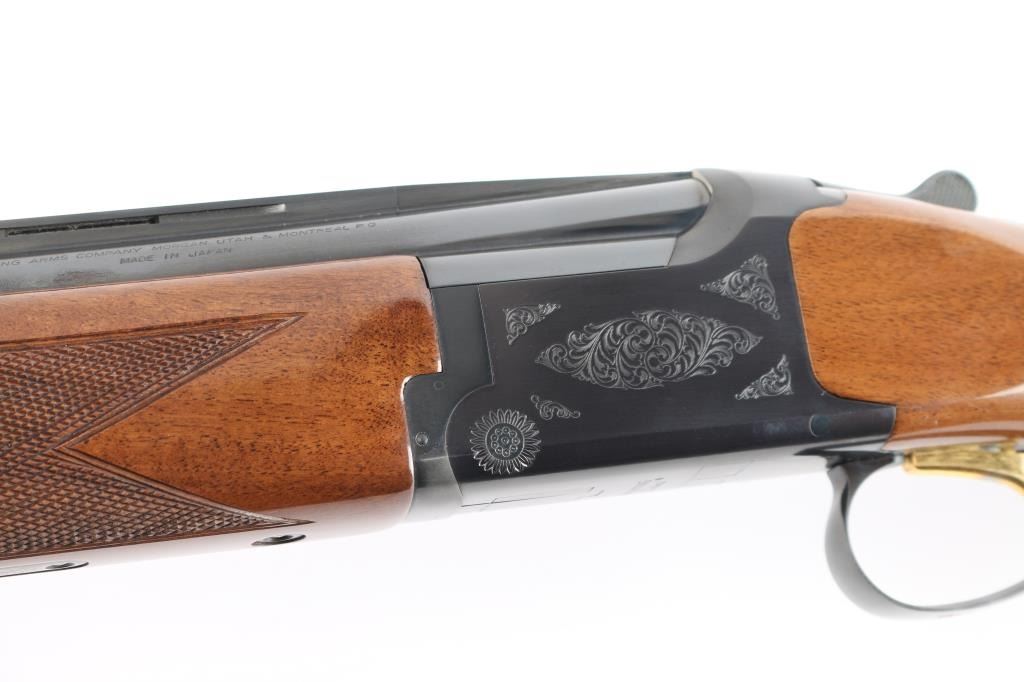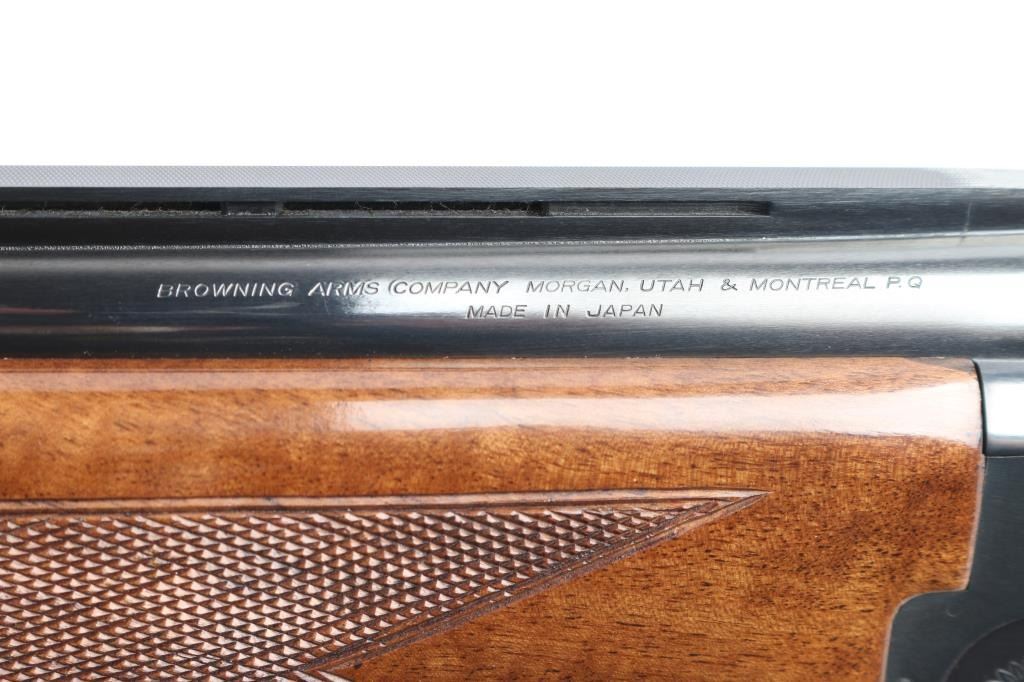 Japanese made over and under box-lock shotgun chambered for 3" 12 Gauge shells, manufactured circa 1988 ('PP' date code). Shotgun imported by Browning Arms Company out of Morgan, UT. and Montreal P.Q. Featuring a gloss blued finish, 28" raised ventilated ribbed barrels, accepts Invector choke tubes with Mod / Imp Cyl installed, steel bead front sight, selective dual ejectors, single curved smooth gold-toned inertia trigger, checkered top lever, and serrated sliding tang safety and barrel selector. The high gloss fancy figured walnut furniture consists of a round knob shoulder stock with checkering at the wrist, checkered forend with deeley latch release, long lower tang, 14-1/4" length-of-pull, 1-9/16 drop at comb, 2-1/4" drop at heel, and a brown Browning rubber ventilated recoil pad with black and white spacers. The receiver displays limited coverage floral scrolls, and edge designs. The engraving extends to the trigger guard with a gold Browning insignia. Receiver, forend, and barrels all have matching serial numbers, '03559.' The original blued finish remaining is approximately 98% with little remarkable to speak of. Bores look excellent and bright, and the action is tight with the top lever resting right of center. Furniture wood is excellent with only a few scattered nicks and dings, where most are on the bottom of the buttstock. The metal shows no rust or deformation.