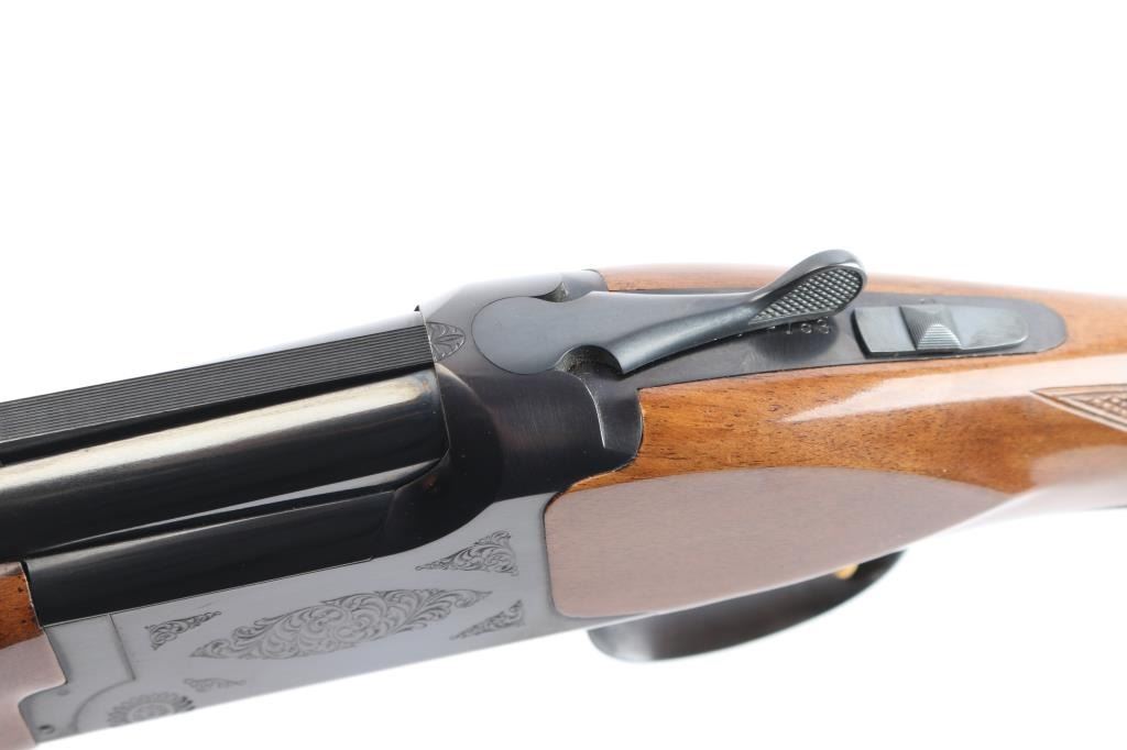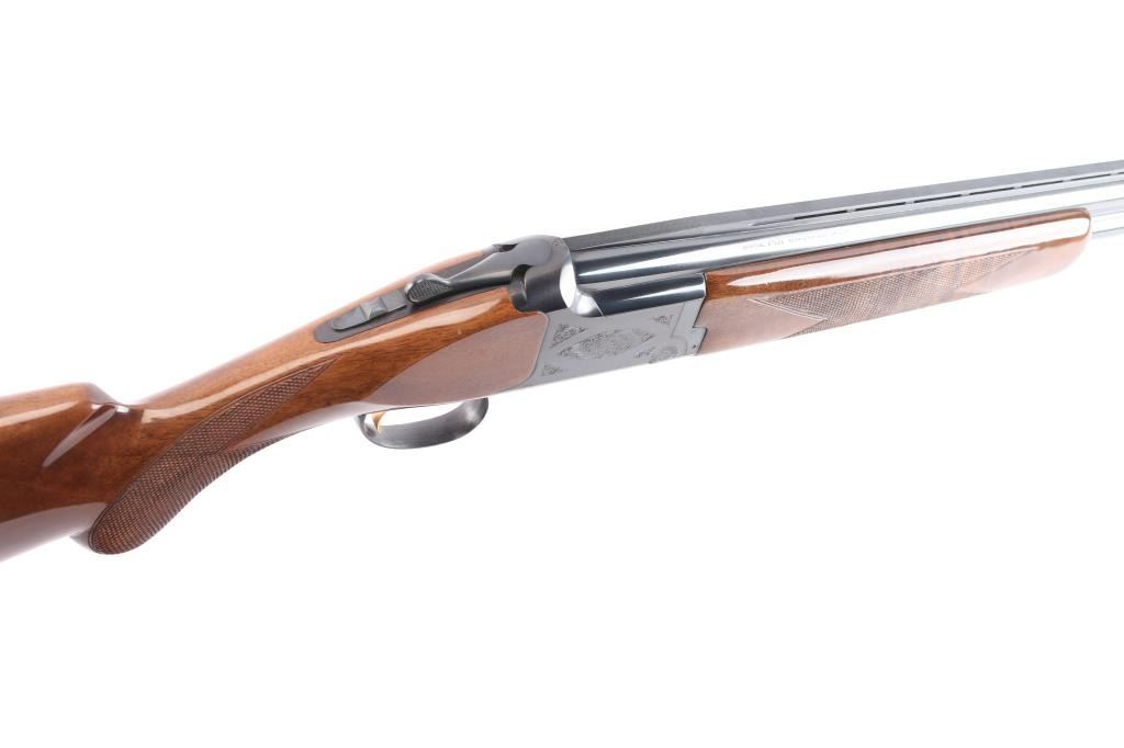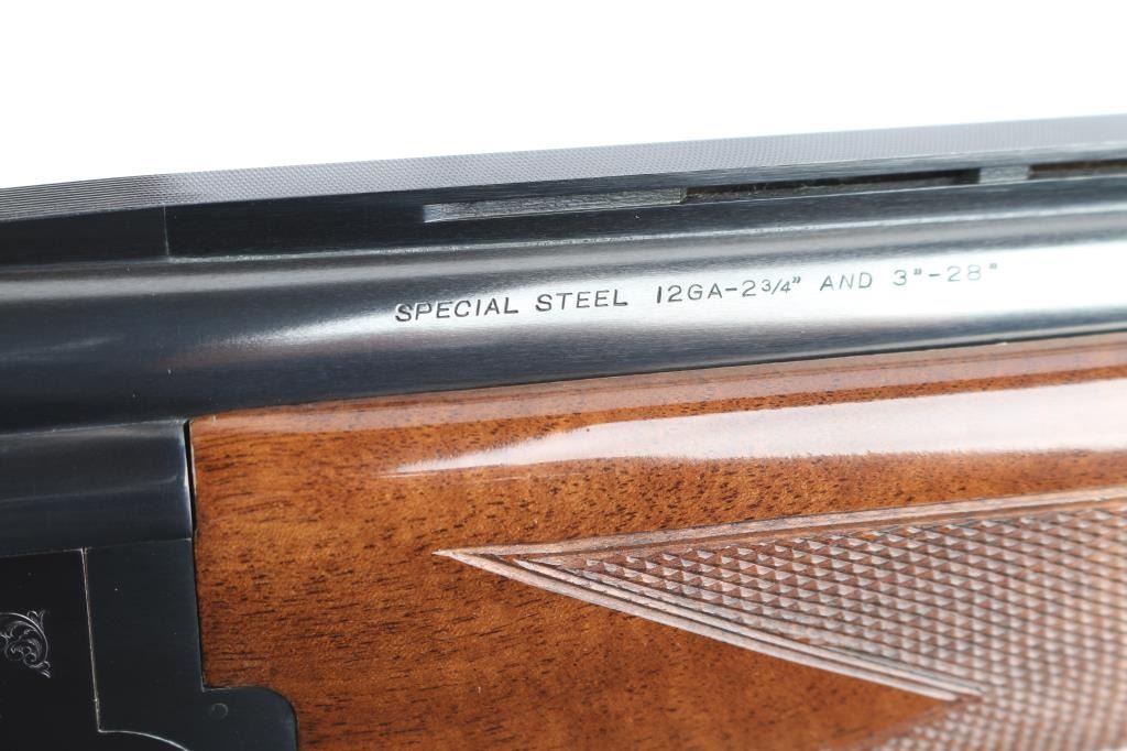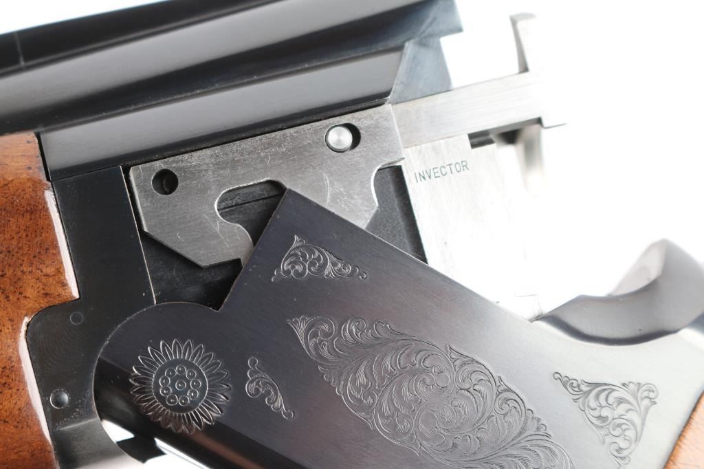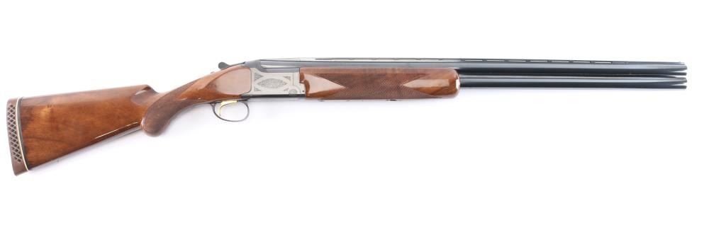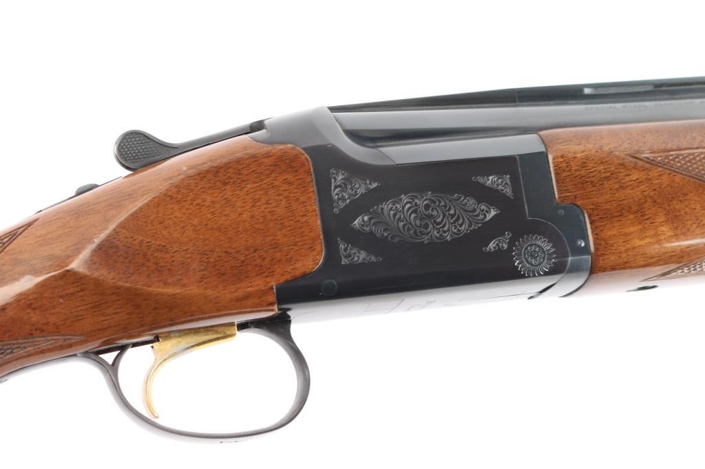 Japanese made over and under box-lock shotgun chambered for 3" 12 Gauge shells, manufactured circa 1988 ('PP' date code). Shotgun imported by Browning Arms Company out of Morgan, UT. and Montreal P.Q. Featuring a gloss blued finish, 28" raised ventilated ribbed barrels, accepts Invector choke tubes with Mod / Imp Cyl installed, steel bead front sight, selective dual ejectors, single curved smooth gold-toned inertia trigger, checkered top lever, and serrated sliding tang safety and barrel selector. The high gloss fancy figured walnut furniture consists of a round knob shoulder stock with checkering at the wrist, checkered forend with deeley latch release, long lower tang, 14-1/4" length-of-pull, 1-9/16 drop at comb, 2-1/4" drop at heel, and a brown Browning rubber ventilated recoil pad with black and white spacers. The receiver displays limited coverage floral scrolls, and edge designs. The engraving extends to the trigger guard with a gold Browning insignia. Receiver, forend, and barrels all have matching serial numbers, '03559.' The original blued finish remaining is approximately 98% with little remarkable to speak of. Bores look excellent and bright, and the action is tight with the top lever resting right of center. Furniture wood is excellent with only a few scattered nicks and dings, where most are on the bottom of the buttstock. The metal shows no rust or deformation.