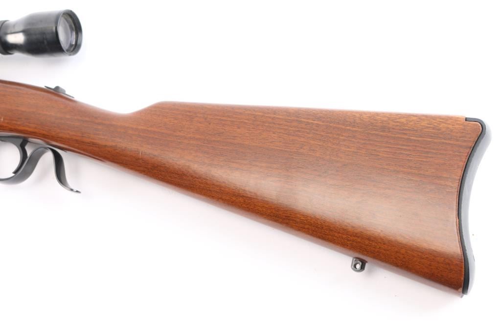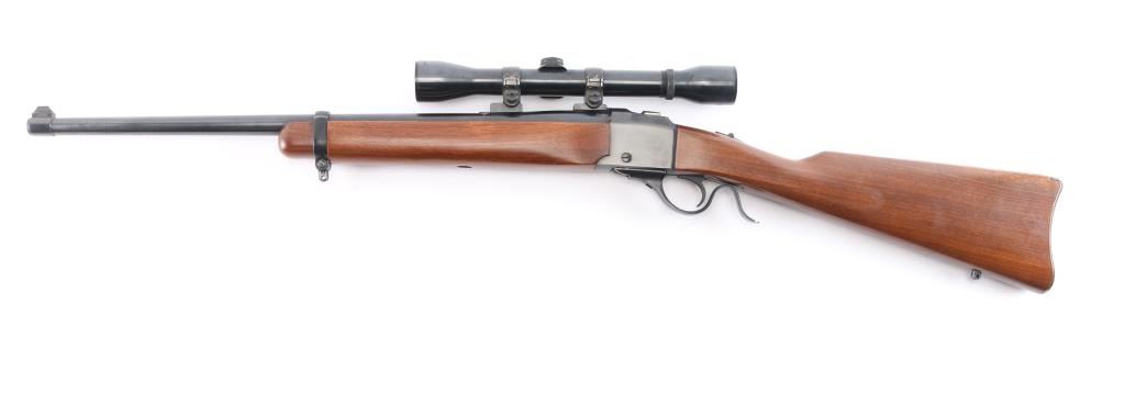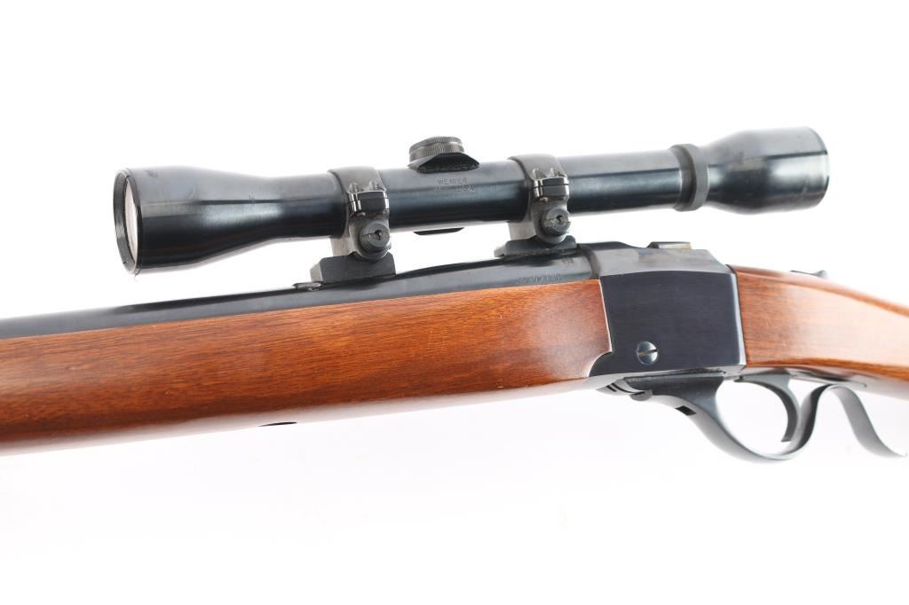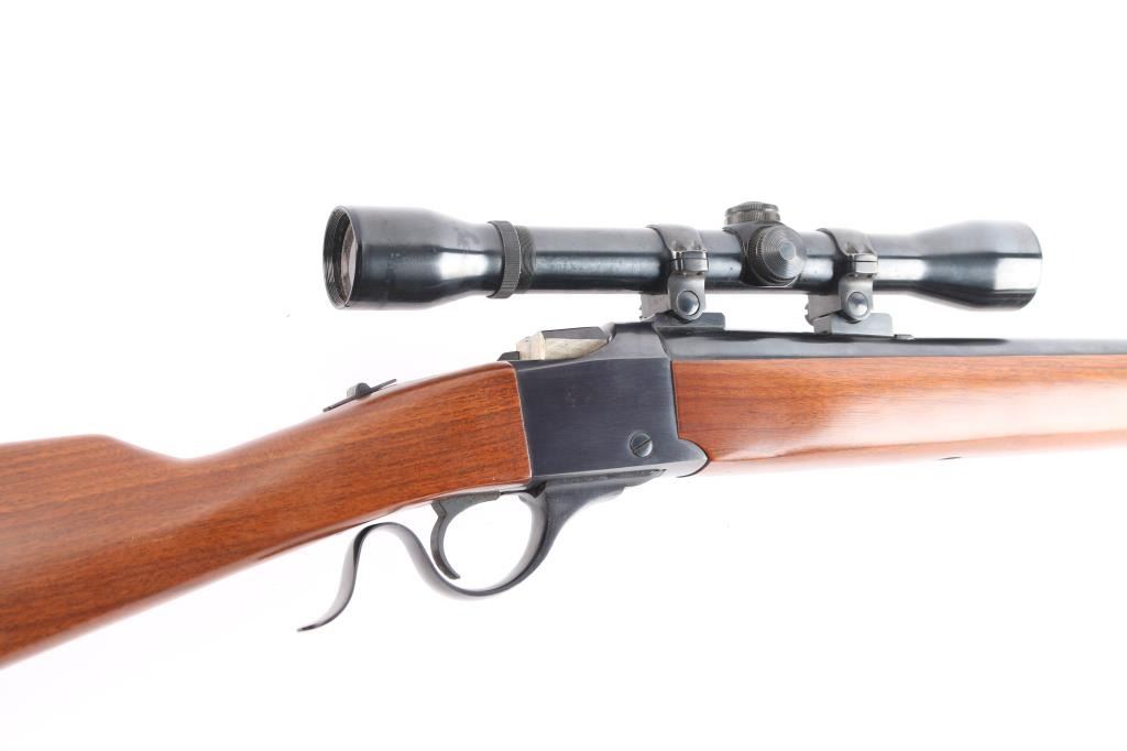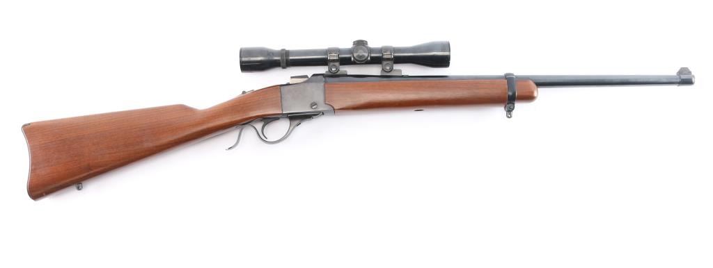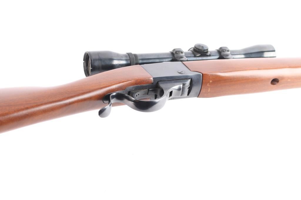 American made single-Shot falling block action based on the No 1 Rifle manufactured circa 1974 in Southport, CT. Produced from 1973-1986, it features a simpler one-piece breech lever, an approximately 22" tapered barrel, a front blade/bead sight, rear sight dovetail filled with a slot blank, two piece scope bases mounted on barrel, sliding tang safety, a sling swivel stud on the barrel band, a sling swivel stud in the buttstock, and serrated curved adjustable trigger. The furniture includes a straight smooth walnut buttstock, smooth forearm with barrel band, and a smooth metal buttplate. The original blued finish retained is approximately 98% with little to no edge wear, or scratches, with the only remarkable blemishes on the buttplate from storage. The action is smooth and tight. Bore appears bright with strong rifling. The wood furniture is very good to excellent with minor marks on the bottom of the forend, and the rear of the buttstock. The scope bases and rings may be Ruger factory equipment, and they mount a Weaver K4-F fixed four power scope with a duplex reticle.