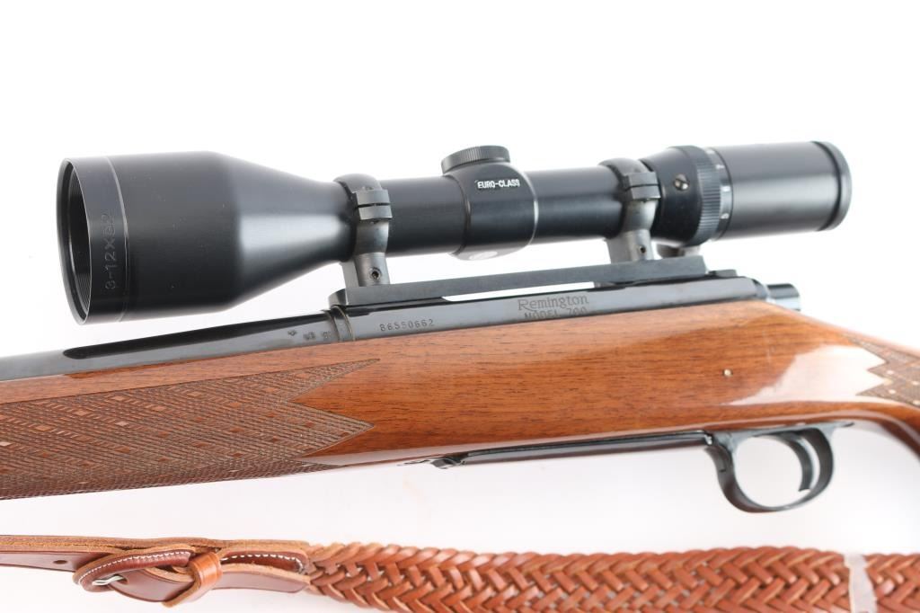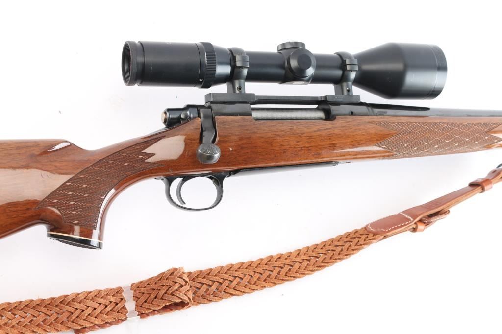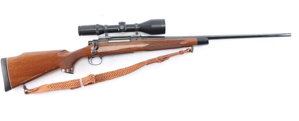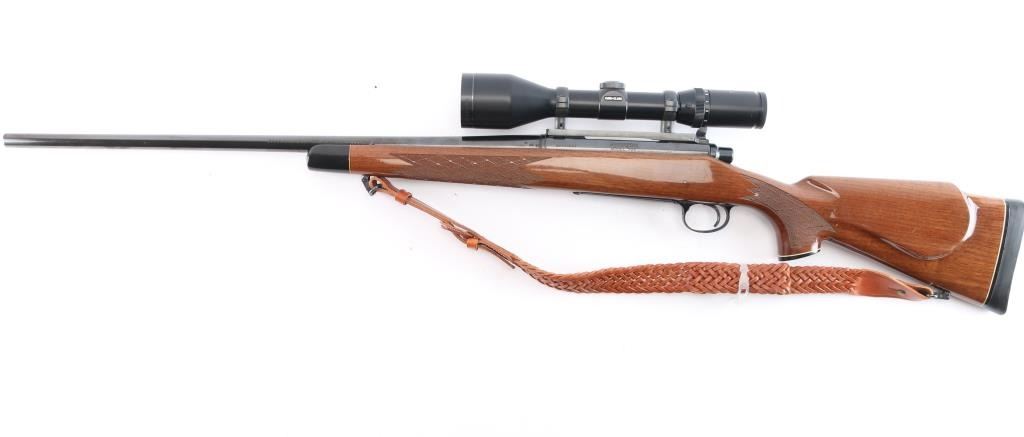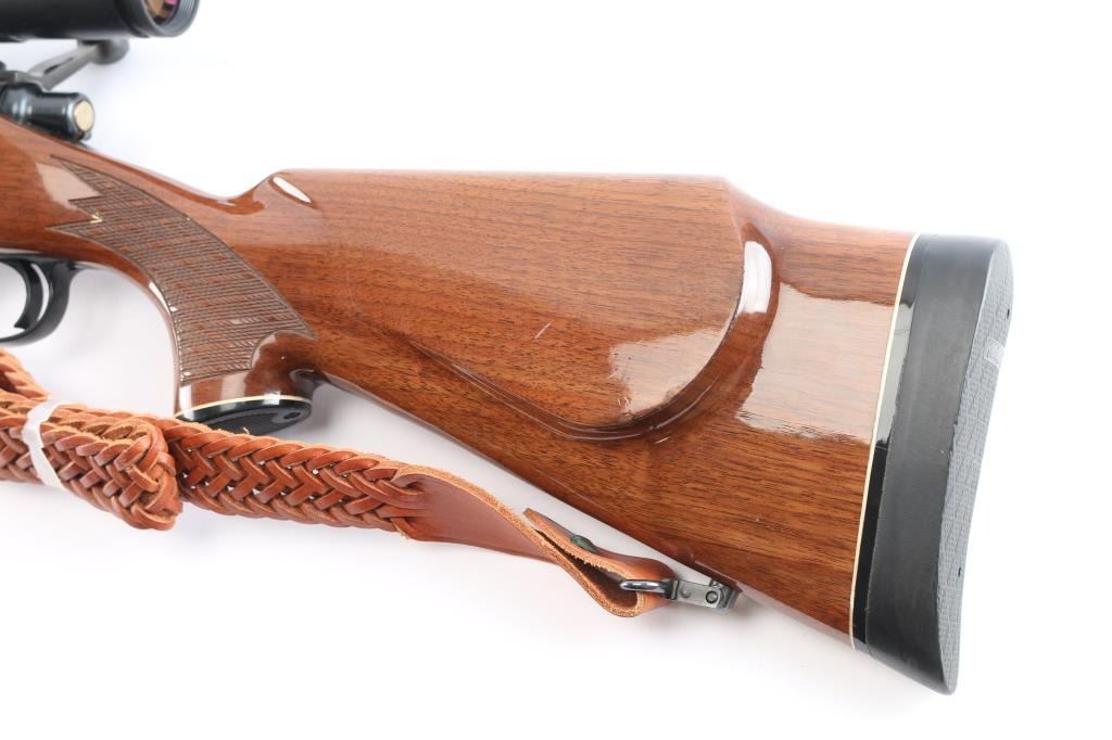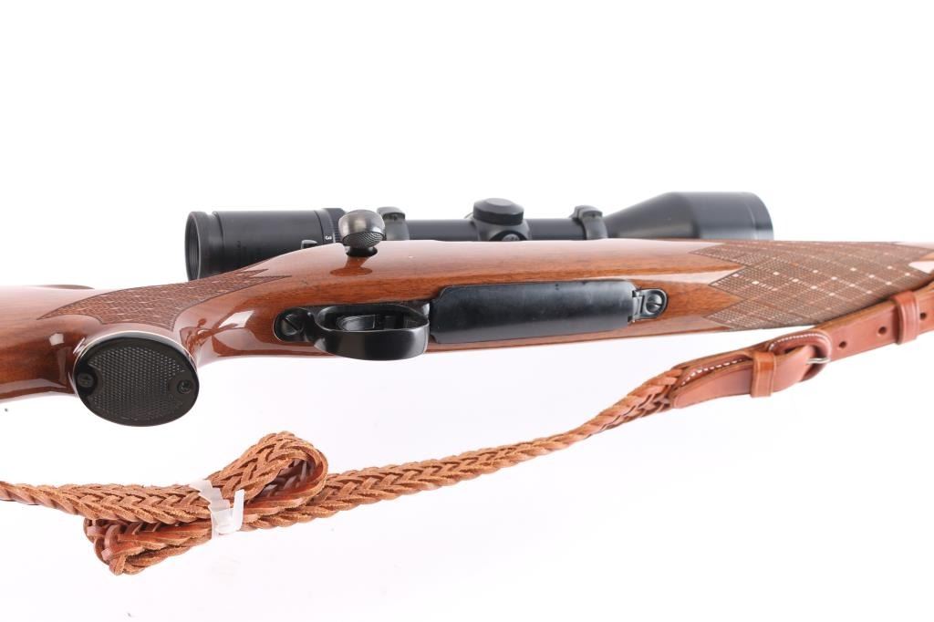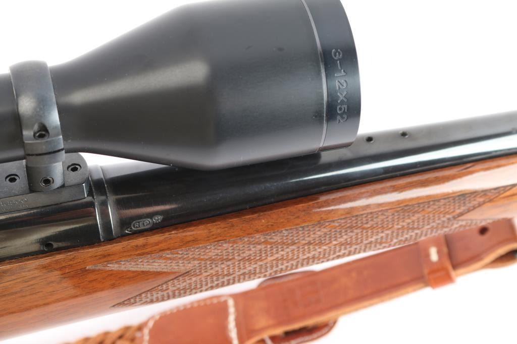 'Long Action' BDL American bolt action sporting rifle. Features blued finish, wood stock with checkered panels at wrist & forend, right hand cheek piece, factory solid rubber recoil pad, grip cap, black forend tip with white spacers. 24" tapered barrel, hinged floorplate, manual thumb safety, cocking indicator, machine turned 'jeweled' bolt. Sights have been removed, mounted with a Tasco Euro-Class 3-12x52 scope, duplex reticle, clear optics. Bore is excellent/bright. Retains 97% finish with a couple of minor scratches on the barrel, some handling wear on bolt handle. Stock is near excellent with minor blemishes. Nice Kassnar brown braided Leather attached.