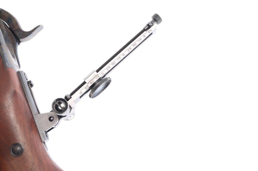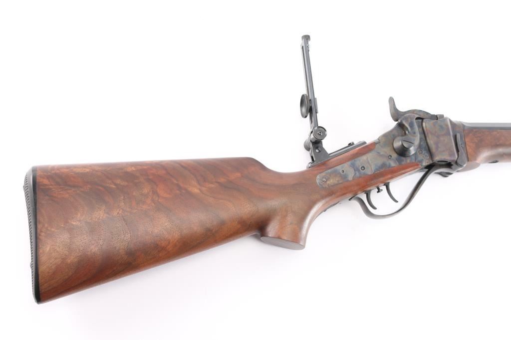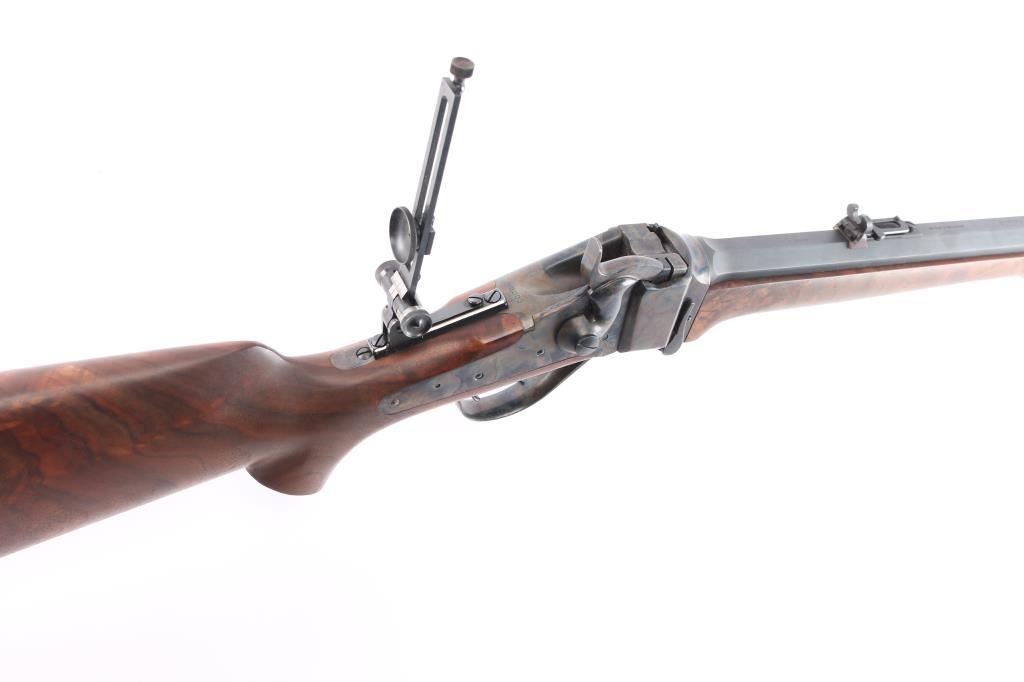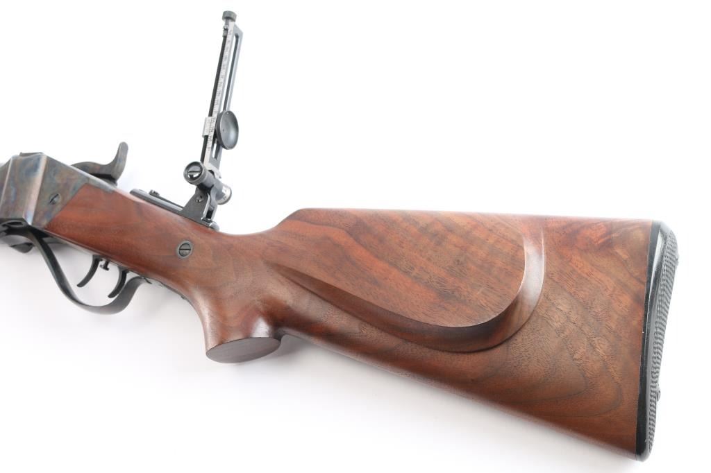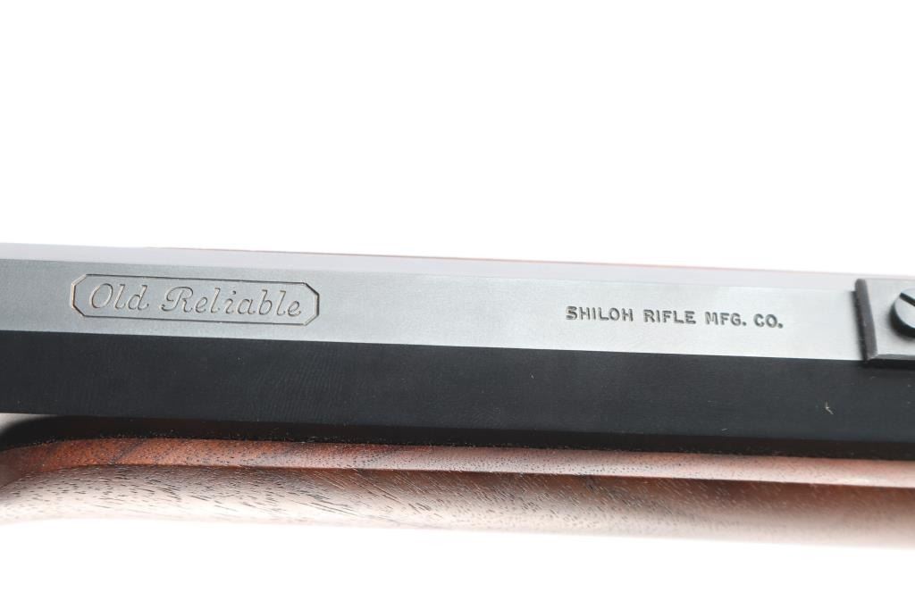 American made breech loading falling-block rifle chambered in .45-70 Government, manufactured by Shiloh Rifle Mfg. Company out of Big Timber, MT. The "Old Reliable" rifle features a matte blued heavy 30" part octagonal and part round barrel, adjustable Lawrence style flip-up rear sight, long range vernier tang sight, globe front sight, checkered lower tang, double-set smooth curved triggers, and checkered hammer spur. Receiver, trigger guard/lever, block, and hammer are color-case hardened, with the barrel and some sight parts blued. The furniture consists of a smooth semi-pistol grip buttstock with shadow line cheek piece, smooth schnabel forend, and a checkered black plastic buttplate. Bore appears bright with strong rifling, and the action is smooth and crisp. Furniture wood is excellent with only superficial blemishes. The original blued finish is about 98% with only superficial blemishes. The color case finish is also excellent with extremely light scratches.