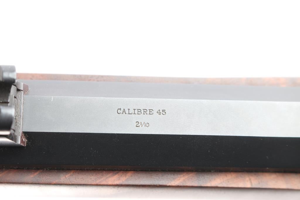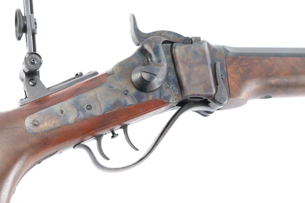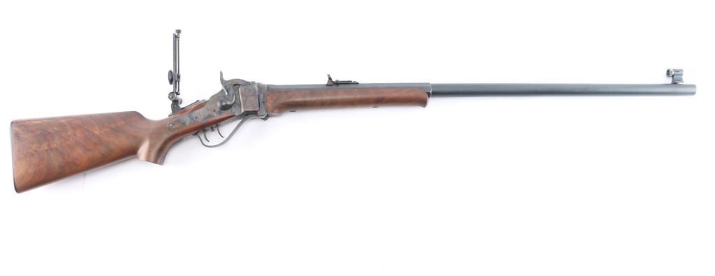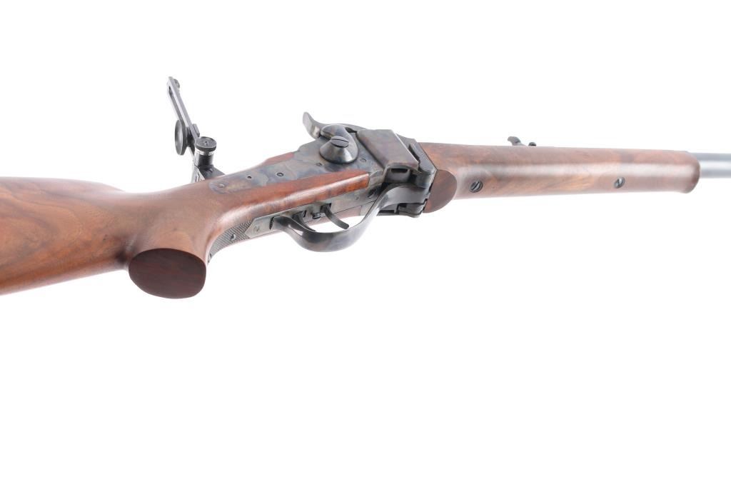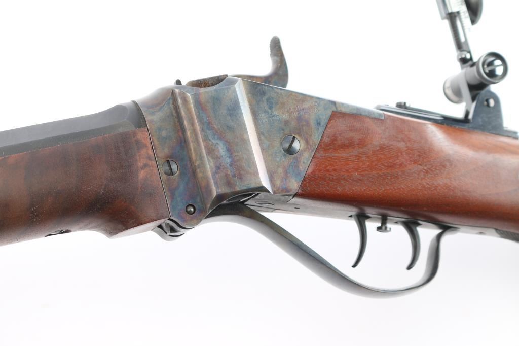 American made breech loading falling-block rifle chambered in .45-70 Government, manufactured by Shiloh Rifle Mfg. Company out of Big Timber, MT. The "Old Reliable" rifle features a matte blued heavy 30" part octagonal and part round barrel, adjustable Lawrence style flip-up rear sight, long range vernier tang sight, globe front sight, checkered lower tang, double-set smooth curved triggers, and checkered hammer spur. Receiver, trigger guard/lever, block, and hammer are color-case hardened, with the barrel and some sight parts blued. The furniture consists of a smooth semi-pistol grip buttstock with shadow line cheek piece, smooth schnabel forend, and a checkered black plastic buttplate. Bore appears bright with strong rifling, and the action is smooth and crisp. Furniture wood is excellent with only superficial blemishes. The original blued finish is about 98% with only superficial blemishes. The color case finish is also excellent with extremely light scratches.