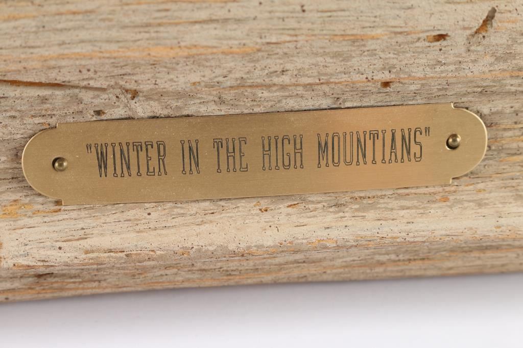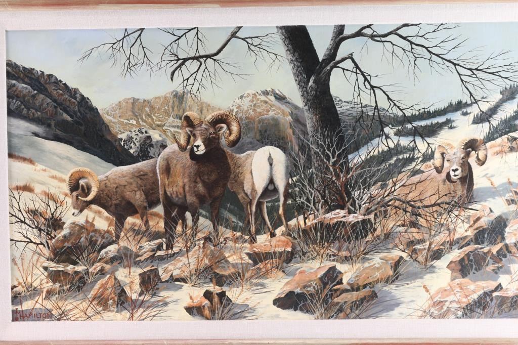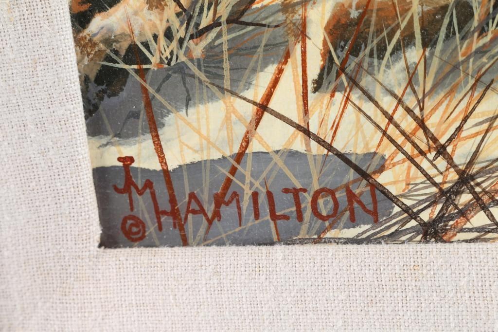 By Colorado artist, Jack M. Hamilton, titled "Winter in the High Mountains". Beautifully matted in natural linen and framed in natural-toned wood. Measures 42" wide by 29" tall. Hamilton loved the outdoors, nature's wildlife and American history. He spent years watching, studying and photographing his favorite subjects, often from his working cattle ranch in southern Colorado. Painting on both canvas and panel, Hamilton worked entirely in the medium of oil. Self-taught, the artist painted in the manner of the old masters. Hamilton was exhibited at many of the country's finest galleries and at many fine art shows. His work has been featured on the cover of, as well as in, national magazines.