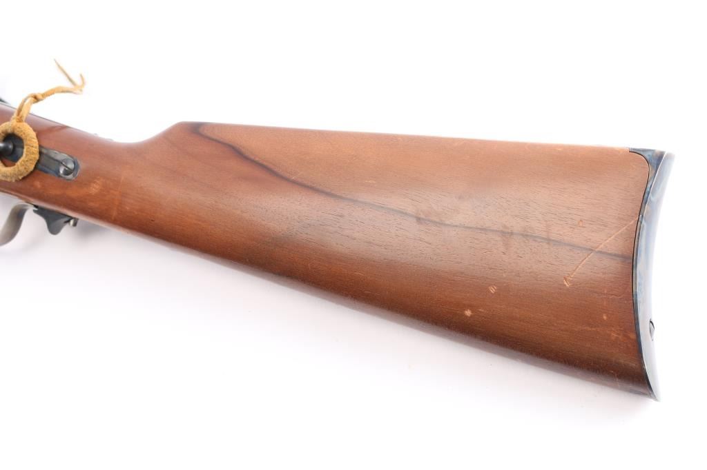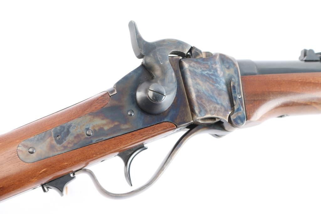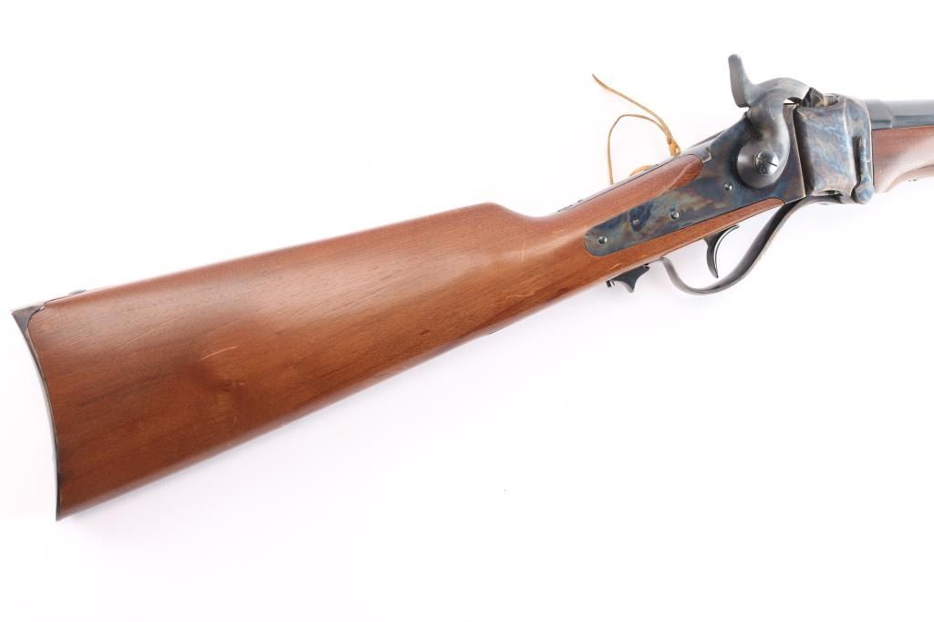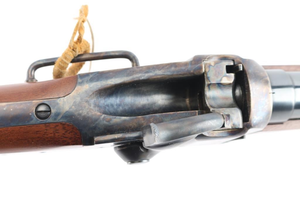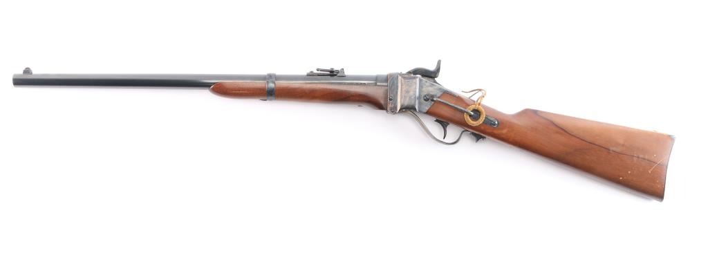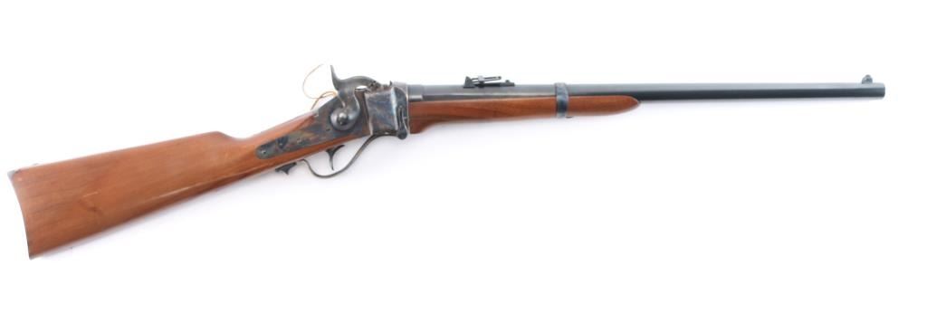 Italian reproduction of the Sharps Model 1874 falling block single shot rifle chambered in 45-70 Government, manufactured circa 1993. Importer mark not found. Featuring an approximately 22" blued heavy round barrel, blade front sight, folding ladder rear sight graduated to 800 yards (sight leaf broken on the bottom left side), smooth curved trigger, sliding safety on bottom tang, color-case hardened receiver, color-case hammer with checkered spur, saddle ring, color-case barrel band, smooth walnut forend, smooth straight grip shoulder stock, and smooth color-case metal buttplate. Rifle exhibits approximately 97% of it's original finish remaining showing losses on top of the barrel in front of the barrel band, and superficial edge wear and scratches. The color-case finish is excellent with very minor blemishes. The action is smooth and crisp. Bore is bright with strong rifling, and the wood furniture is very good with several small blemishes mostly on the buttstock. The rear sight is broken, but no parts are missing.