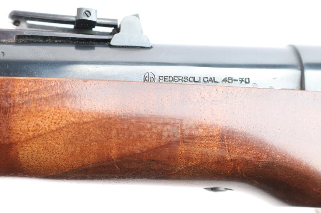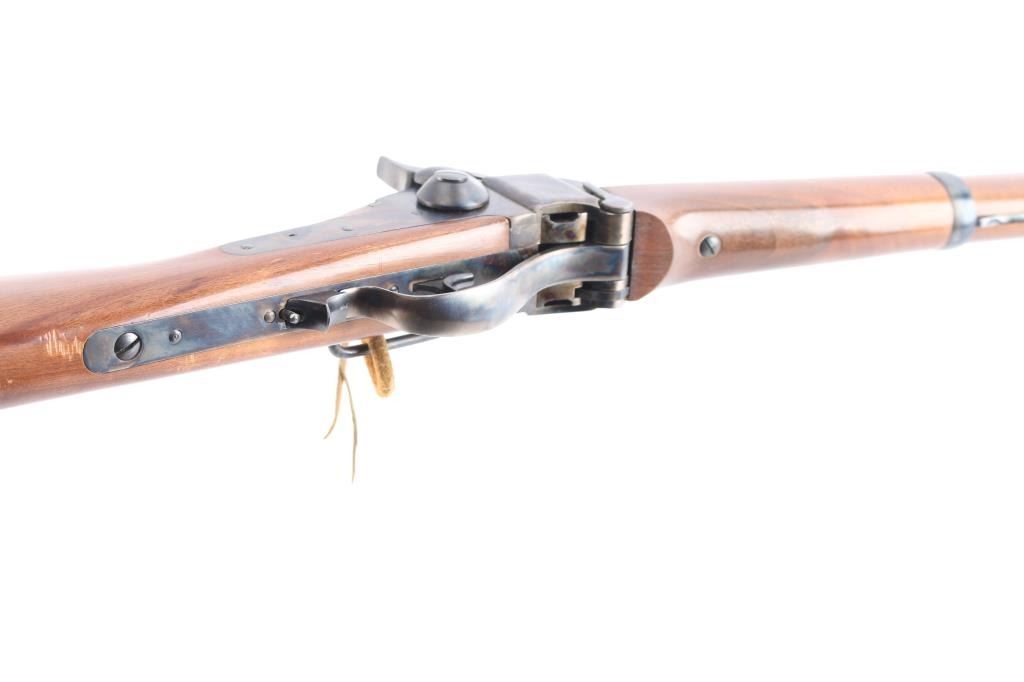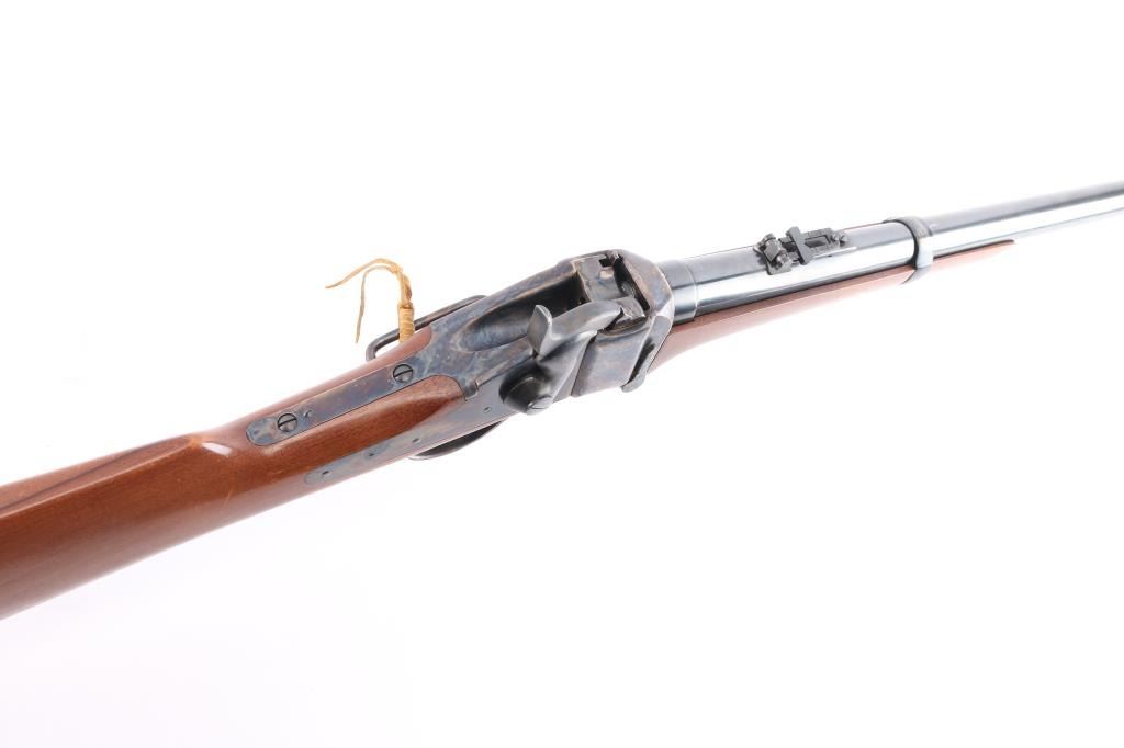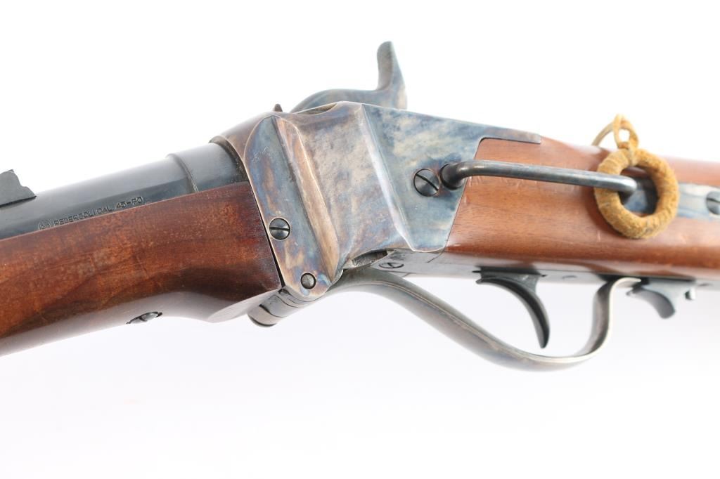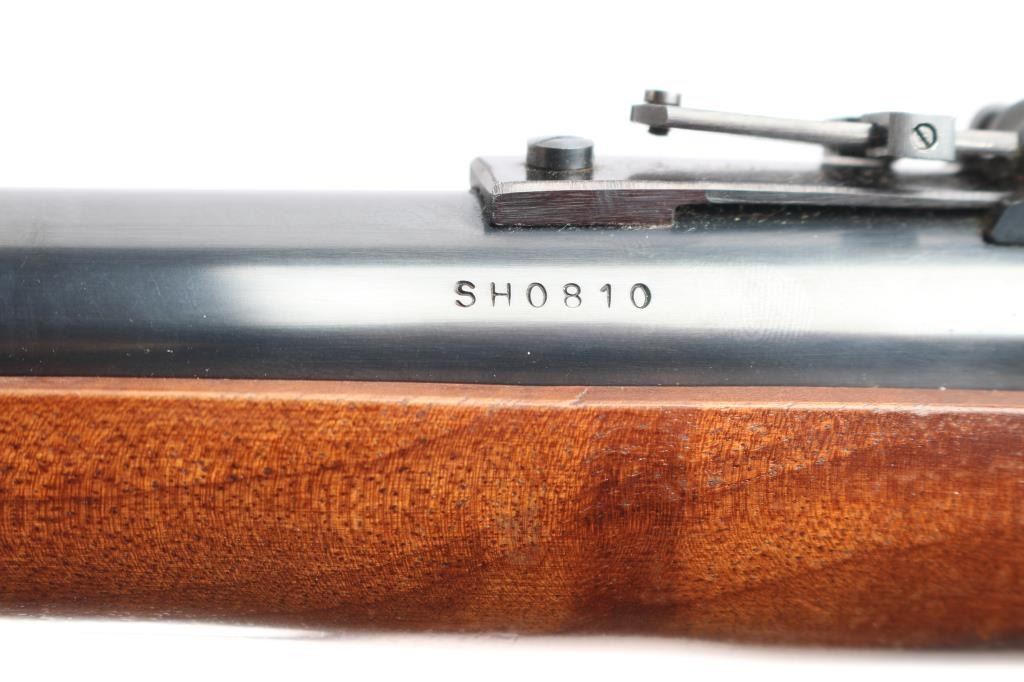 Italian reproduction of the Sharps Model 1874 falling block single shot rifle chambered in 45-70 Government, manufactured circa 1993. Importer mark not found. Featuring an approximately 22" blued heavy round barrel, blade front sight, folding ladder rear sight graduated to 800 yards (sight leaf broken on the bottom left side), smooth curved trigger, sliding safety on bottom tang, color-case hardened receiver, color-case hammer with checkered spur, saddle ring, color-case barrel band, smooth walnut forend, smooth straight grip shoulder stock, and smooth color-case metal buttplate. Rifle exhibits approximately 97% of it's original finish remaining showing losses on top of the barrel in front of the barrel band, and superficial edge wear and scratches. The color-case finish is excellent with very minor blemishes. The action is smooth and crisp. Bore is bright with strong rifling, and the wood furniture is very good with several small blemishes mostly on the buttstock. The rear sight is broken, but no parts are missing.
