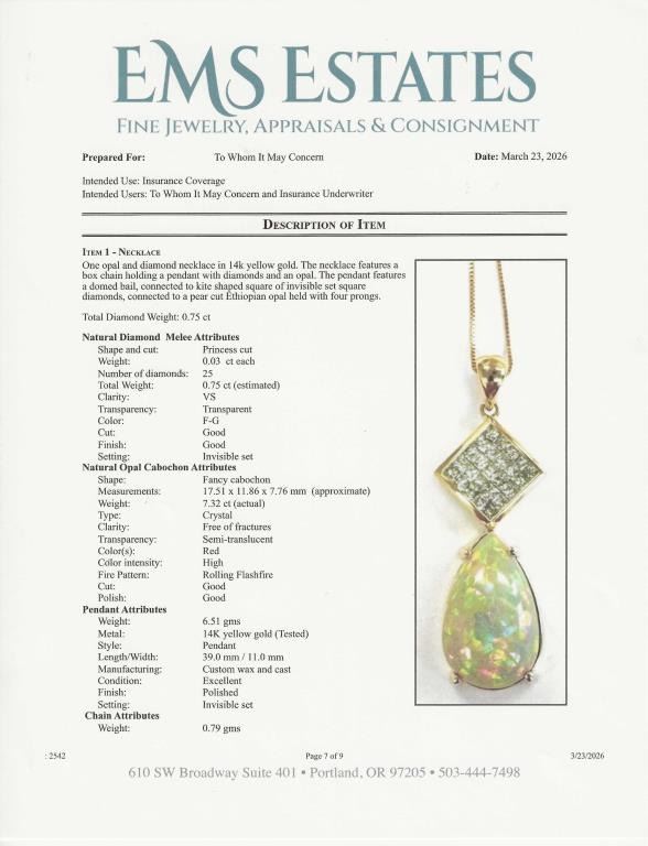 Featuring a pear shape Opal weighing 7.32 carats with spectacular color displays accented with 25 invisible set Princess cut Diamonds weighing approx. 0.75 carats with Fine F-G colors and VVS/VS clarity set in a 14 karat and 14 karat yellow gold custom made setting. Full Retail Appraised Value - $10,000.00.