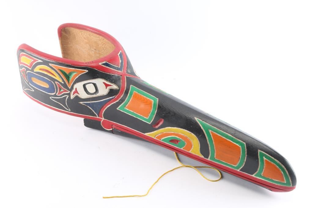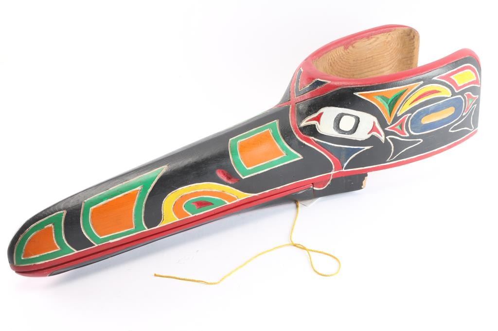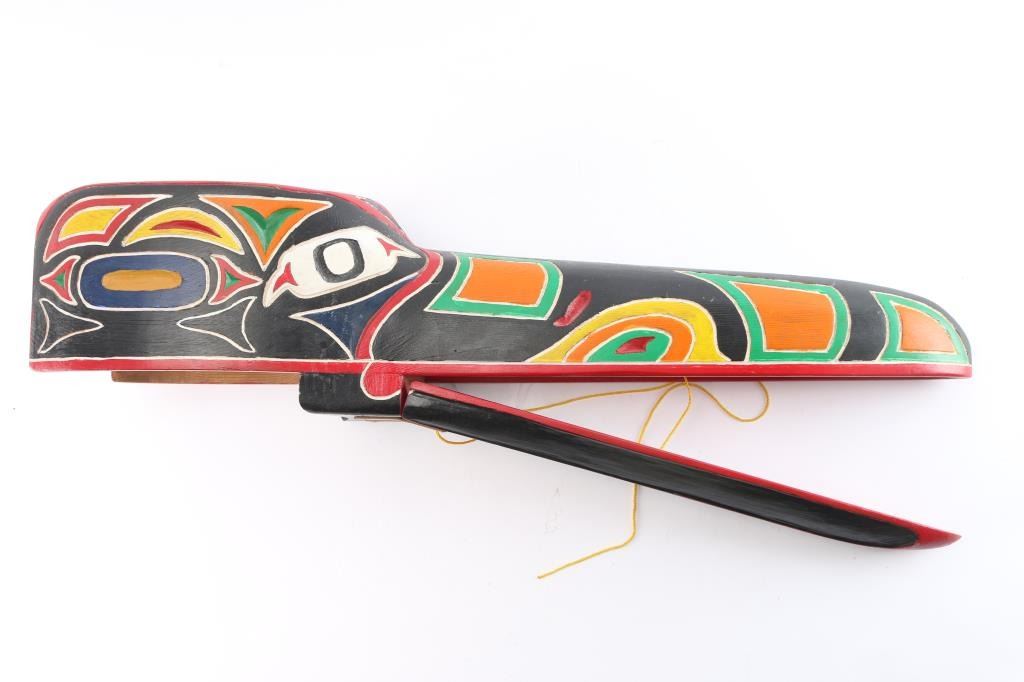 Articulated Carved Raven Colorful mask signed by Bill Evans, wood construction with painted design, measures 29"x7" Very good condition.