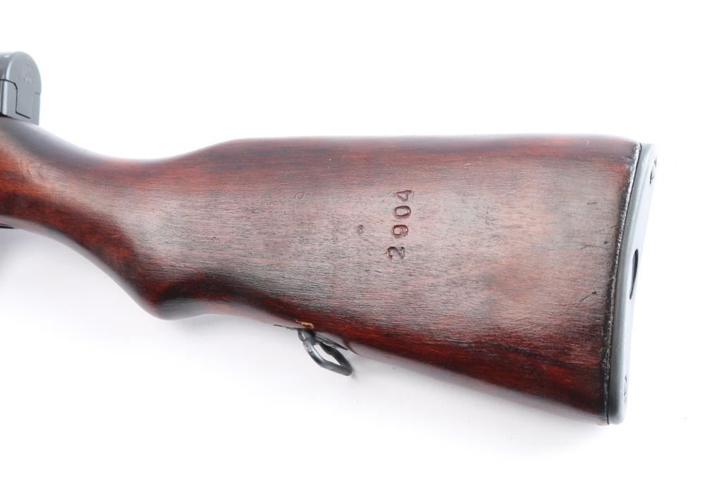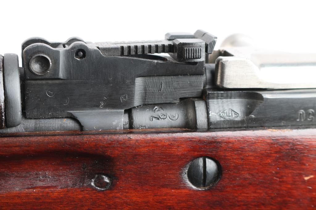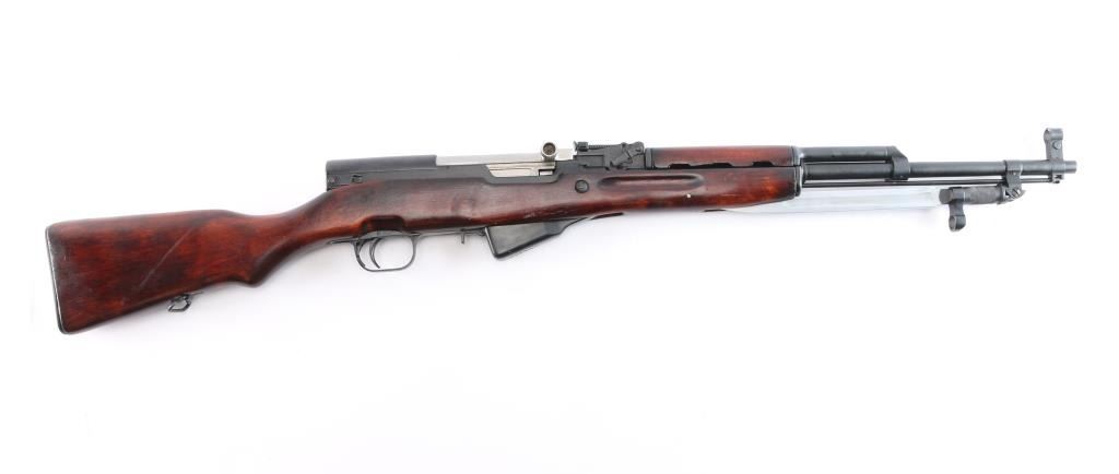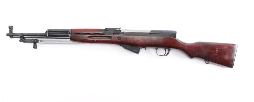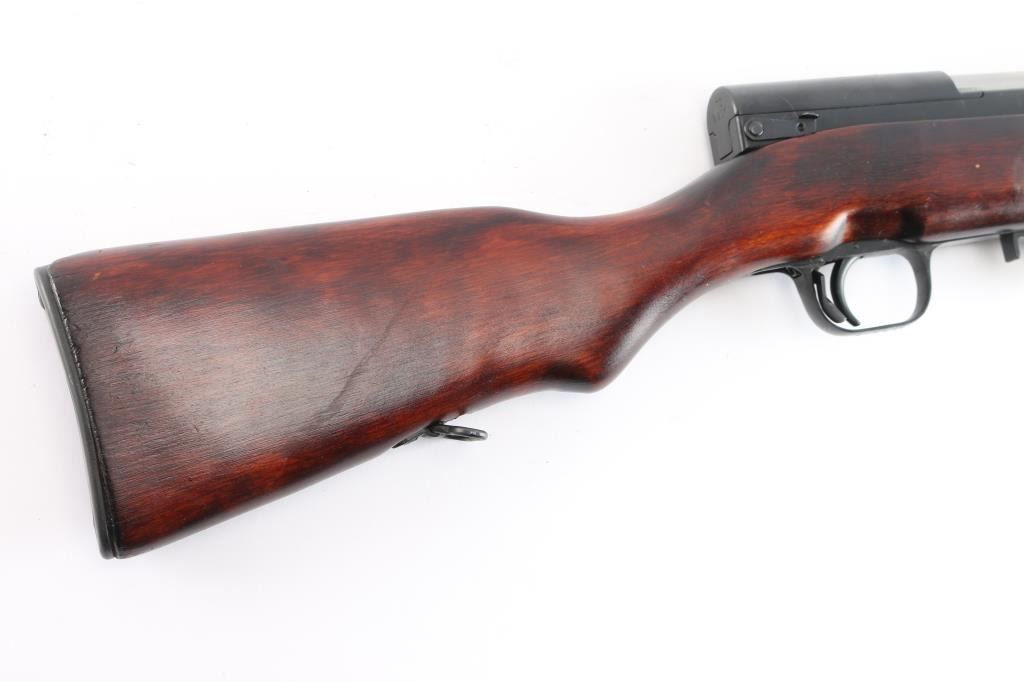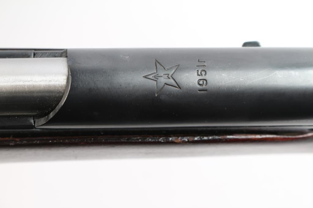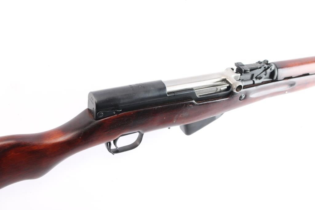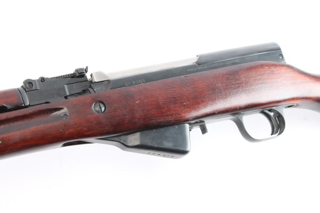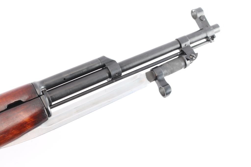 Cold war era Russian (Soviet Union, Tula arsenal, made 1951) semiautomatic rifle imported by KBI, Harrisburg PA. Features 20" hard chrome lined barrel, protected adjustable post front and tangent rear sights, cleaning rod and folding blade bayonet under barrel, fixed 10 round magazine with hinged floorplate, manual safety, hardwood stock with trap in butt for cleaning kit, sling swivels. Bore is excellent, bright. Metal retains about 95% blued finish (possible arsenal reblue) with minor scratches. Bayonet blade, bolt & carrier are dull silver (appears hard chromed). Stock is very good condition with minor scratches. Observed numbers match original Russian serial number, importer has added their serial number to left rear of receiver.