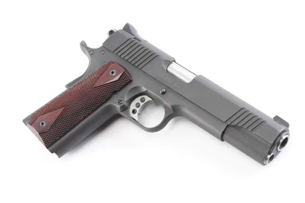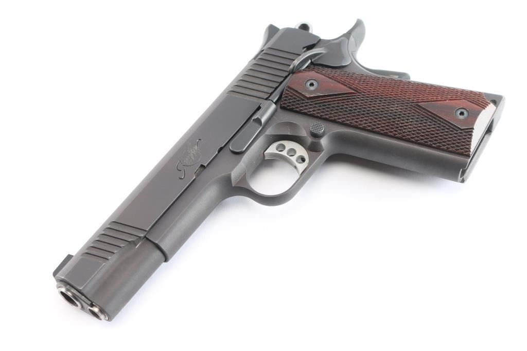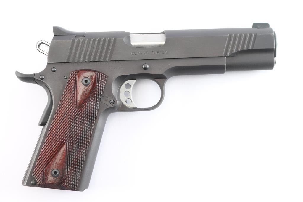 American made full-sized single-action semiautomatic pistol chambered for .45 Automatic Colt Pistol, manufactured circa 1997 (date marked on box) in Yonkers, NY. This "Classic Model" 1911 style pistol features a matte black finish, steel slide, steel frame, front and rear slide serrations, five-inch barrel, serrated blade front sight, serrated ramped square notched rear sight, single-piece full-length metal guide rod, skeletonized serrated curved adjustable trigger, checkered push-button magazine release, two-toned skeletonized hammer with in-the-white sides, serrated hammer spur, extended serrated manual safety mounted on the let side of the frame, smooth extended beavertail grip safety with a slight memory bump, checkered mainspring housing, smooth front strap, and two-piece checkered hardwood grips with diamond shapes around the screws. The original black finish retained is approximately 98% with slight edge wear, and light superficial scratches. Metal displays no rust or deformation. Bore is bright with strong rifling, and the wood grips are also excellent. The action is smooth and crisp. This pistol includes original factory black hard plastic box, operations manual, and barrel bushing wrench.
