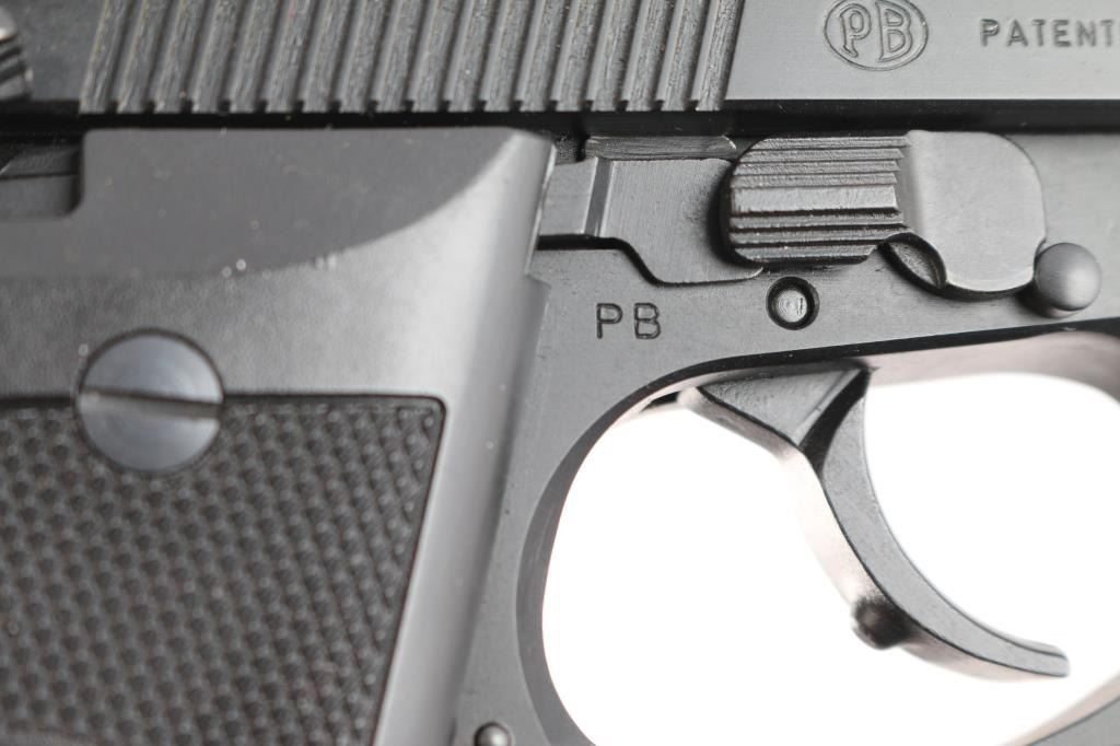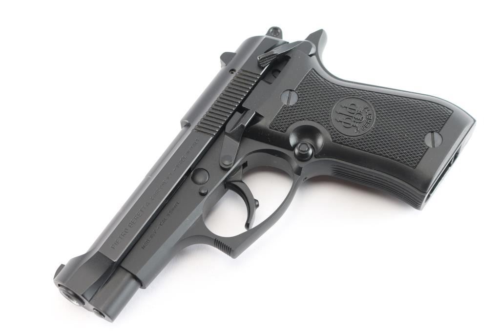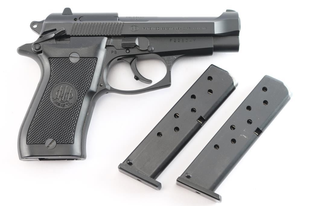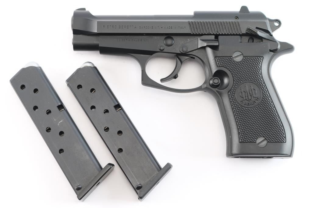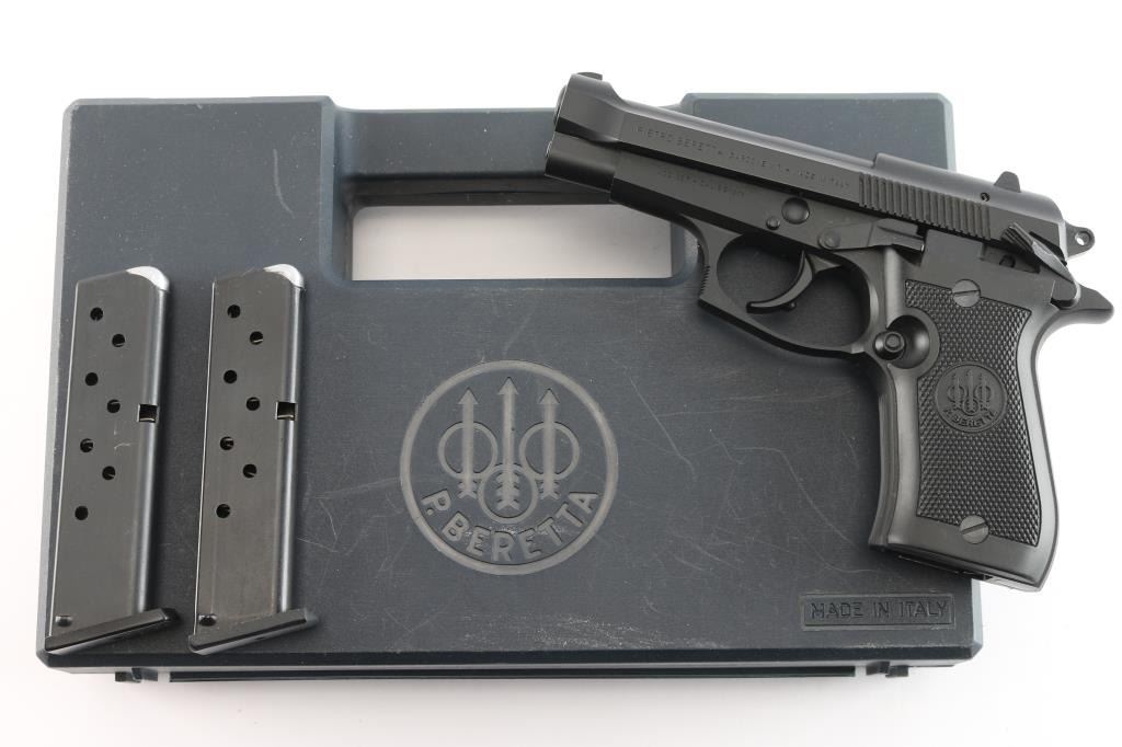 Italian made compact DA/SA semi-automatic blow-back pistol chambered for .380 Automatic Colt Pistol, manufactured circa 1992 ('BB' date code). This pistol features a matte black finish, 3-3/4" chromium plated barrel, fixed front blade sight with white dot, dovetailed notched rear sight (painted), external skeletonized hammer, serrated hammer spur, full length metal guide rod, 13-round magazine capacity, serrated curved combat trigger, serrated frame mounted manual safety/decocking lever, serrated trigger guard, serrated grip straps, and black two-piece checkered plastic grips with Beretta insignias. The frame is anodized aluminum, and the slide is of steel construction with a Bruniton proprietary finish. The original anodized matte finish retained is approximately 99% with nothing remarkable. The Bruniton finish is also excellent. Metal displays no rust or deformation. Action is smooth and crisp, and the grips are excellent. Bore is bright with strong rifling. Pistol is in like-new condition. Pistol includes original blue Beretta hard box, with two Beretta 13-round magazines total, cleaning rod, and manual.