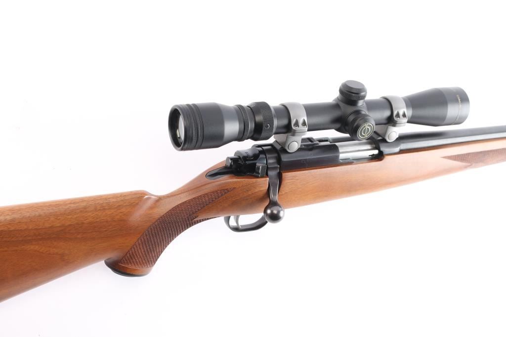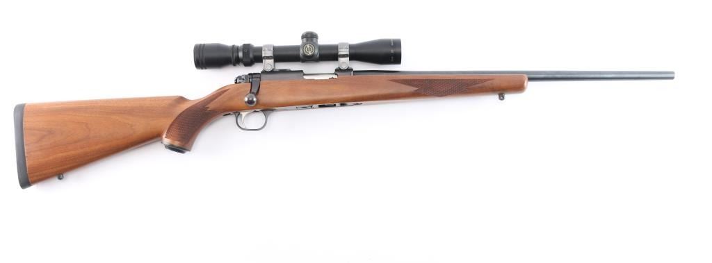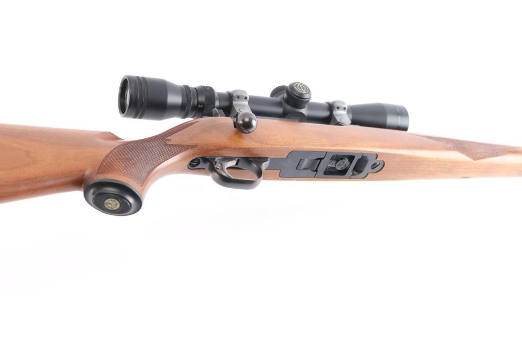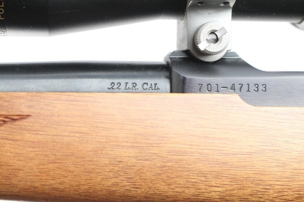American made bolt action rimfire rifle chambered in .22 Long Rifle, manufactured circa 1993 in Southport, CT. Featuring a blued finish, an approximately 20" tapered barrel, no iron sight provisions, integral scope base cuts in the receiver, detachable 10/22 style rotary magazine, serrated lever manual three-position safety, turned-down bolt handle, smooth curved trigger in-the-white, and in-the-white Mauser style bolt. The walnut furniture consists of a semi-pistol grip stock with checkering at the wrist, grip cap, checkering at the forend, sling stud in the forend, sling stud on the bottom of the buttstock, and a black rubber recoil pad. Bore condition is bright with strong rifling, and the action is smooth and crisp. The rifle retains approximately 99% of its original bluing with little remarkable to speak of. Wood condition is excellent with only a couple of superficial blemishes with one on the corner of the stock by the magazine well, and some marks on the grip cap. The rifle comes topped with a very good condition Simmons 3-9x32mm fully coated .22 Magnum scope with a duplex reticle, and the sight picture is clear. This rifle is in 'Like-New' condition.
