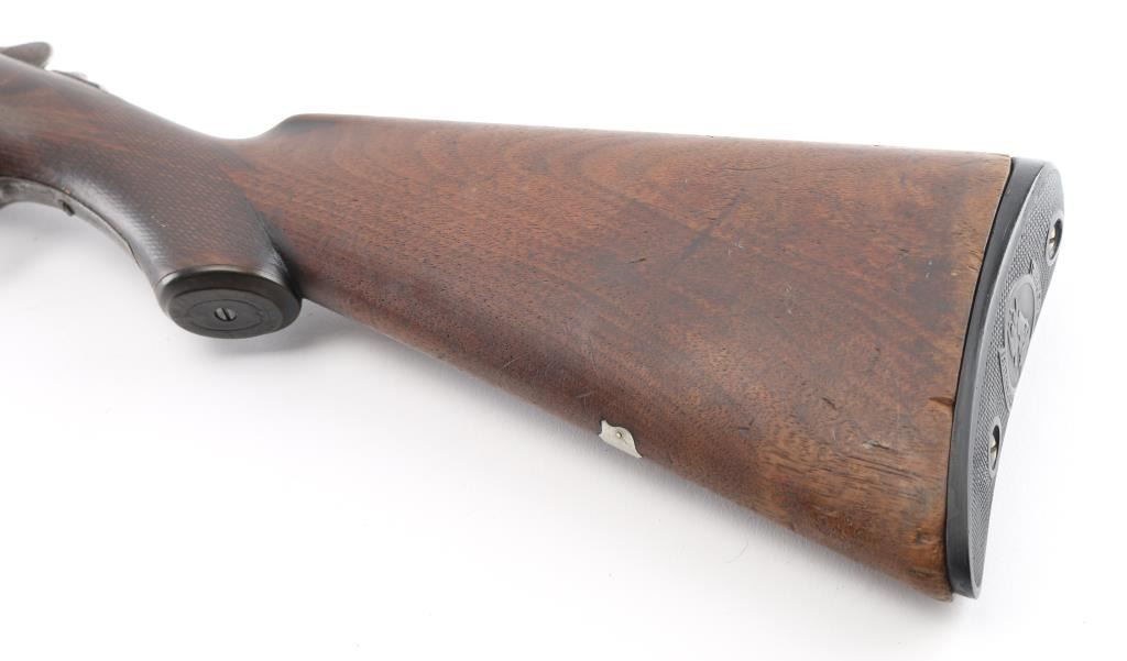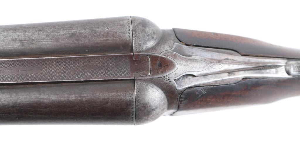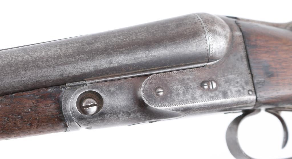 American made side-by-side shotgun, "V" grade, #2 size, manufactured circa 1905, side by side, approximately 30" barrels, bores are dull and scratched, bore condition might improve with cleaning, bead front sight, hammerless, checkered barrel release lever, checkered tang-mounted safety, smooth triggers, engraving around the edges of the barrel breech ends and the receiver, wood stocks, pistol grip, grip cap, checkering on the forend and grip is visible but worn smooth, smooth shield-shape piece of metal is on the bottom of the stock, wood is darkened with age and use, stocks have scratches and pitting, buttplate is marked "Parker Brothers" and includes a depiction of a dog carrying a bird, actions are crisp, remaining finish is approximately 40-50%, serial numbers on barrel and receiver match, front LOP is approximately 13 3/4", rear LOP is approximately 13".
