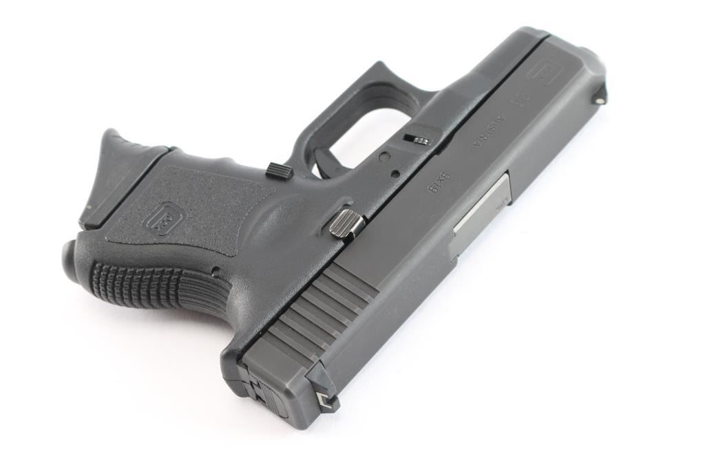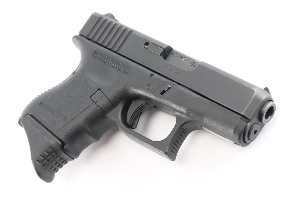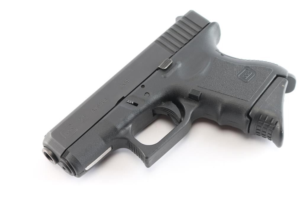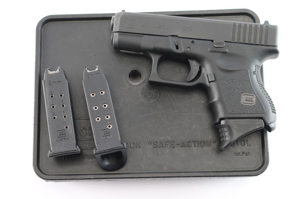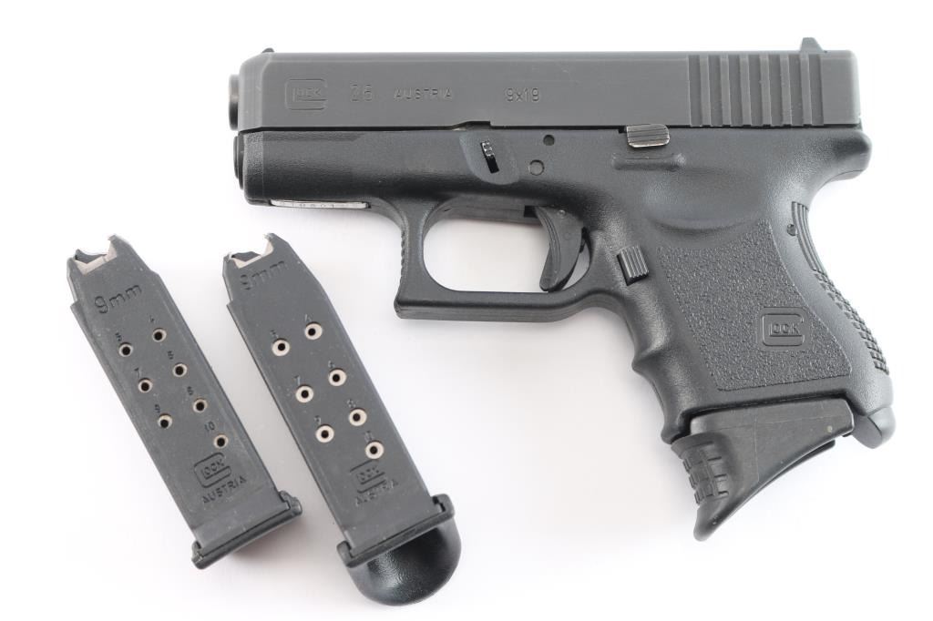Austrian made 'Short Frame' sub-compact safe-action striker fired semi-automatic pistol chambered for 9x19mm ammunition, and imported by Glock out of Smyrna, GA. The Glock 26 was introduced in 1995, and this example is a second generation model. Pistol features a black finished slide, a 3.3" polygonal rifled barrel, fixed front sight with a white dot, dovetailed rear sight with a white outline, metal guide rod with dual recoil springs, serrated curved trigger, passive blade trigger safety, serrated push-button magazine release, ten-round magazines, undercut trigger guard with serrations on the front, grip plug, bull-nosed slide, and black textured polymer frame with finger grooved front strap. The original blued finish retained is approximately 97% with light edge wear, and superficial scratches. Metal displays no rust or deformation. Action is smooth and crisp, and the frame polymer is also excellent. The bore is bright with strong polygonal rifling. Pistol includes the original black factory hard case with three magazines total, and an extra floorplate.