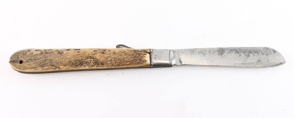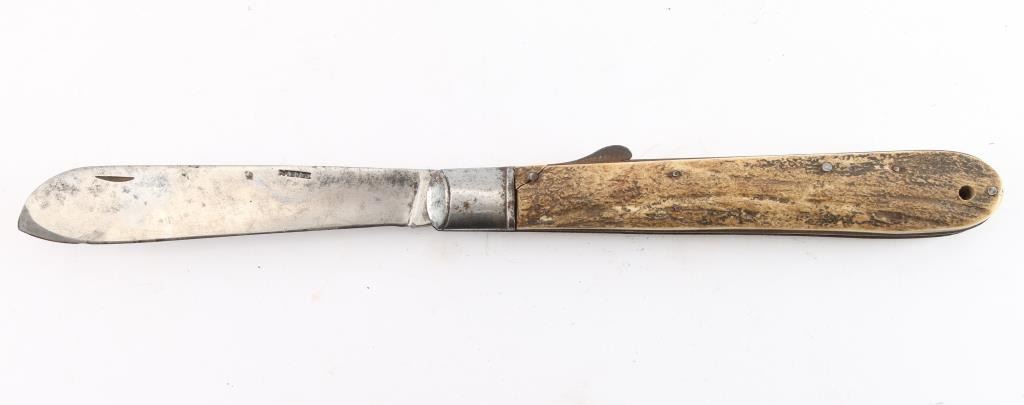 A huge vintage lock blade cotton sampler knife. Historic tool designed for cotton buyers, featuring a distinct, sturdy blade, 5 3/4" shaped like a scalpel with a thick spine, used for inspecting cotton bolls or sampling bales. Overall length is 13 1/2". Stag grip panels riveted to frame. The blade is stamped but we can't make it out. The blade displays some patches of light patina, shows evidence of light sharpening, but old, period done. The stag grips are good overall with a small chip and crack at the top of both panels. The blade is solid when extended. We estimate this cotton sampler knife, originating in the 19th-century American South, dates from the late 18th to the early 19th century.