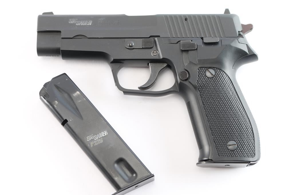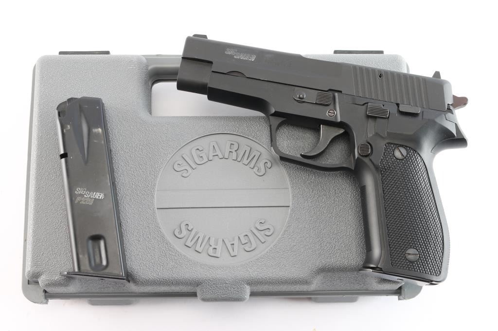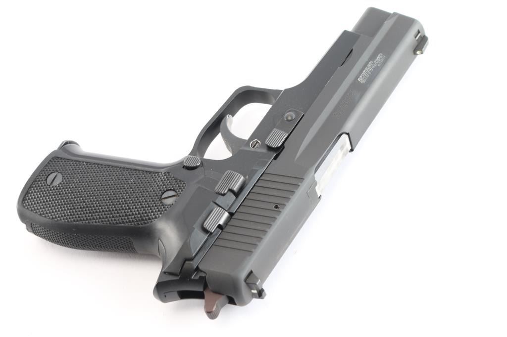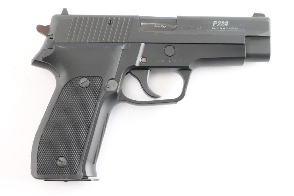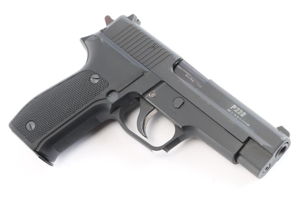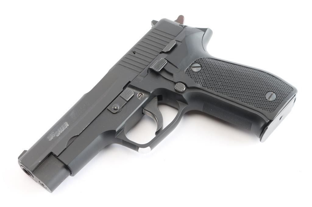 'Made in W Germany' Semiautomatic pistol, imported by SIGARMS Inc., Herndon, VA. Features matte black alloy frame, matte dark gray slide, 4.25" barrel, white dot front & white bar rear sights in dovetails, frame mounted decocking lever, double/single action, pushbutton magazine release, combat triggerguard, black checkered polymer grips. Bore is excellent/bright. Retains 97% finish with some minor scuffs/edge wear. Grips are very good. Includes factory hard case, manual, spare 15 rd factory magazine (2 total).