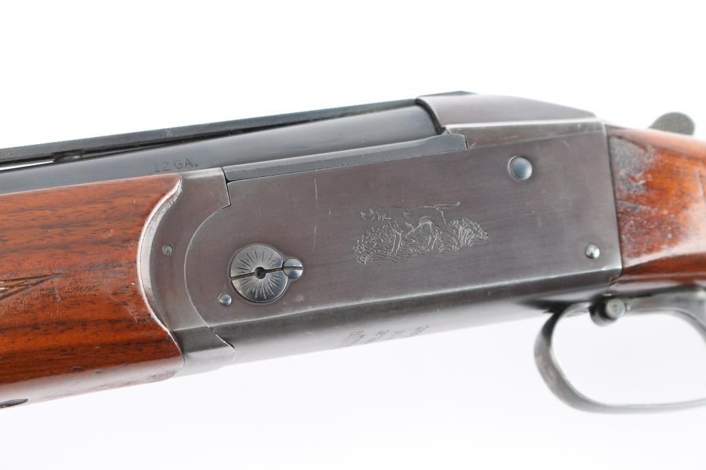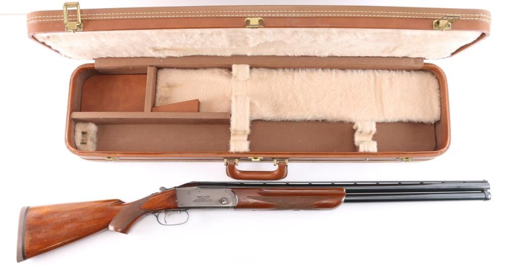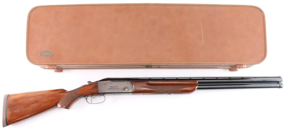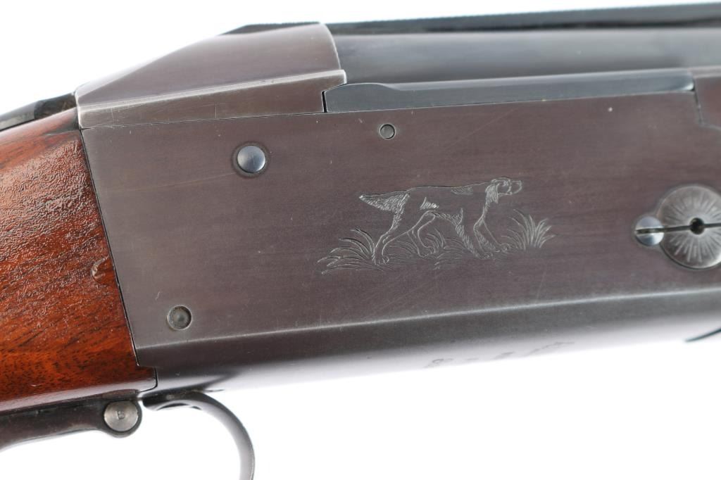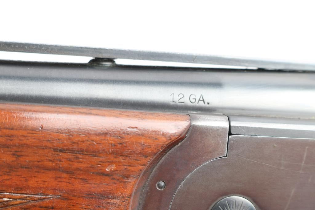 High quality American made over & under shotgun chambered for 2 3/4" 12 Gauge shells. Manufactured from 1932 to 1947, with Remington selling roughly 5000-6000 Model 32s. Featuring a blued finish, 26 1/8" barrels with Simmons ventilated rib, fixed chokes measuring Cylinder / Negative with a drop-in gauge, single smooth curved trigger, cross bolt type button barrel selector in front of the trigger, sliding tang safety, selective ejectors, white Bradley bead front sight, and white mid-bead. The walnut furniture consists of a semi-pistol grip shoulder stock with checkering at the wrist, checkered and grooved forend with serrated deeley latch release, and solid brown rubber recoil pad with black spacer. Length-of-pull measures 13.5" with a 1-1/2" drop at comb, and a 2-1/4" drop at the heel. Receiver displays limited coverage of a roll stamped hunting dog scene on both sides. Receiver, barrels, and forend have matching serial numbers, '4150'. Bores are good condition, but look dirty. The blued finish retained is approximately 80-85% with the barrels refinished showing scattered scratches and wear/thinned finish on the receiver which has turned plum. Furniture hardwood is in good condition with scattered minor scratches, dings, and the finish was not professionally applied/refinished. Action opens easily with solid lock-up and the top lever resting far right of center. This shotgun includes a brown Browning faux leather hard case.