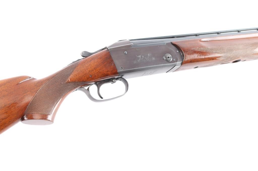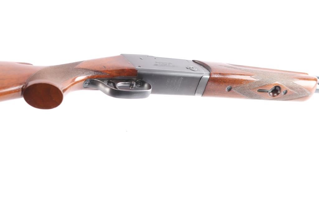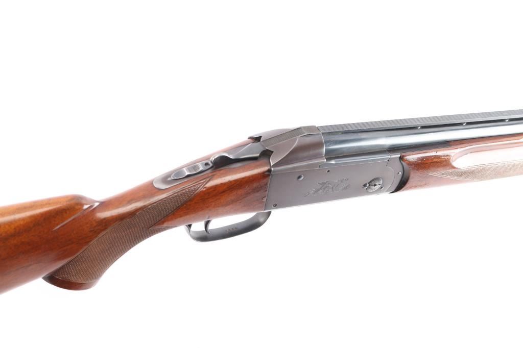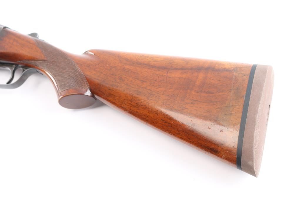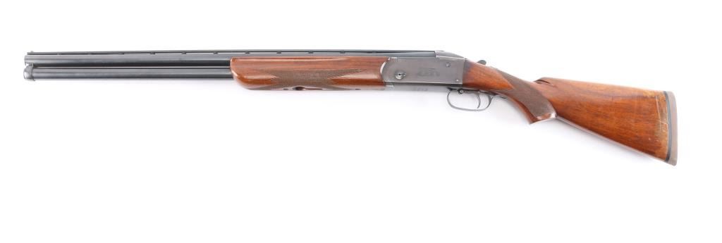 High quality American made over & under shotgun chambered for 2 3/4" 12 Gauge shells. Manufactured from 1932 to 1947, with Remington selling roughly 5000-6000 Model 32s. Featuring a blued finish, 26 1/8" barrels with Simmons ventilated rib, fixed chokes measuring Cylinder / Negative with a drop-in gauge, single smooth curved trigger, cross bolt type button barrel selector in front of the trigger, sliding tang safety, selective ejectors, white Bradley bead front sight, and white mid-bead. The walnut furniture consists of a semi-pistol grip shoulder stock with checkering at the wrist, checkered and grooved forend with serrated deeley latch release, and solid brown rubber recoil pad with black spacer. Length-of-pull measures 13.5" with a 1-1/2" drop at comb, and a 2-1/4" drop at the heel. Receiver displays limited coverage of a roll stamped hunting dog scene on both sides. Receiver, barrels, and forend have matching serial numbers, '4150'. Bores are good condition, but look dirty. The blued finish retained is approximately 80-85% with the barrels refinished showing scattered scratches and wear/thinned finish on the receiver which has turned plum. Furniture hardwood is in good condition with scattered minor scratches, dings, and the finish was not professionally applied/refinished. Action opens easily with solid lock-up and the top lever resting far right of center. This shotgun includes a brown Browning faux leather hard case.