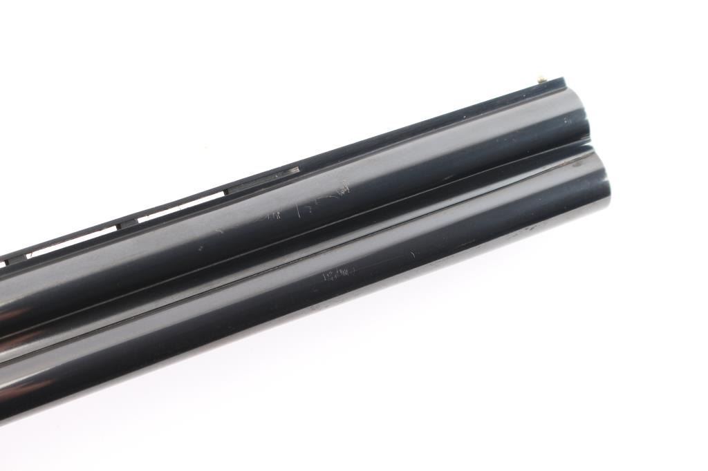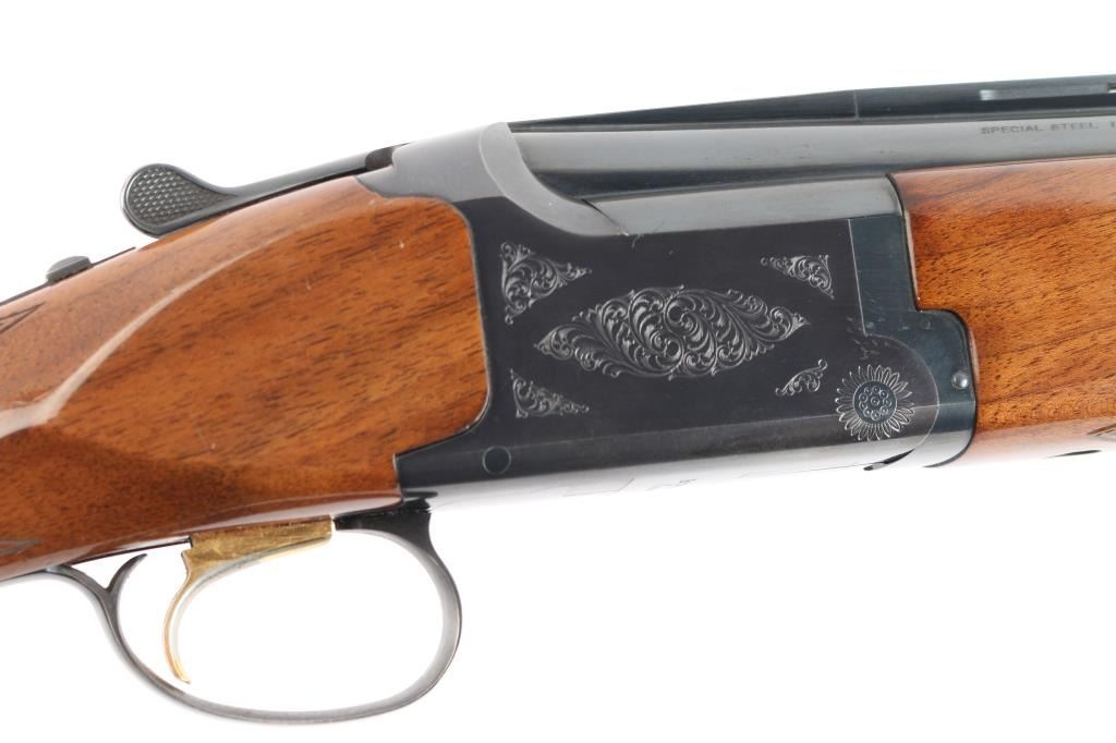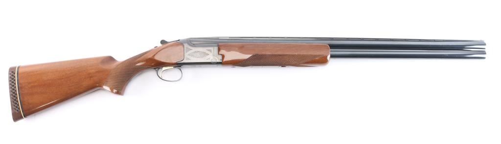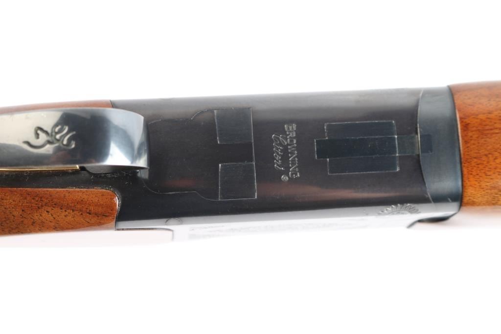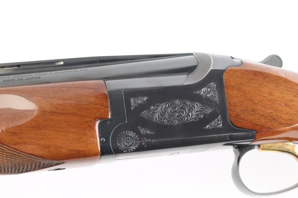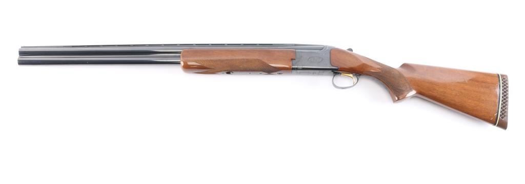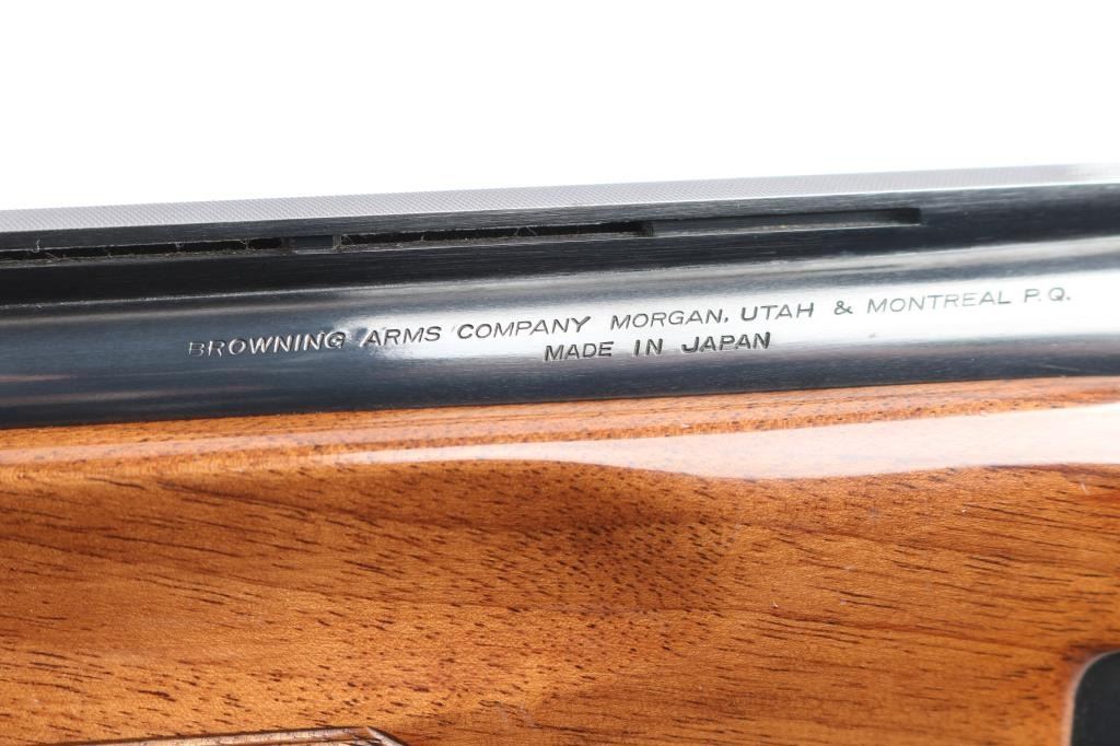 Japanese made over and under box-lock shotgun chambered for 3" 12 Gauge shells, manufactured circa 1985. Shotgun imported by Browning Arms Company out of Morgan, UT. and Montreal P.Q. Featuring a gloss blued finish, 28" raised ventilated ribbed barrels, accepts Invector choke tubes with Full / Mod installed, steel bead front sight, selective ejectors, single curved smooth gold-toned inertia trigger, checkered top lever, and serrated sliding tang safety and barrel selector. The high gloss walnut furniture consists of a semi-pistol grip shoulder stock with checkering at the wrist, grooved and checkered forend with deeley latch release, long lower tang, 14-1/4" length-of-pull, 1-9/16" drop at comb, 2-7/16" drop at heel, and a brown Browning ventilated rubber recoil pad. The receiver displays limited coverage floral scrolls, and edge designs. The engraving extends to the trigger guard with a gold Browning insignia. Receiver, forend, and barrels all have matching serial numbers, '02771.' The original blued finish remaining is approximately 95% with light scattered scratches, some minor edge wear, contact wear from the safety selector and a very amount of light surface rust found inside the triggerguard & a coupler spots on the barrels. Bores look excellent and bright, and the action is tight with the top lever resting right of center. Furniture wood is good to very good with a couple moderate blemishes. This shotgun could be Very Good without the observed rust.
