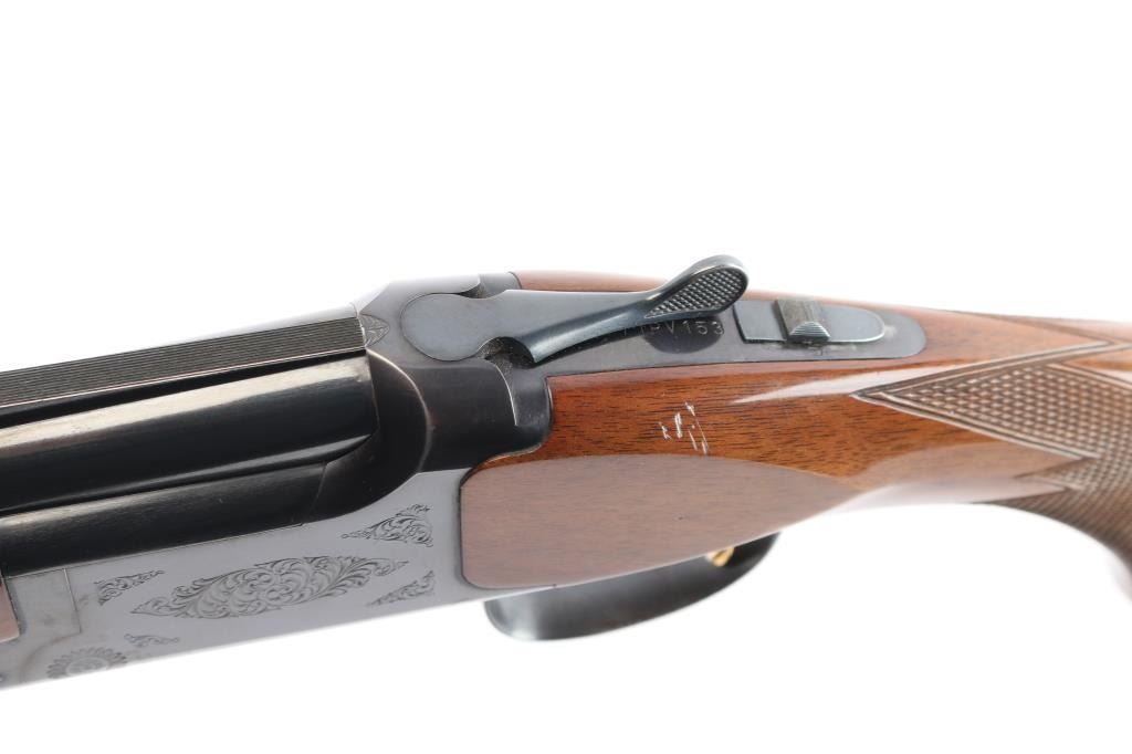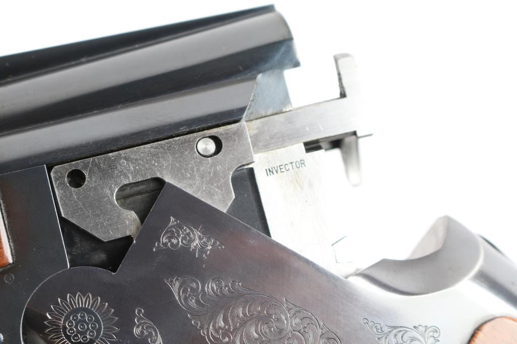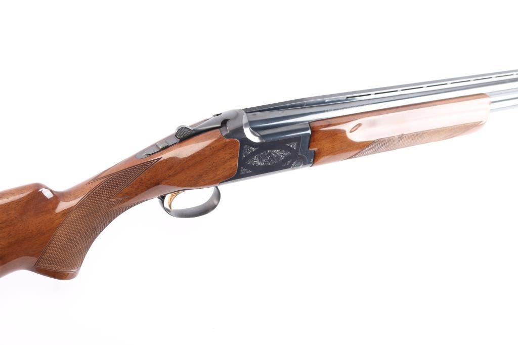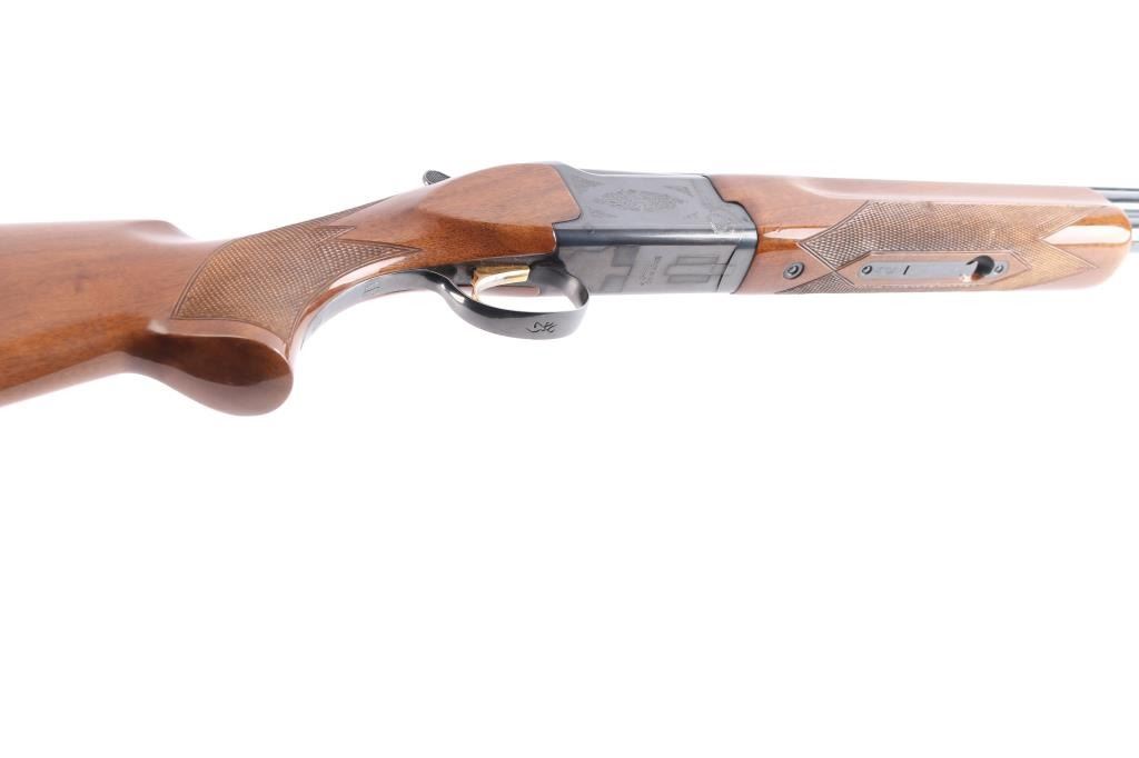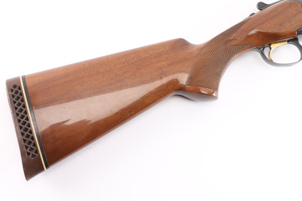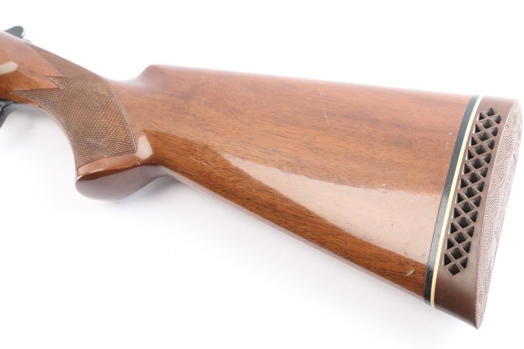 Japanese made over and under box-lock shotgun chambered for 3" 12 Gauge shells, manufactured circa 1985. Shotgun imported by Browning Arms Company out of Morgan, UT. and Montreal P.Q. Featuring a gloss blued finish, 28" raised ventilated ribbed barrels, accepts Invector choke tubes with Full / Mod installed, steel bead front sight, selective ejectors, single curved smooth gold-toned inertia trigger, checkered top lever, and serrated sliding tang safety and barrel selector. The high gloss walnut furniture consists of a semi-pistol grip shoulder stock with checkering at the wrist, grooved and checkered forend with deeley latch release, long lower tang, 14-1/4" length-of-pull, 1-9/16" drop at comb, 2-7/16" drop at heel, and a brown Browning ventilated rubber recoil pad. The receiver displays limited coverage floral scrolls, and edge designs. The engraving extends to the trigger guard with a gold Browning insignia. Receiver, forend, and barrels all have matching serial numbers, '02771.' The original blued finish remaining is approximately 95% with light scattered scratches, some minor edge wear, contact wear from the safety selector and a very amount of light surface rust found inside the triggerguard & a coupler spots on the barrels. Bores look excellent and bright, and the action is tight with the top lever resting right of center. Furniture wood is good to very good with a couple moderate blemishes. This shotgun could be Very Good without the observed rust.