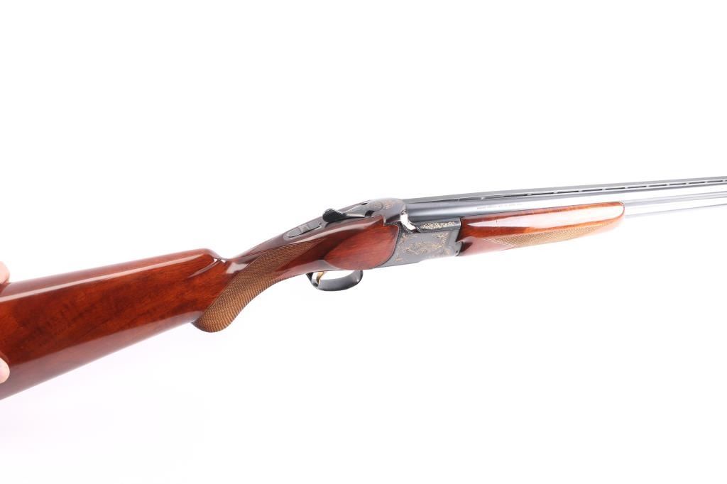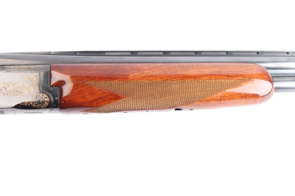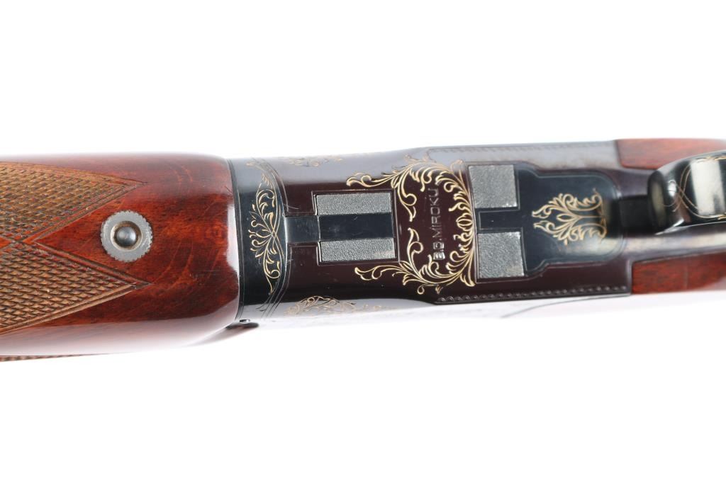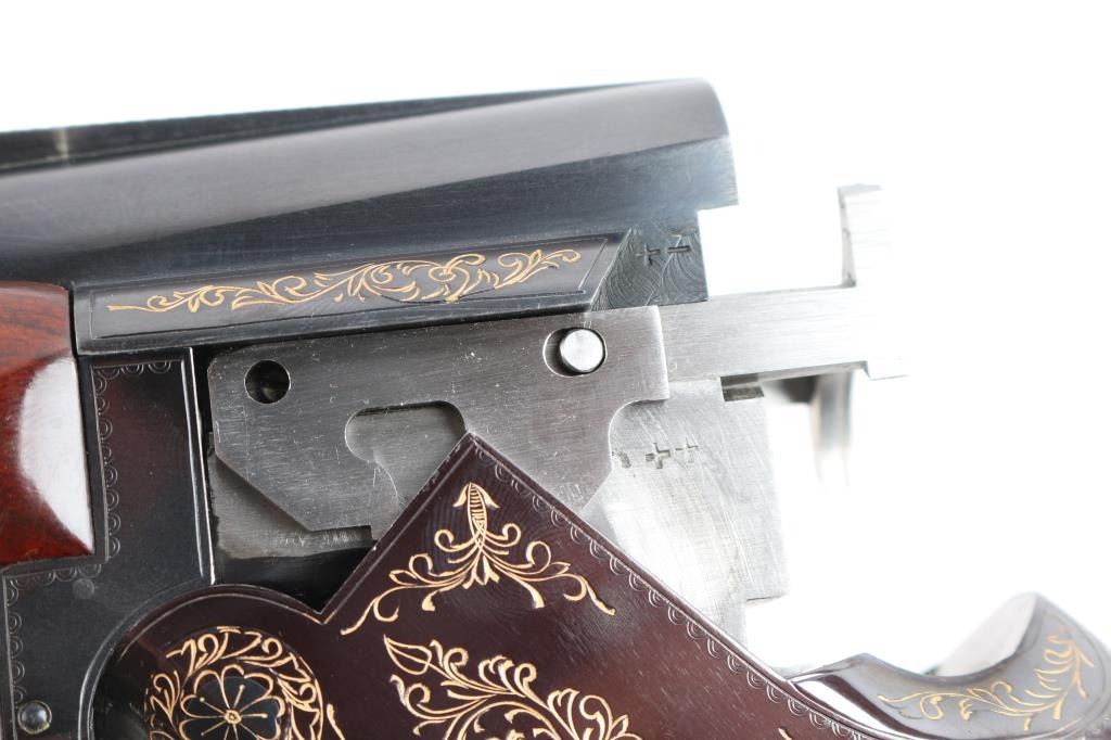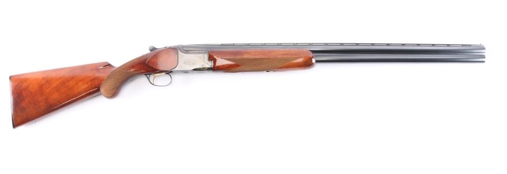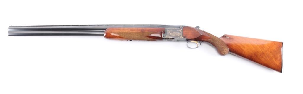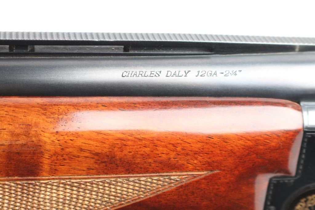 Japanese made over and under box-lock shotgun chambered for 2 3/4" 12 Gauge shells. Miroku made Charles Daly shotguns from the late 1960s to the early 1970s. Field grade shotgun, featuring a blued finish, 28" ventilated ribbed barrels, fixed chokes marked for Mod / Skeet, steel bead front sight, selective ejectors, single curved smooth gold-toned inertial trigger, checkered top lever, and serrated sliding tang safety and barrel selector. The gloss finished walnut furniture consists of a round knob shoulder stock with checkering at the wrist, checkered forend with deeley latch release, long lower tang, 14" length-of-pull, 1-3/8" drop at comb, 2-3/8" drop at heel, and a black plastic B.C. Miroku buttplate. The receiver displays limited coverage of gold color filled floral scrolls, and edge designs. The engraving extends to many of the small parts including the top lever, trigger guard, sides of the top barrel, and on the forend parts. Receiver, forend, and barrels all have matching serial numbers, '392097.' The original blued finish remaining is approximately 98% with superficial scratches, and light edge wear at the muzzle and triggerguard. Bores look excellent and bright, and the action is tight with the top lever resting far right of center. Furniture wood is excellent with only a few scattered nicks and dings, where most are on the buttstock. The metal shows no rust or deformation.