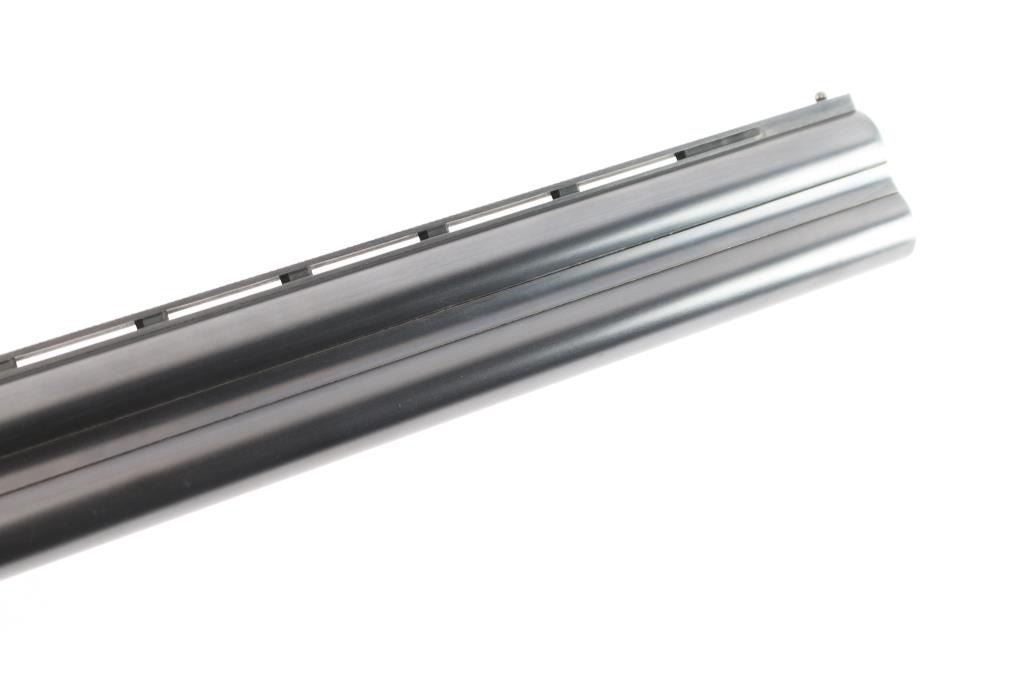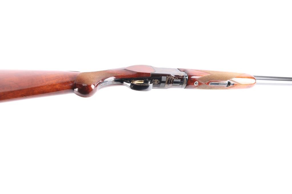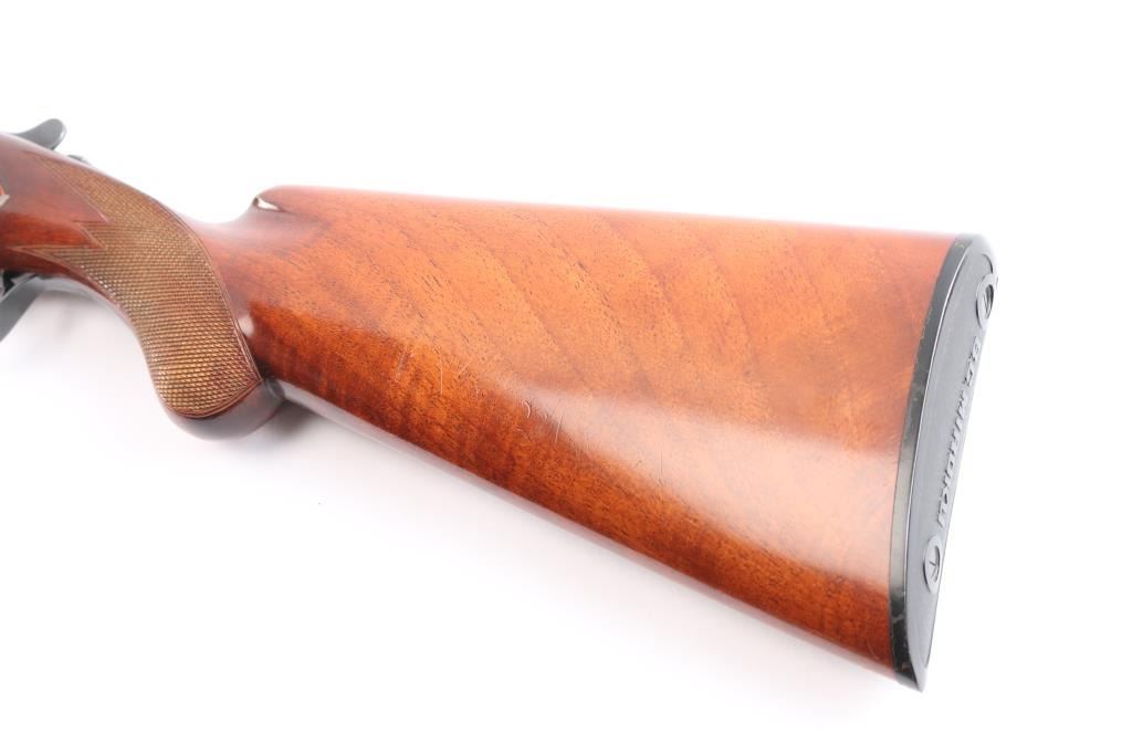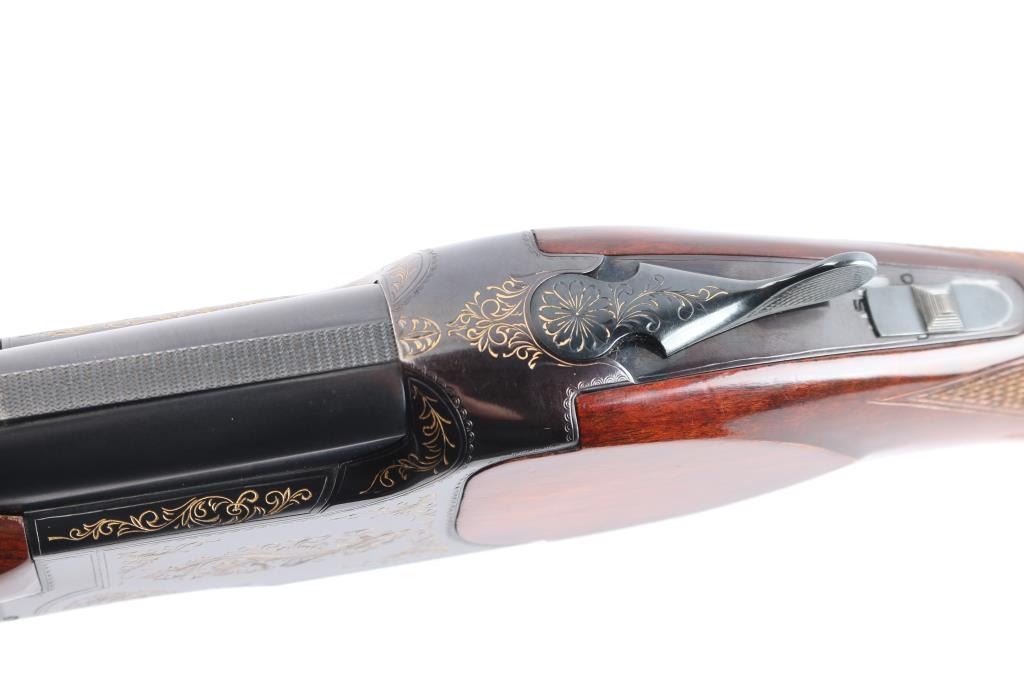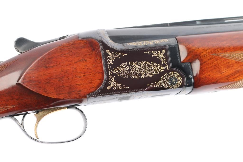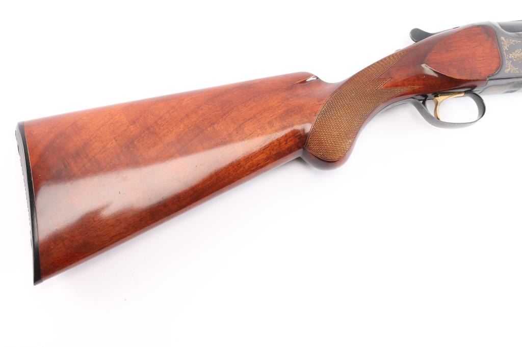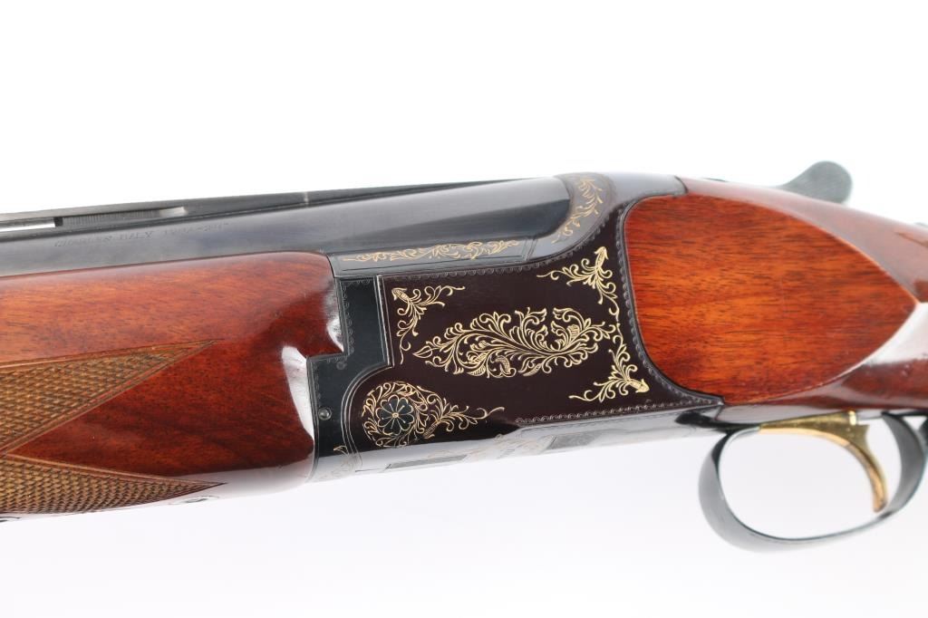 Japanese made over and under box-lock shotgun chambered for 2 3/4" 12 Gauge shells. Miroku made Charles Daly shotguns from the late 1960s to the early 1970s. Field grade shotgun, featuring a blued finish, 28" ventilated ribbed barrels, fixed chokes marked for Mod / Skeet, steel bead front sight, selective ejectors, single curved smooth gold-toned inertial trigger, checkered top lever, and serrated sliding tang safety and barrel selector. The gloss finished walnut furniture consists of a round knob shoulder stock with checkering at the wrist, checkered forend with deeley latch release, long lower tang, 14" length-of-pull, 1-3/8" drop at comb, 2-3/8" drop at heel, and a black plastic B.C. Miroku buttplate. The receiver displays limited coverage of gold color filled floral scrolls, and edge designs. The engraving extends to many of the small parts including the top lever, trigger guard, sides of the top barrel, and on the forend parts. Receiver, forend, and barrels all have matching serial numbers, '392097.' The original blued finish remaining is approximately 98% with superficial scratches, and light edge wear at the muzzle and triggerguard. Bores look excellent and bright, and the action is tight with the top lever resting far right of center. Furniture wood is excellent with only a few scattered nicks and dings, where most are on the buttstock. The metal shows no rust or deformation.