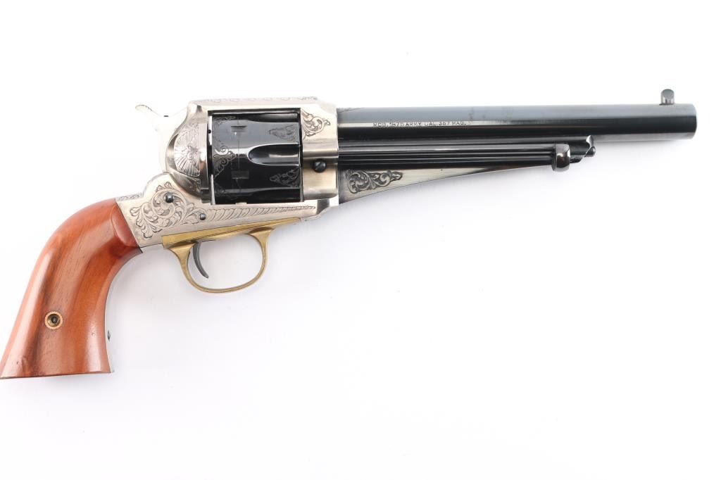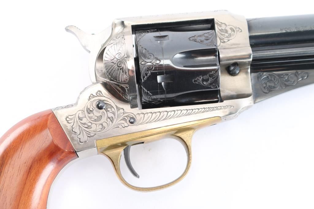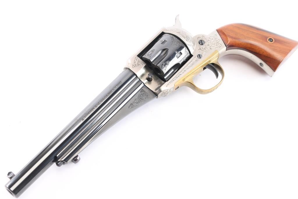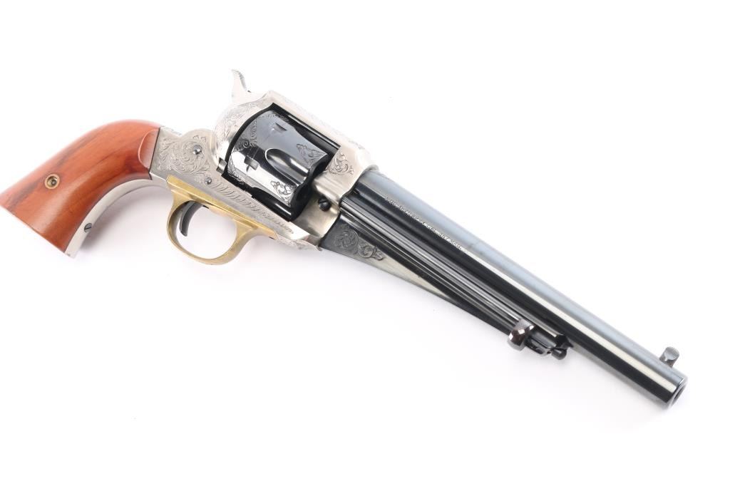 Italian made reproduction of the Remington 1875 Single Action Army revolver, chambered in .357 Magnum, manufactured in Italy by Uberti. Imported by Early Modern Firearms Co. (E.M.F.) of Los Angeles, CA with the import markings on top of the barrel. Pistol features a 7-1/2" round barrel, fixed post/blade front sight, square notched frame rear sight, smooth curved wide trigger, two-toned hammer with firing pin on nose, checkered hammer spur, fluted six-round cylinder, ejector rod with webbed housing, and two-piece vanished smooth wood grips. Revolver presents a blued barrel, trigger, cylinder, portions of the hammer, and the frame and grip straps have a nickel finish. All of the metal parts except for the hammer and trigger have limited coverage of floral scrolls. Revolver exhibits approximately 96% of it's original blued finish with scattered light scratches, scratches on the ejector rod, and a light drag lines on the cylinder. The nickel finish on the frame is excellent with only superficial scratches. Metal displays no rust or deformation. Action is smooth and crisp with a very good lock-up. The wood grips are excellent with a small blemish on the bottom of the right grip panel, and a very light dent on the bottom of the left grip panel. The bore is bright with strong rifling, and the cylinder chambers are also excellent. Although, the pistol needs to be cleaned.