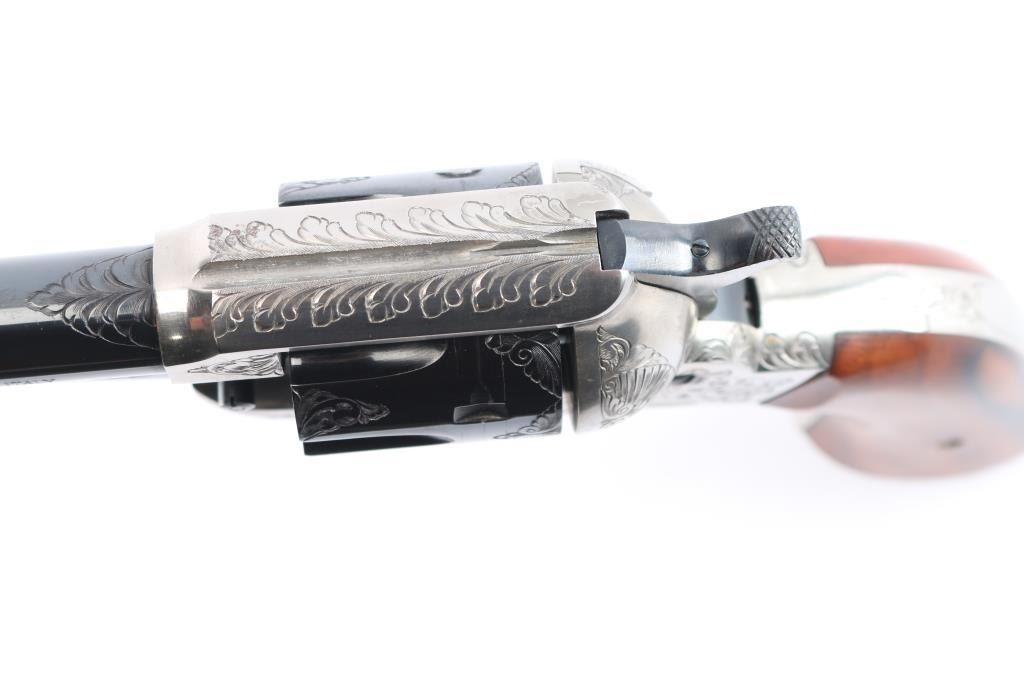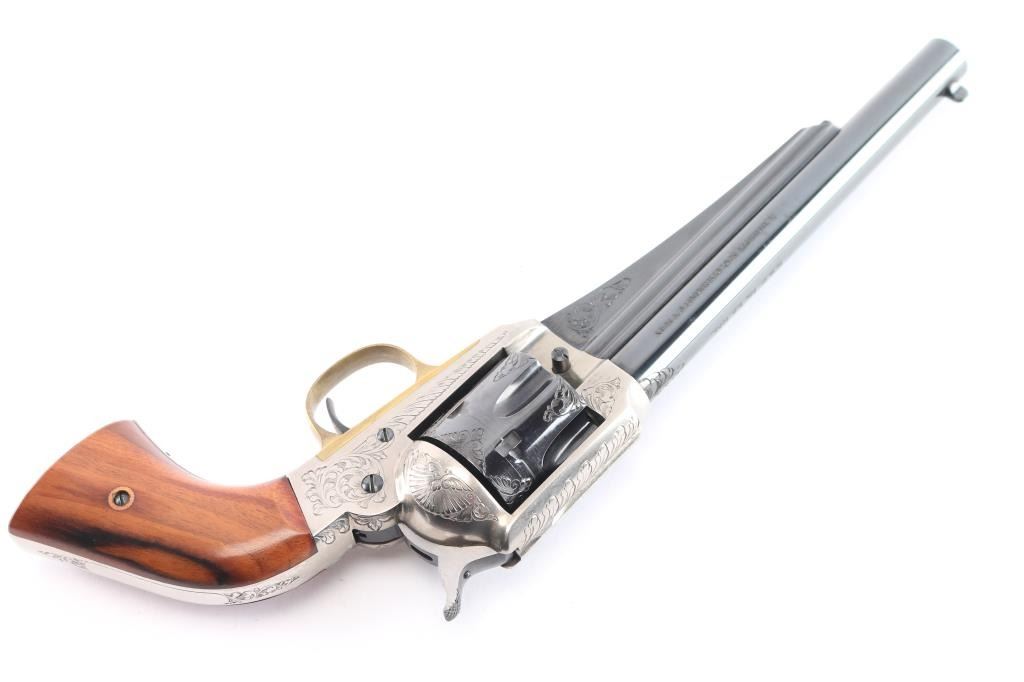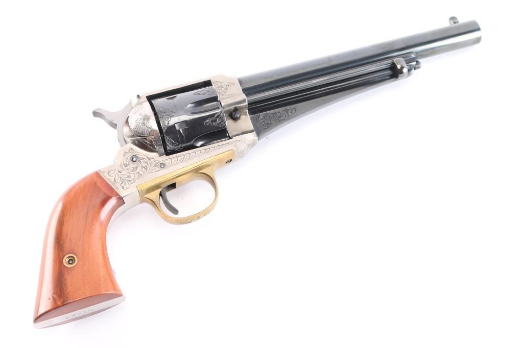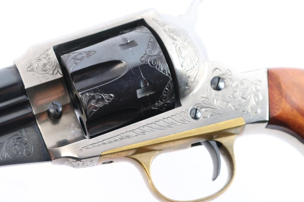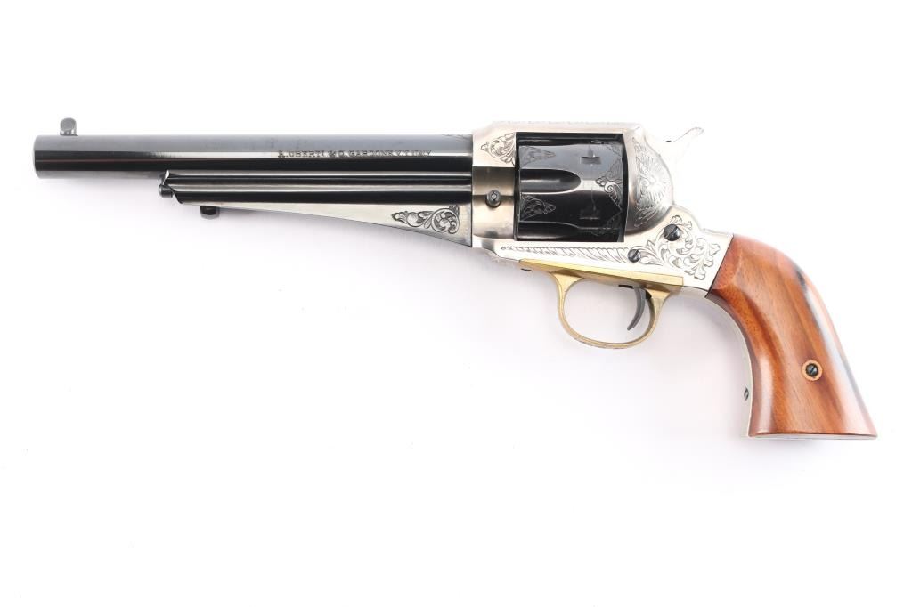 Italian made reproduction of the Remington 1875 Single Action Army revolver, chambered in .357 Magnum, manufactured in Italy by Uberti. Imported by Early Modern Firearms Co. (E.M.F.) of Los Angeles, CA with the import markings on top of the barrel. Pistol features a 7-1/2" round barrel, fixed post/blade front sight, square notched frame rear sight, smooth curved wide trigger, two-toned hammer with firing pin on nose, checkered hammer spur, fluted six-round cylinder, ejector rod with webbed housing, and two-piece vanished smooth wood grips. Revolver presents a blued barrel, trigger, cylinder, portions of the hammer, and the frame and grip straps have a nickel finish. All of the metal parts except for the hammer and trigger have limited coverage of floral scrolls. Revolver exhibits approximately 96% of it's original blued finish with scattered light scratches, scratches on the ejector rod, and a light drag lines on the cylinder. The nickel finish on the frame is excellent with only superficial scratches. Metal displays no rust or deformation. Action is smooth and crisp with a very good lock-up. The wood grips are excellent with a small blemish on the bottom of the right grip panel, and a very light dent on the bottom of the left grip panel. The bore is bright with strong rifling, and the cylinder chambers are also excellent. Although, the pistol needs to be cleaned.