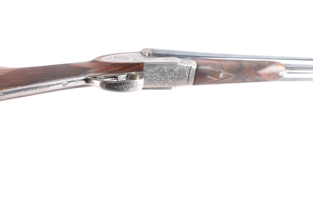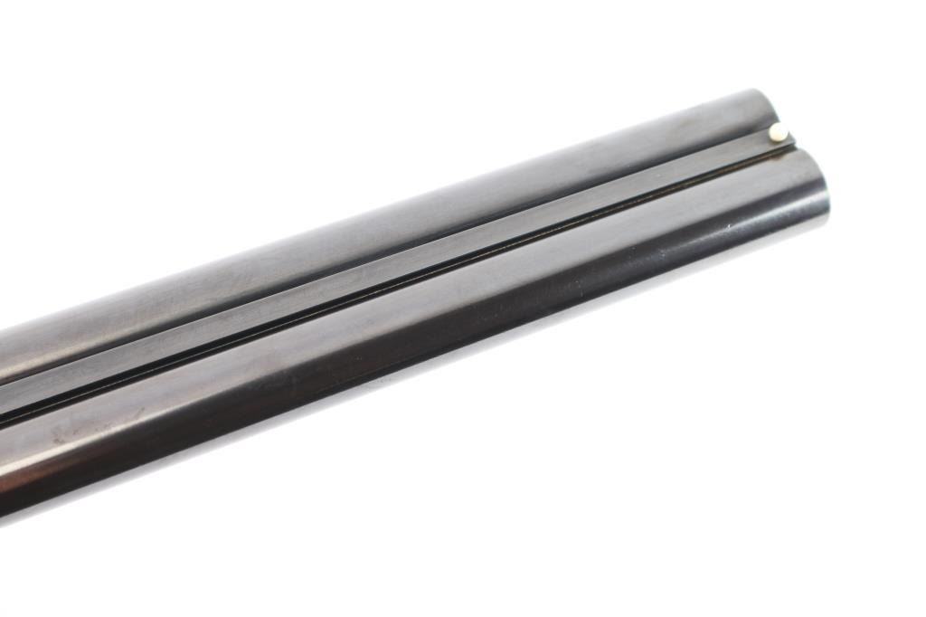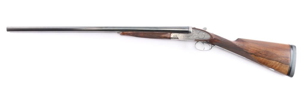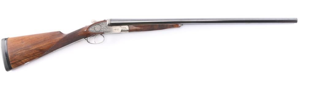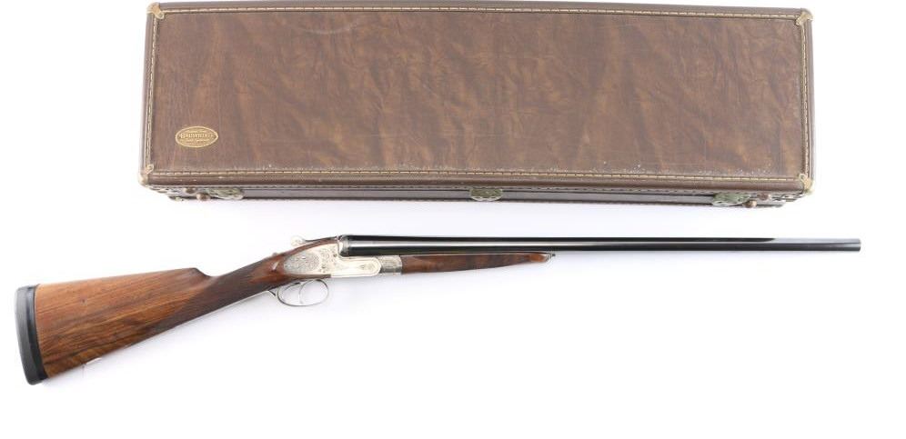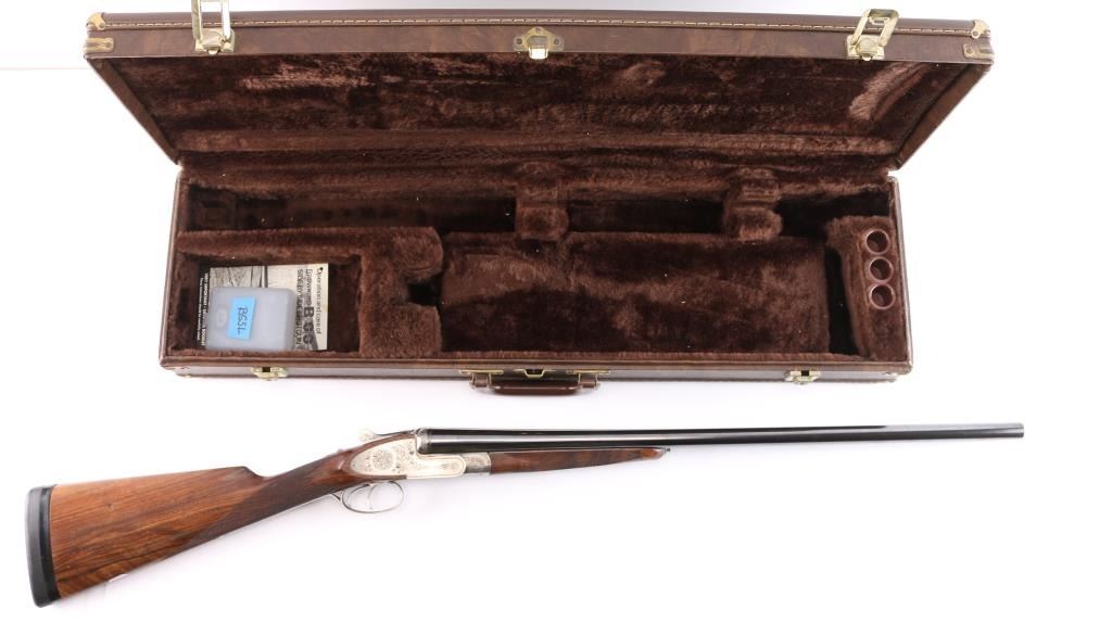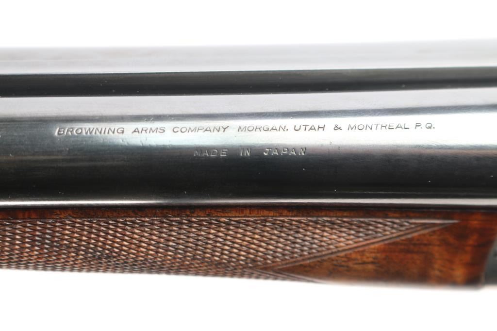 Japanese made sidelock side-by-side double barrel shotgun chambered for 2 3/4" 12 Gauge Shells, manufactured circa 1983. Shotgun imported by Browning Arms Company out of Morgan, UT. and Montreal P.Q. Originally produced as a 26" fixed choke gun and subsequently cut to 25.5" & fitted with Briley S-26 thin wall removable chokes. Featuring blued 25 1/2" barrels with smooth concave rib, ejectors, white bead front sight, bores accept choke tubes, with installed chokes the left bore measures 'CYL' and the right bore measures 'CYL' (with drop-in gauge), double smooth curved silver-toned triggers, serrated sliding tang safety, and checkered top lever. The figured walnut furniture consists of a straight grip shoulder stock with checkering at the wrist & un-engraved silver oval escutcheon inlayed on the underside, a checkered splinter forend with an Anson push-button release, 14-1/2" length-of-pull, 1-5/8" drop at comb, 2-1/2" drop at heel, and a black solid rubber Decelerator recoil pad with two black spacers. With the barrels being blued the rest of the metal has a coin finish. The receiver and all of the small components display full coverage of floral scrolls and edge designs, and the designs extend to the barrels. The coin finish remaining is approximately 98% with very small scratches on the receiver, and little elsewhere. The blued finish on the barrels is approximately 97% intact with a little edge wear at the muzzle, light scratches in front of the forend and contact wear from the forend. Additionally there is a very small amount of microscopic pin prick pitting on the barrels only visible with high magnification. Furniture wood condition is excellent with few light scattered dents mostly on the buttstock. Bores look excellent and bright, but can use a cleaning. The action is tight with the top lever resting far right of center. The metal shows no rust, or deformation. Shotgun includes Browning luggage style brown faux leather hard case, and three additional choke tubes (Mod. Lt Mod & Imp Cyl).