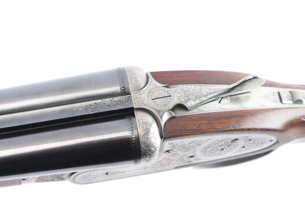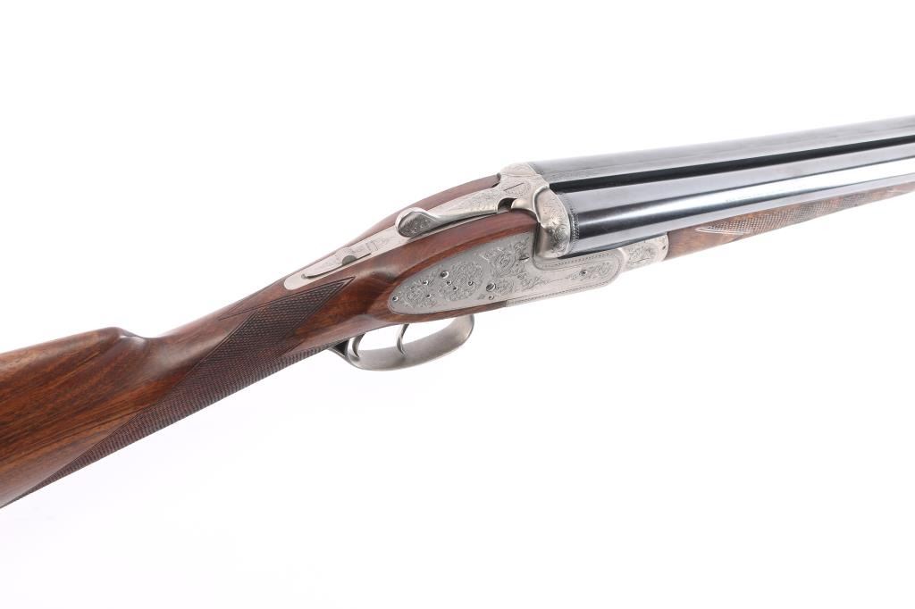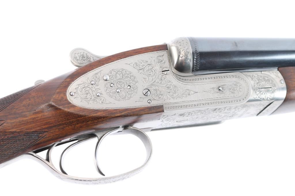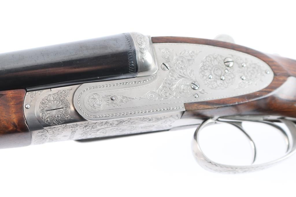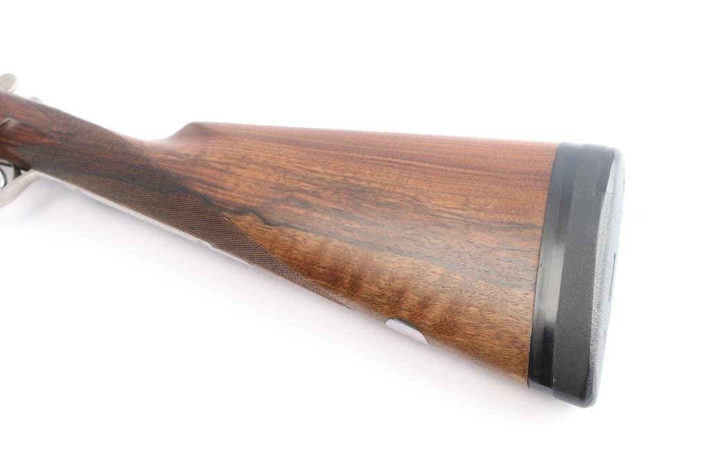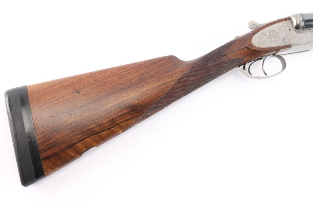 Japanese made sidelock side-by-side double barrel shotgun chambered for 2 3/4" 12 Gauge Shells, manufactured circa 1983. Shotgun imported by Browning Arms Company out of Morgan, UT. and Montreal P.Q. Originally produced as a 26" fixed choke gun and subsequently cut to 25.5" & fitted with Briley S-26 thin wall removable chokes. Featuring blued 25 1/2" barrels with smooth concave rib, ejectors, white bead front sight, bores accept choke tubes, with installed chokes the left bore measures 'CYL' and the right bore measures 'CYL' (with drop-in gauge), double smooth curved silver-toned triggers, serrated sliding tang safety, and checkered top lever. The figured walnut furniture consists of a straight grip shoulder stock with checkering at the wrist & un-engraved silver oval escutcheon inlayed on the underside, a checkered splinter forend with an Anson push-button release, 14-1/2" length-of-pull, 1-5/8" drop at comb, 2-1/2" drop at heel, and a black solid rubber Decelerator recoil pad with two black spacers. With the barrels being blued the rest of the metal has a coin finish. The receiver and all of the small components display full coverage of floral scrolls and edge designs, and the designs extend to the barrels. The coin finish remaining is approximately 98% with very small scratches on the receiver, and little elsewhere. The blued finish on the barrels is approximately 97% intact with a little edge wear at the muzzle, light scratches in front of the forend and contact wear from the forend. Additionally there is a very small amount of microscopic pin prick pitting on the barrels only visible with high magnification. Furniture wood condition is excellent with few light scattered dents mostly on the buttstock. Bores look excellent and bright, but can use a cleaning. The action is tight with the top lever resting far right of center. The metal shows no rust, or deformation. Shotgun includes Browning luggage style brown faux leather hard case, and three additional choke tubes (Mod. Lt Mod & Imp Cyl).