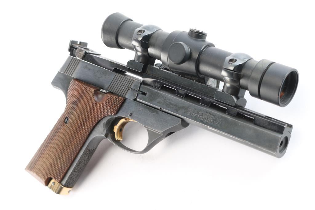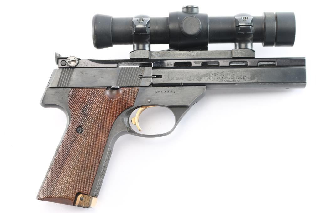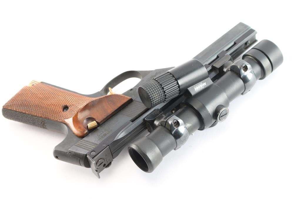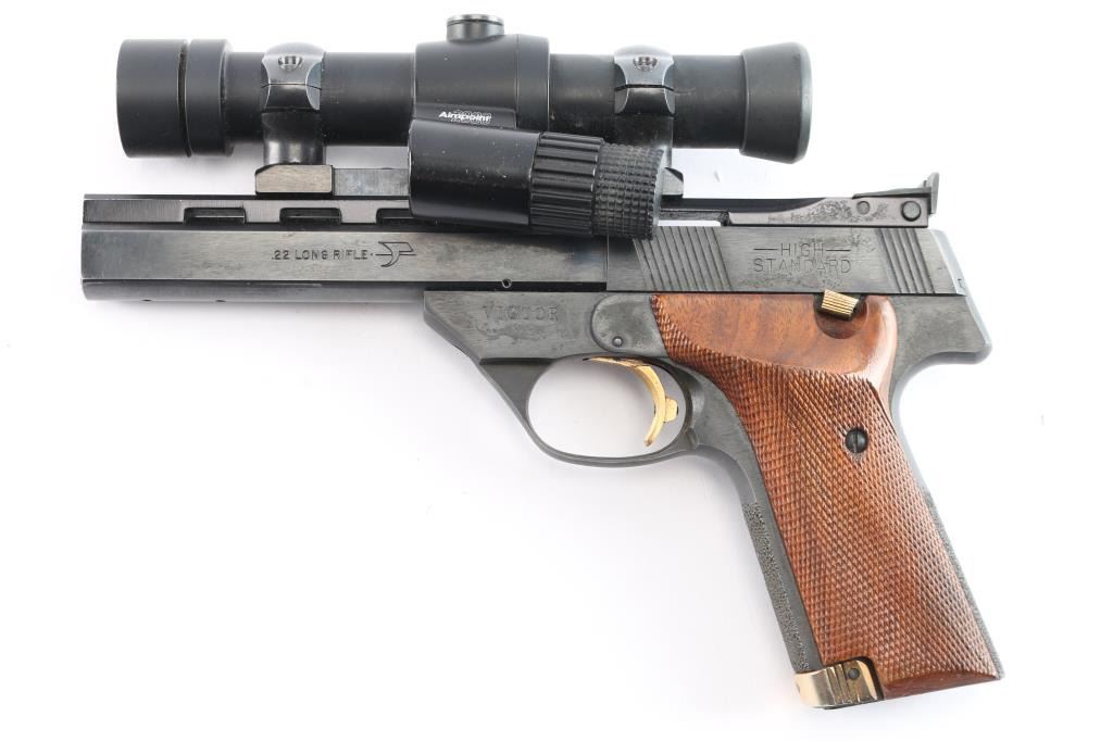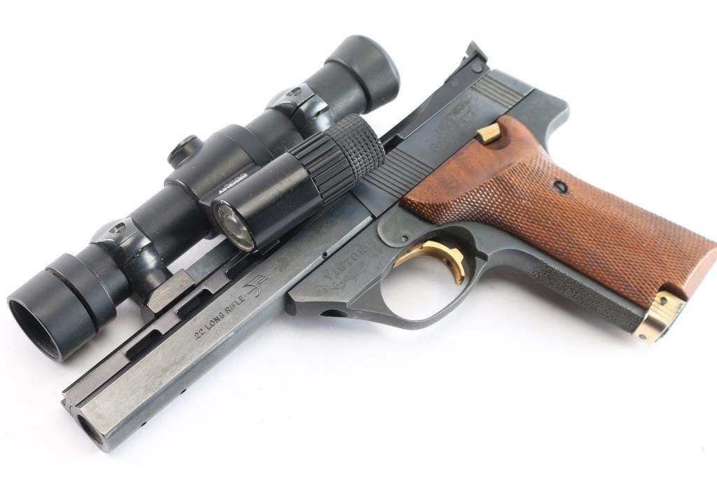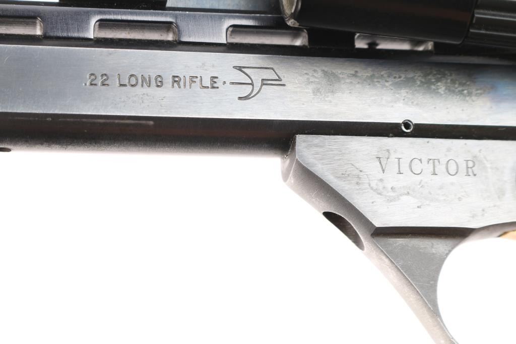 American made semi-Automatic target pistol chambered in .22 Long Rifle manufactured circa 1981 in East Hartford, CT. It features a 5.5" slab sided barrel with ventilated rib, recessed barrel crown, 10-rd magazine, toe magazine release, blade front sight removed for an optics rail, adjustable notch rear sight, right side frame mounted slide stop, stippled grip straps, barrel drilled and tapped for weights, serrated curved trigger, and weight and travel adjustable trigger. The grips are fully checkered walnut with right-handed finger rest. Barrel take-down done via screw on the front of the trigger guard. Blued steel finish with matte barrel rib. Gold colored serrated trigger, mag release, and thumb safety. Slide action is smooth and tight. The bore appears bright with strong rifling. The grips are excellent. Blued finish is about 97% with superficial scratches, extremely light edge wear, barrel weight losses on barrel, and some fading of the bluing on the front of the trigger guard and on the bottom of the beavertail. the Victor is topped with an Aimpoint 2000 using a Redfield rail and rings. This firearm is covered with dried oil, or CLP from storage.