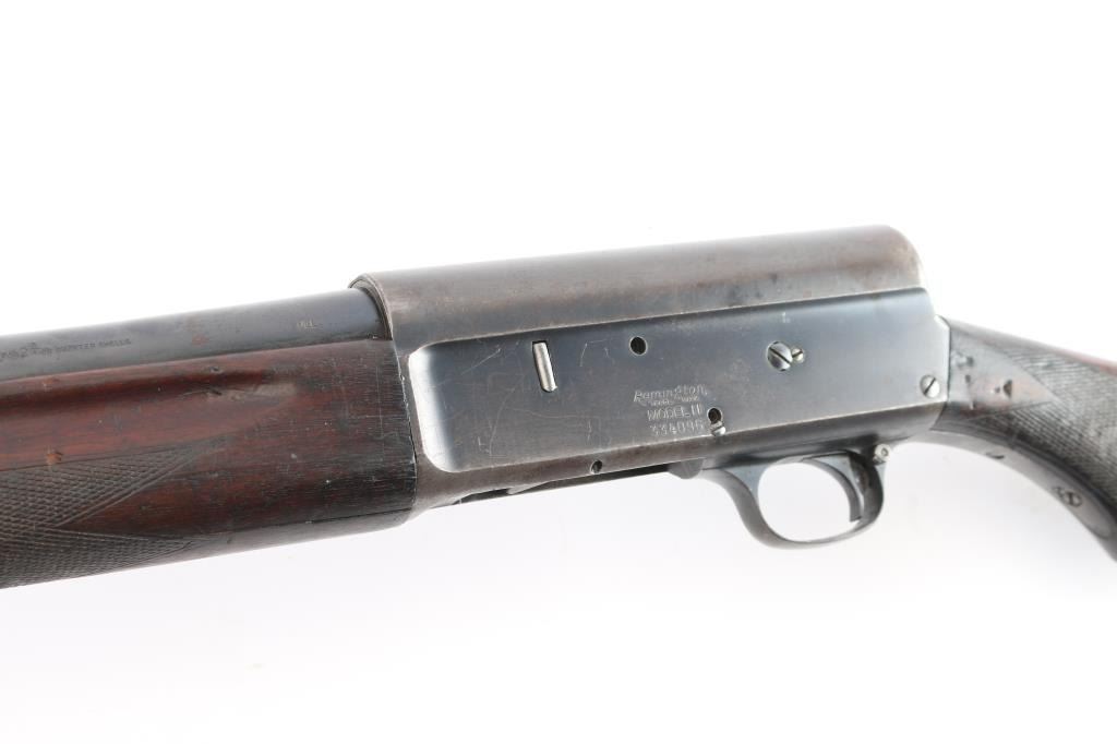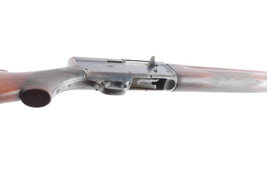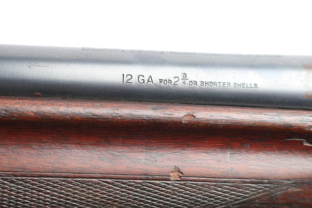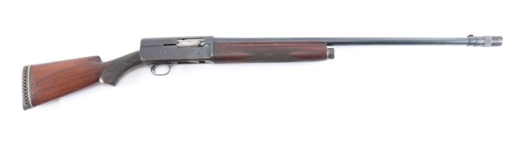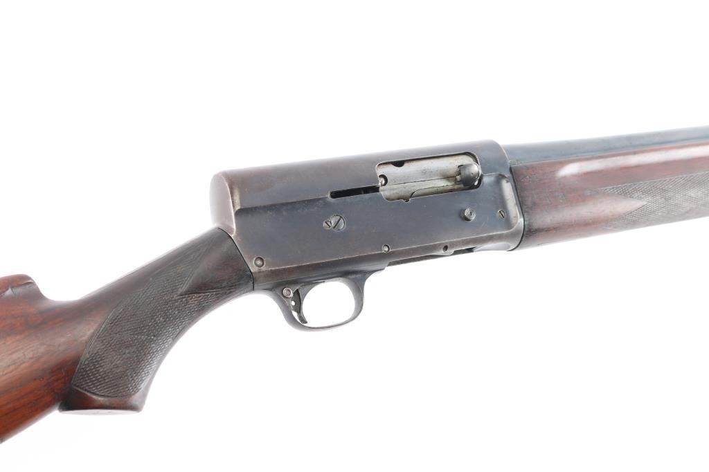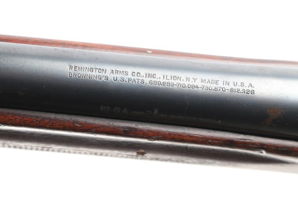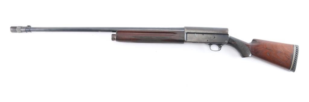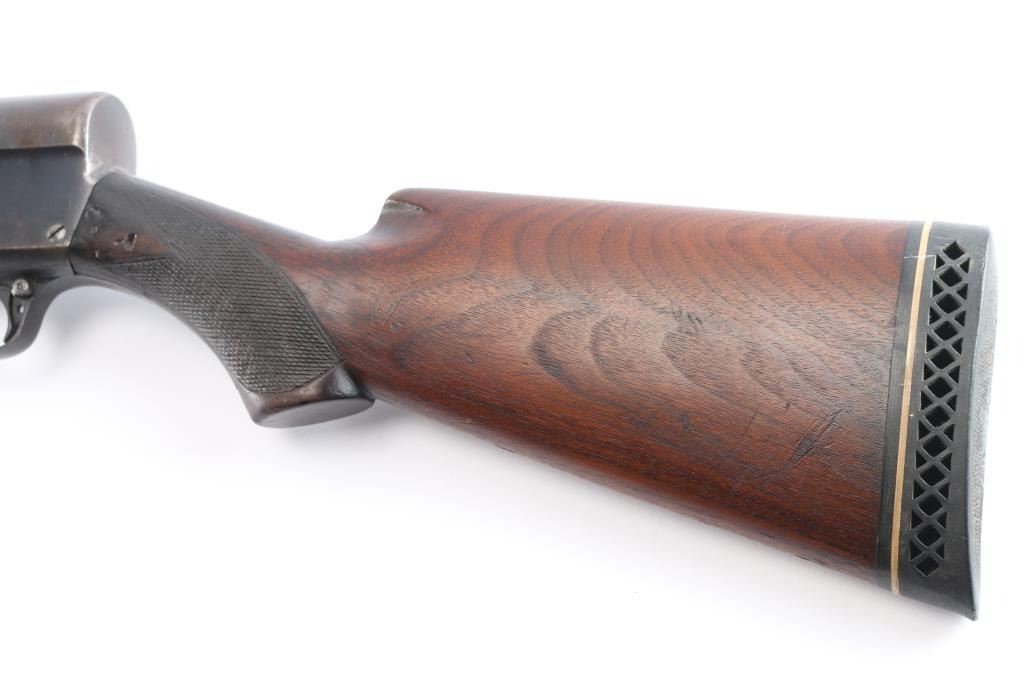 Vintage American made semi-automatic shotgun chambered for 2-3/4" 12 Gauge shells, and manufactured circa 1927-1928 in Ilion, NY. Shotgun features a blued finish, 27" round barrel, serrated red bead front sight, adjustable combination choke and muzzle break, annular cut manual safety at the rear of the trigger guard, smooth slightly curved trigger, annular cut bolt release, and serrated charging handle. The hardwood furniture consists of a semi-pistol gripped shoulder stock with checkering at the wrist, 13-1/2" length-of-pull, 1-5/8" drop at comb, 2-5/16" drop at heel, White Line black ventilated rubber recoil pad with a white and black spacer, and finger grooves above the checkering on the forearm provide a "Prince of Wales" style grip. The original blued metal finish is about 88% with light scratches, edge wear, and general thinning on the receiver and tangs. The metal has light spots of rust, and slight metal deformation was observed in some of the screw slots. Bore is bright and shiny, and the wood furniture is in fair condition with scratches, dings, impressions, low areas in the checkering, and a couple of significant cracks on the forend. The action is works well, but the bolt feels a little sticky when pulled fully rearward. There is a missing screw on the left side of the receiver.