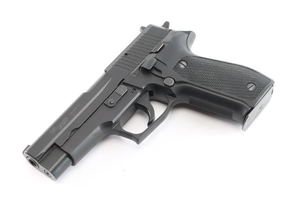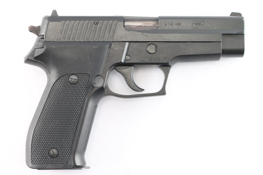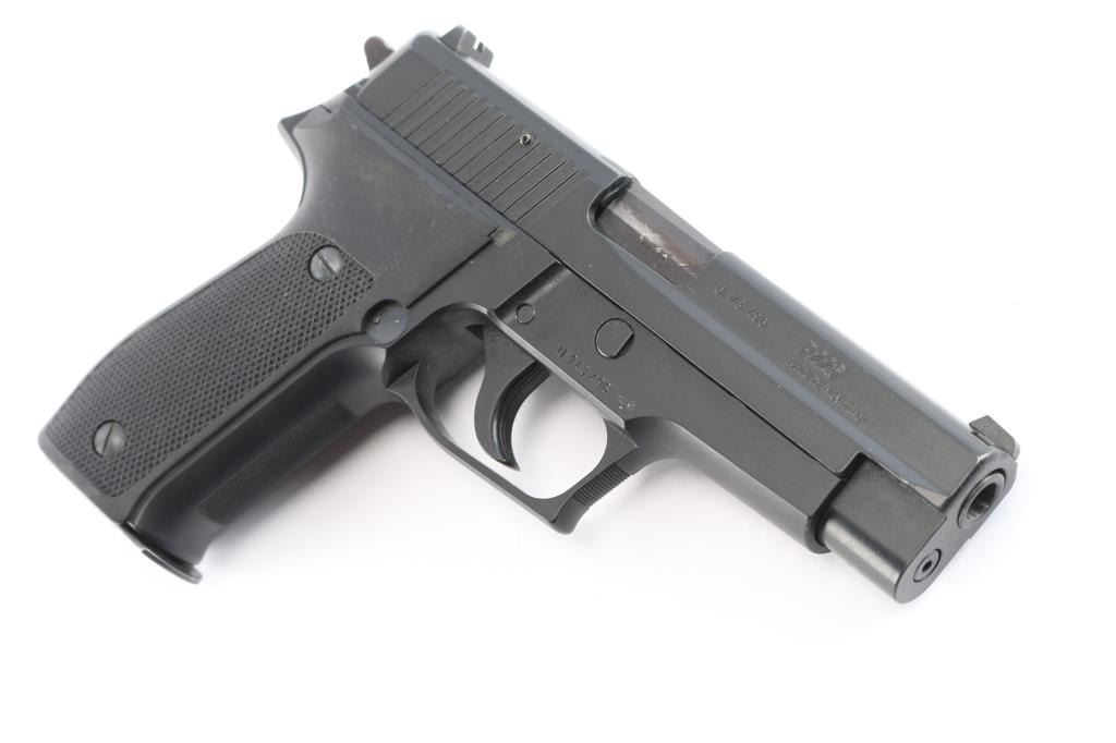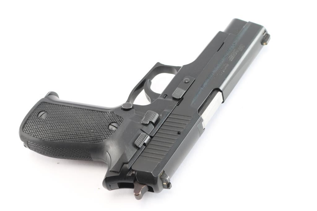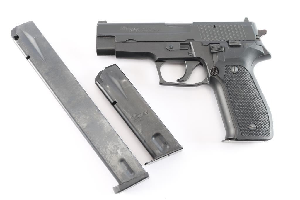 Semi-automatic double and single action pistol chambered in 9mm Luger 'Made in W. Germany,' imported by SIGARMS, Tysons Corner, VA. Manufactured circa 1986. It features a matte black alloy frame, matte slide, a 4.25" barrel, serrated front strap, serrated curved trigger, serrated hammer spur, white dot front sight, white bar rear sight in dovetails, frame mounted decocking lever, serrated push-button magazine release, and black checkered polymer grips. Bore is dirty, but appears bright with strong rifling. Retaining approximately 98% finish with superficial handling marks. Grips are excellent, and the action seems smooth and crisp. This pistol has a dried oil, or CLP residue on it from storage. This pistol comes with an extra 15 round magazine, and an extended magazine.