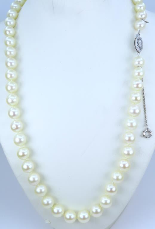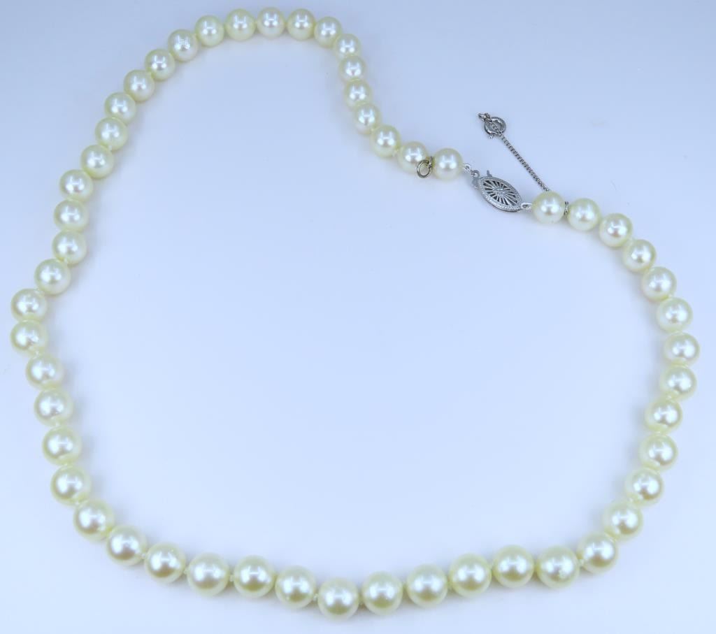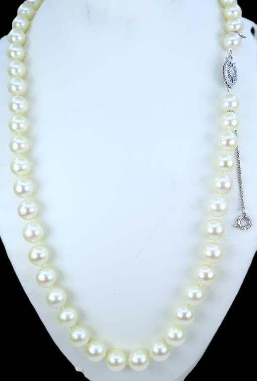 Featuring Hand Knotted Pearls Averaging 7.50 Mm - 8.00 Mm In Diameter, 19- Inches In Length Accented With A 14 Karat White Gold Clasp And Safety Chain.