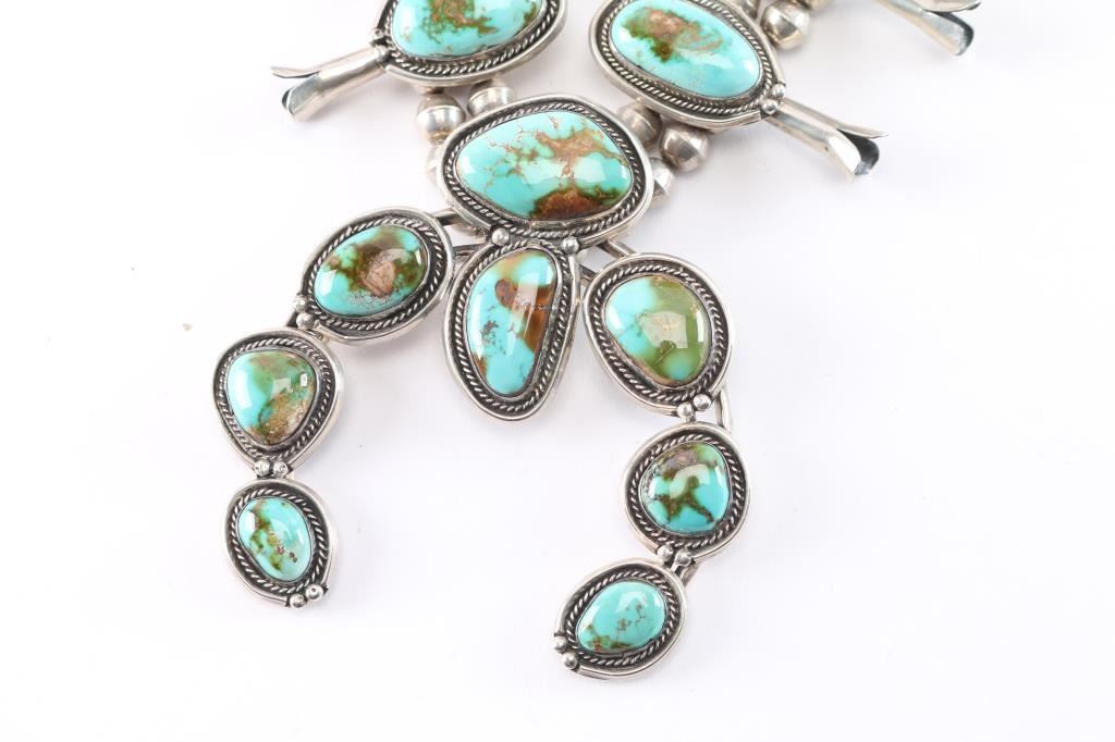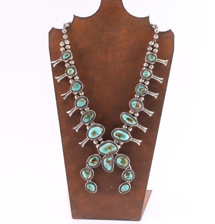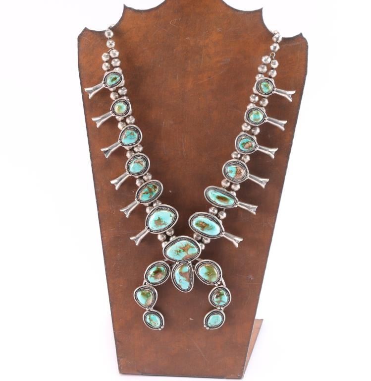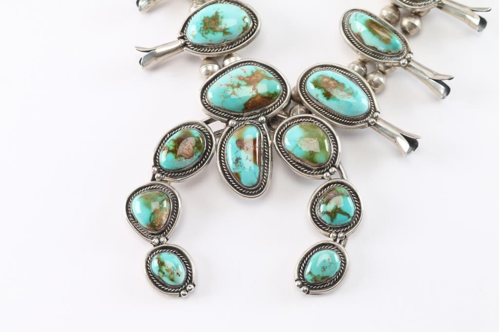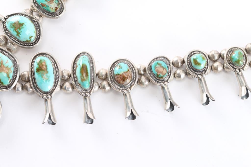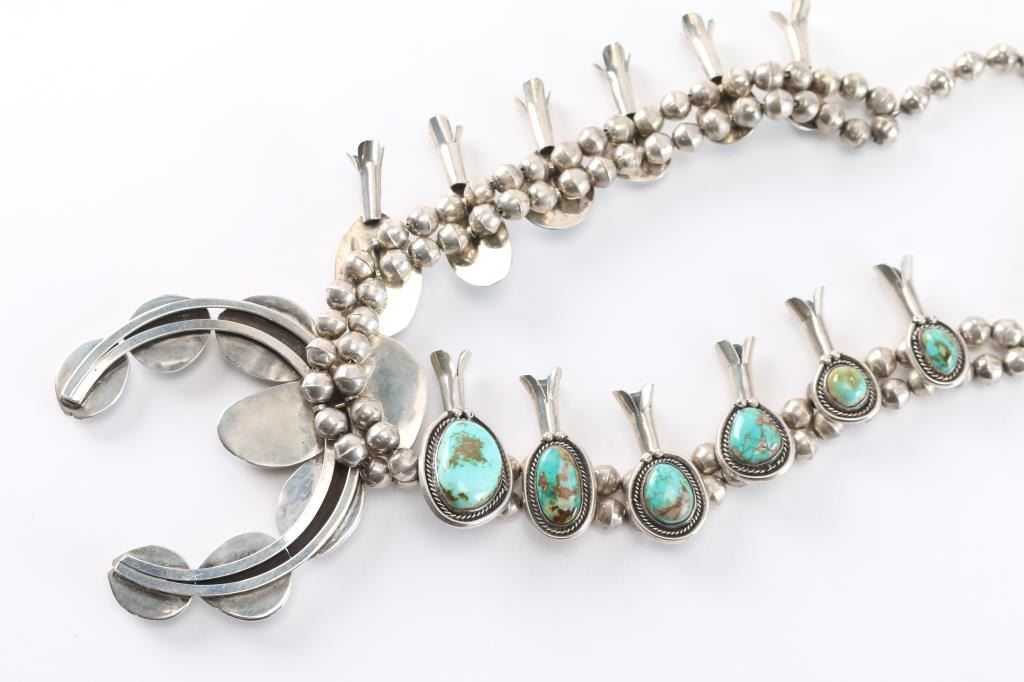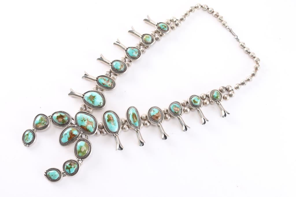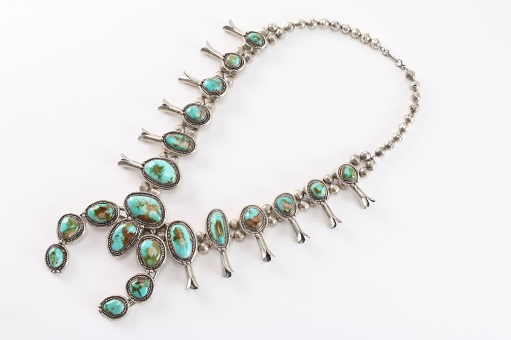 Large blue/green turquoise with nice matrix set in sterling silver squash blossoms and naja. No makers mark. Comes with baggie of extra beads to make necklace longer if desired.