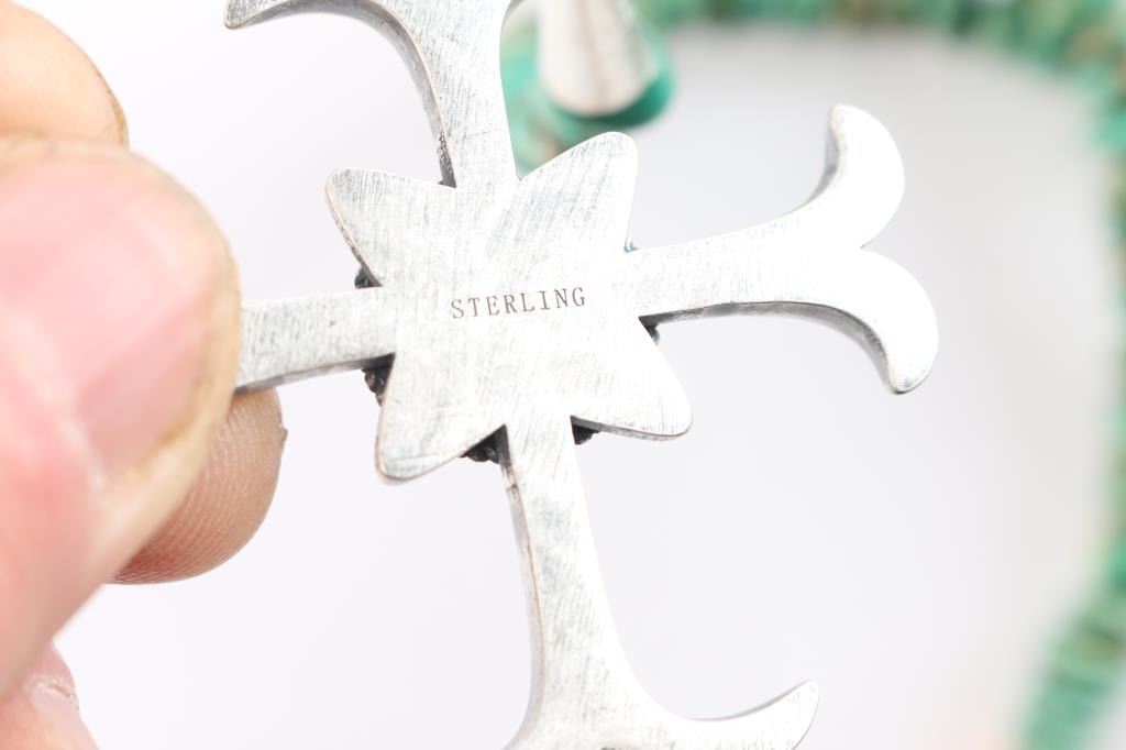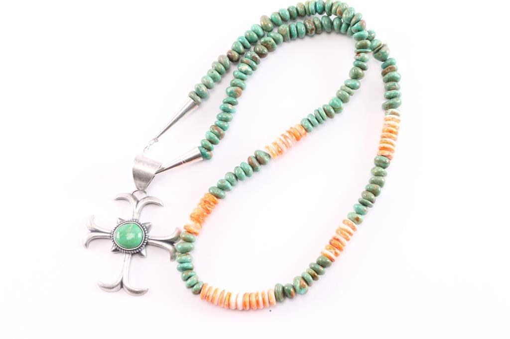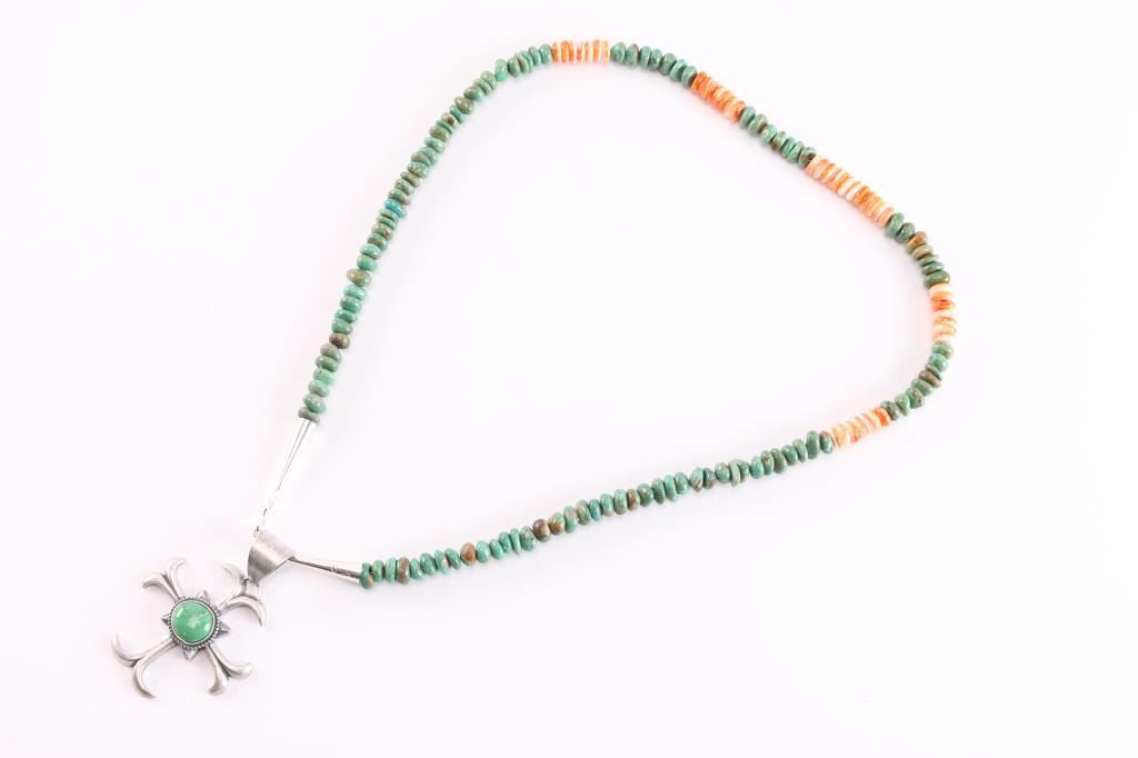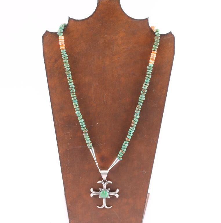 Fully beaded necklace with coral & turquoise beads with satin finished sterling cross with center turquoise stone.