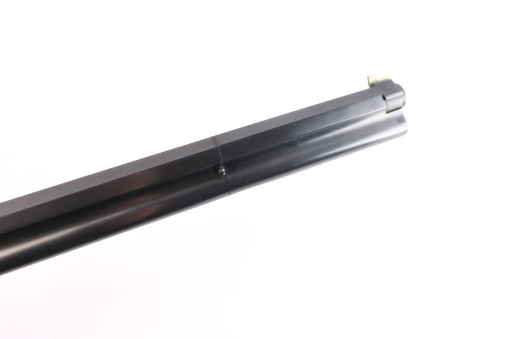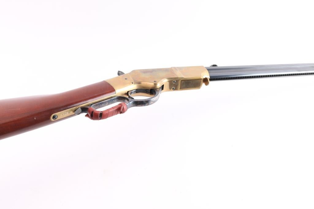 Made in Italy by Uberti and import by American Arms Inc., Kansas City, MO. Lever-action rifle chambered in .45 Long Colt ammunition. Features 24" blued octagonal barrel with a brass blade front sight and ladder type rear sight that flips down to provide an open "V" notch. Polished brass receiver and crescent buttplate, full length tube magazine, case hardened lever and hammer, bright polished sides on trigger and lever locking latch. Bore is pristine. Retains approx. 95% finish with some handling marks. Wood buttstock is near excellent condition with scattered light scratches and several small dents. Condition is NRA Excellent