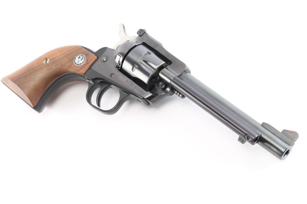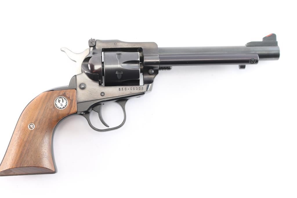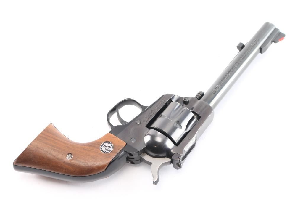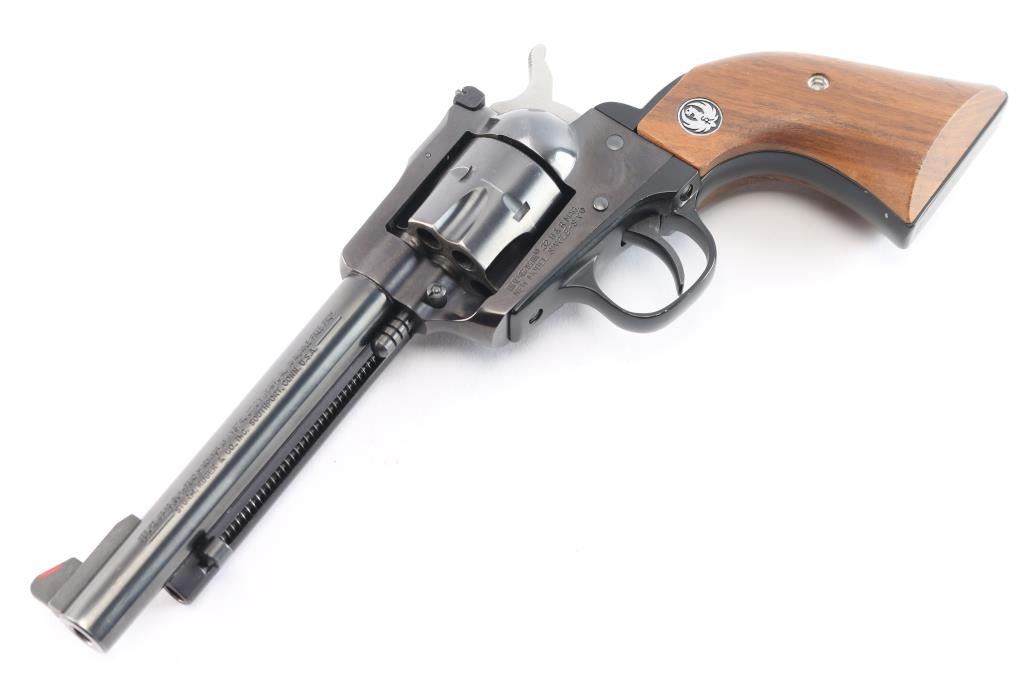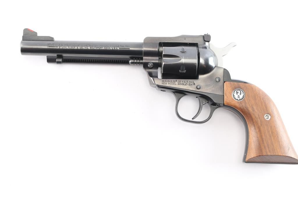 American made single-action centerfire revolver chambered for .32 H&R Magnum, manufactured circa 1985 in Southport, CT. Revolver features a polish blued finish, 5-1/2" barrel, raised serrated blade front sight with red insert, micrometer adjustable notched rear sight with white outline, smooth curved trigger, fluted 6 shot cylinder, round ejector rod button, two-toned hammer with serrated spur, frame mounted firing pin, transfer bar safety, collard cylinder pin head, and smooth two-piece walnut grips with Ruger medallions. The original finish retained is approximately 97% with edge wear, and very minor scattered scratches and nicks. Metal displays no rust or deformation. Bore is bright with strong rifling, and the cylinder chambers are also excellent. Action is smooth and crisp with a tight lock-up. The grips are very good to excellent with superficial handling marks, and some water or liquid damage on the bottom of the right grip panel and by the medallion.