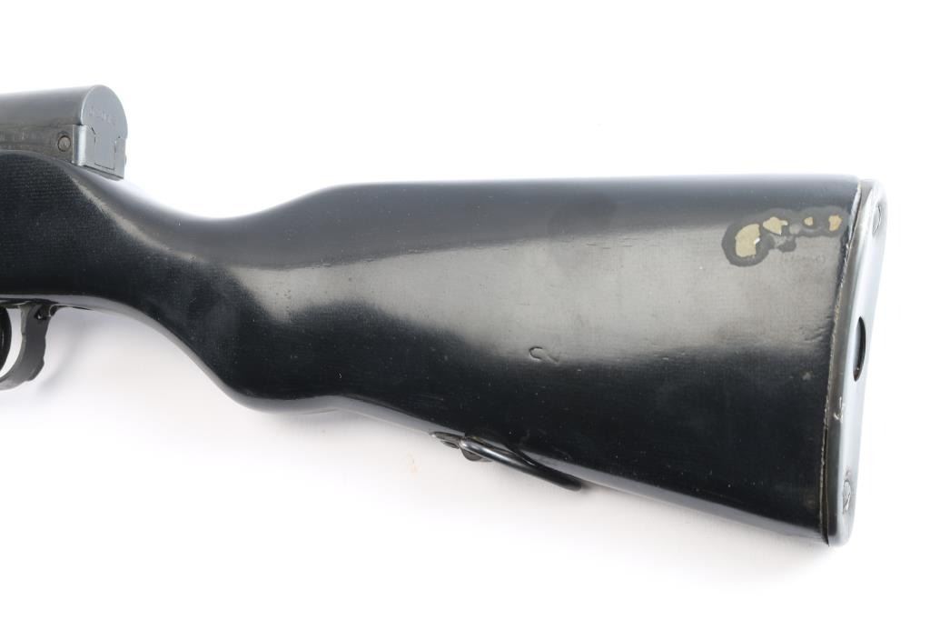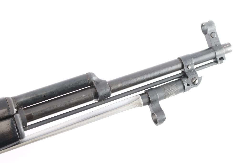 Chinese type 56 semiautomatic rifle, has the mysterious "DP" stamp on the receiver rail. Sources say these rare Chinese stamped DP rifles were produced in 1970-1971. Features blued finish, smooth wood stock & handguard, 20" chrome lined barrel, folding spike bayonet, cleaning rod, protected post front sight, tangent rear sight, manual safety, fixed 10 round magazine. Later style stamped trigger guard. The wood stock has been painted in gloss black. Bore is excellent/bright. Retains 95% finish with handling marks and edge losses. Wood is very good with minor blemishes to the black painted finish. Serial number repeated on bolt carrier, triggerguard, magazine, receiver & receiver cover. Comes in original factory box with manual, oiler & green canvass sling.