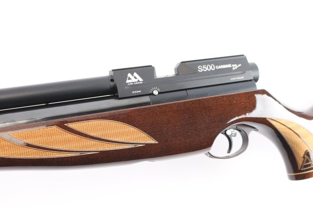 Air Arms Deluxe S500 FAC 'Superlite' sidelever air rifle. An ultra-lightweight version, approximately 25% lighter than standard models, crafted from Poplar wood. Quality English manufactured single-shot, bolt-action pre-charged pneumatic (PCP) rifle. Fully regulated, side lever cocking, 2-stage adjustable trigger