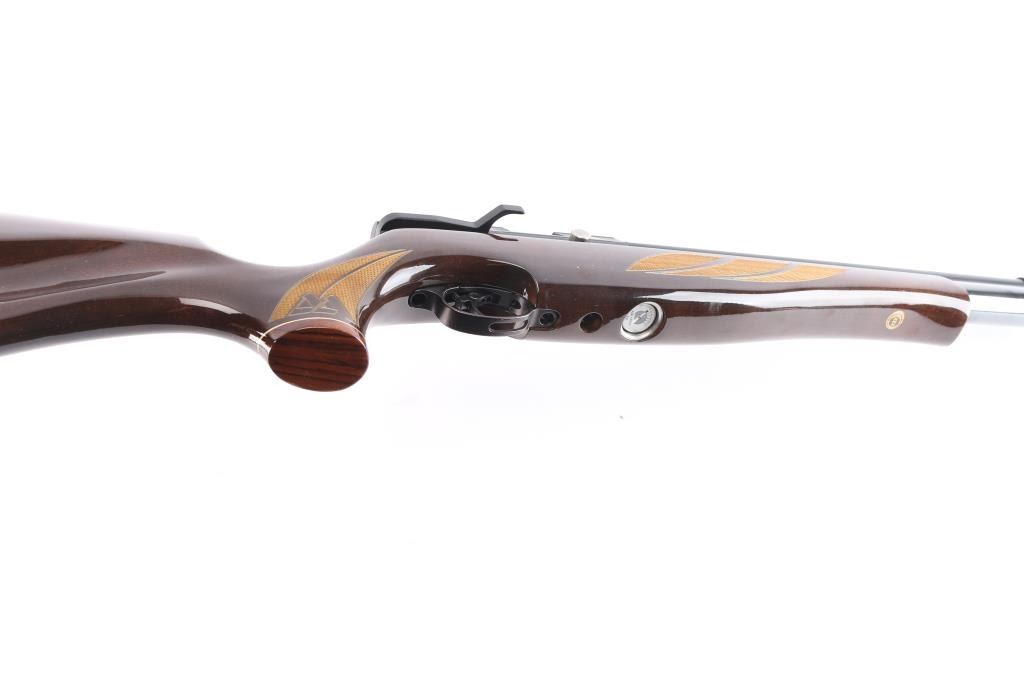 contrasting blonde checkered pistol grip and forearm panels, vented rubber recoil pad. Rifle is excellent, like new condition. Comes in factory box with matching label, manual.
