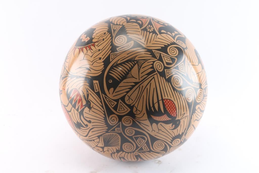 By Gloria Hernandez. Shows reptiles, birds and animals. Measures 13"x15", comes with metal stand. In excellent condition. Purchased at the Smoki Museum auction years ago.