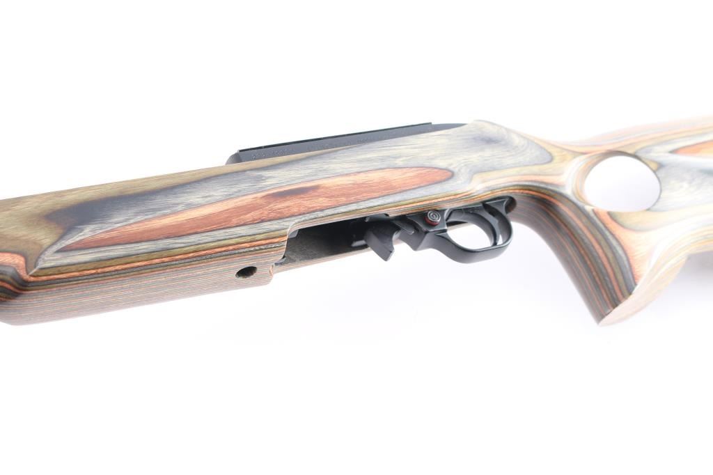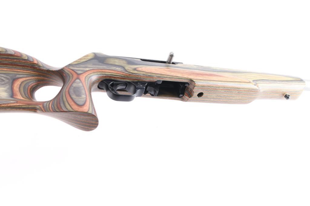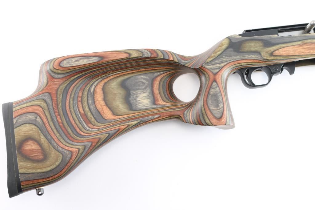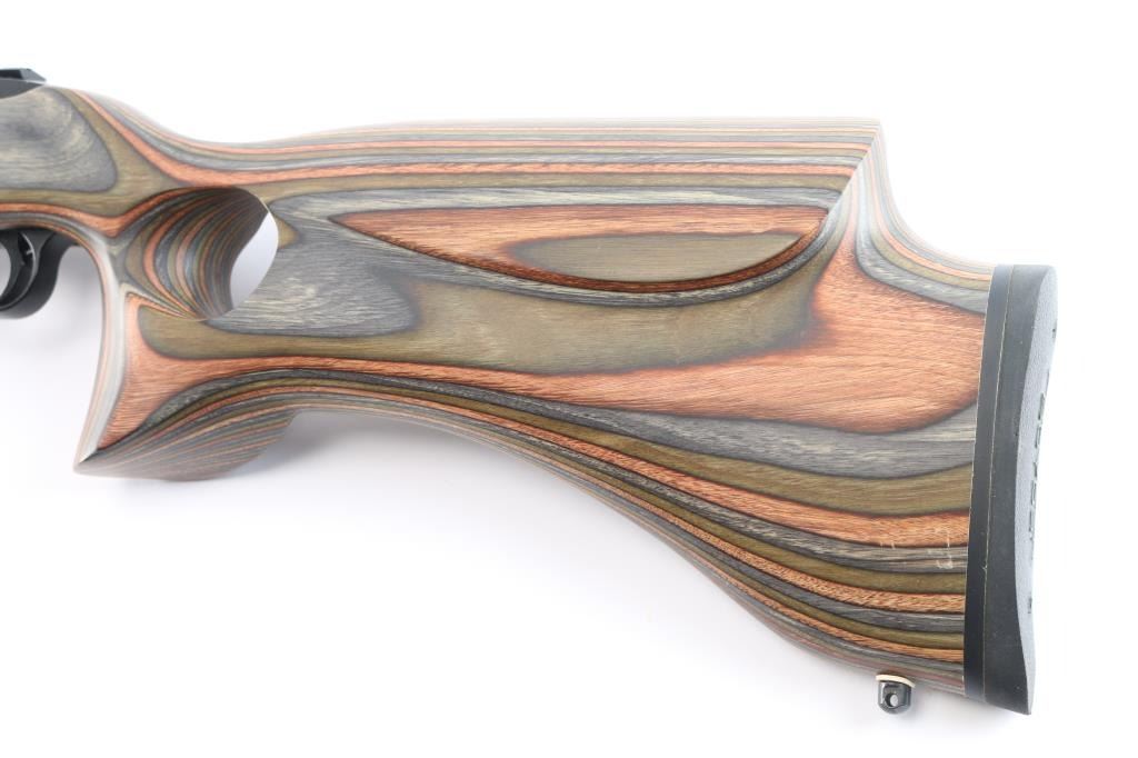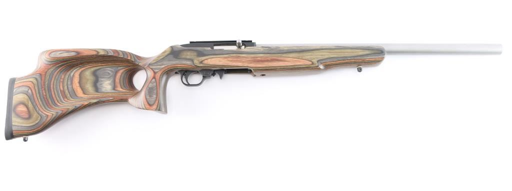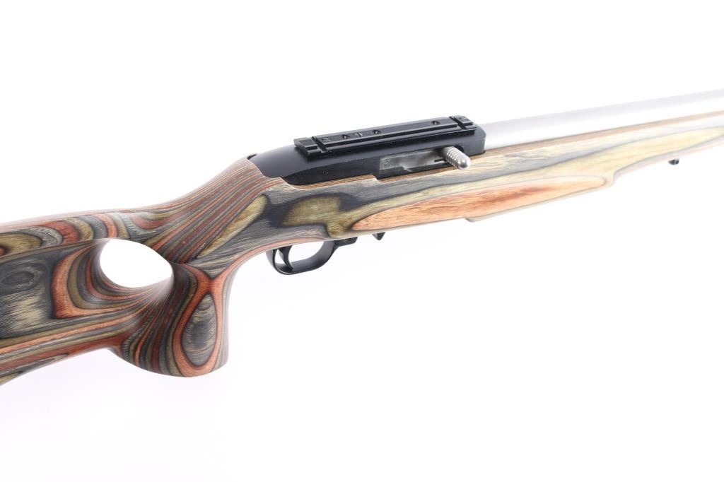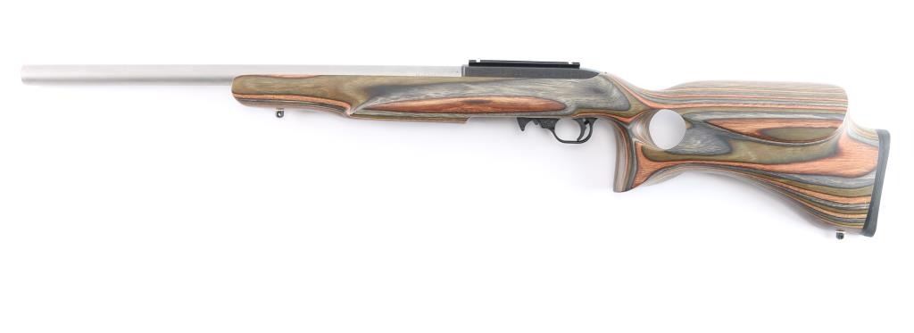 Customized American made semiautomatic rimfire 'target' rifle chambered in .22 Long Rifle, manufactured circa 1990 in Southport, CT. Originally sold as a Model '1103.' Featuring a satin stainless 20" Butler Creek bull barrel with recessed crown, no provisions for iron sights, smooth curved trigger, extended magazine release, no magazine, push-button safety, manual bolt hold open with automatic bolt release, collard bolt handle, receiver drilled and tapped for mounting optics, and aluminum trigger guard. Furniture consists of a multi-colored Boyd's smooth laminate thumbhole stock, smooth wide contoured forend, high cheekweld, sling studs in the forend, sling studs in the bottom of the buttstock, and black rubber recoil pad. The receiver, trigger, magazine release, and trigger guard are painted black, and the barrel has a matte stainless finish. The remaining original painted finish is approximately 98% with only a few small scattered nicks and scratches. The external barrel condition is very good with small and light scattered scratches. Bore is bright with strong rifling, and the action is smooth and crisp. Metal condition is excellent with no heavy scratches or scuffs. Furniture wood is excellent with only superficial blemishes. The receiver has a Weaver rail installed.