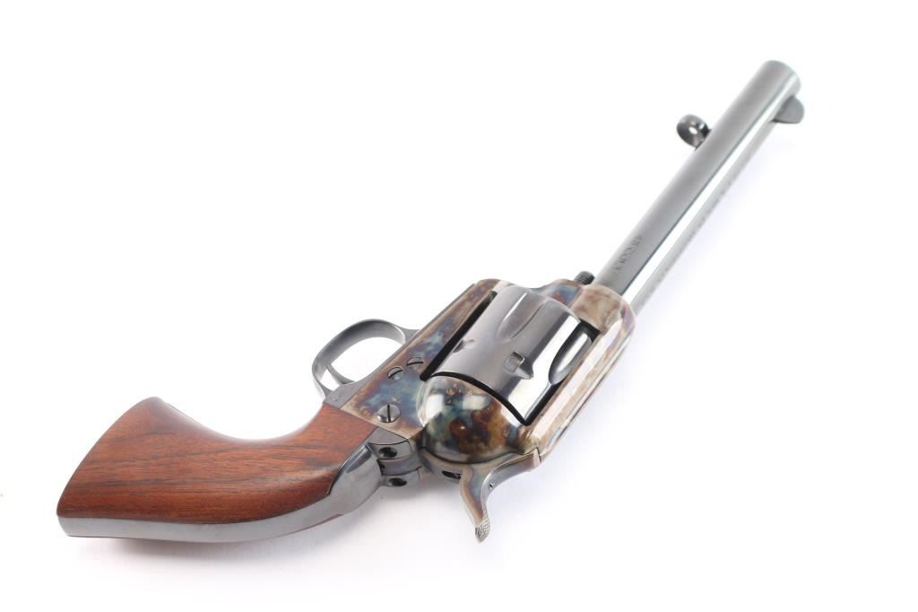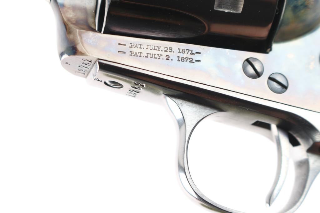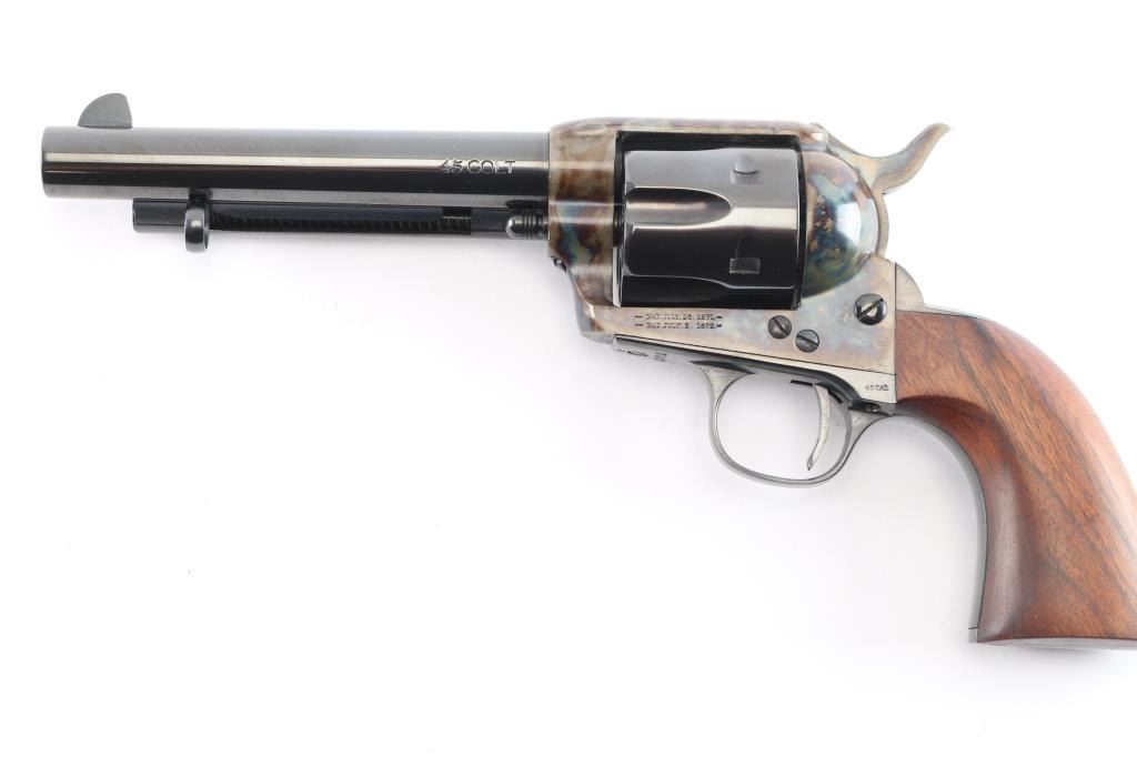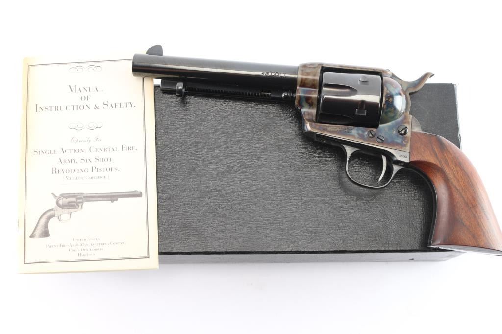 Replica of the Colt 1873 "Peacemaker," a single-action revolver chambered for .45 Long Colt, parts imported by United States Patent Fire Arms Mfg. Co.(USPFA) form Hartford, CT. Revolver was built in the United States using Uberti parts. USPFA was founded in 1993 and eventually sued by Colt for using the word 'Patent' in the business name. In consequence, USPFA became the United States Firearms Mfg. Co. (USFA). These early pistols with the patent marking in the address line were only made for a couple of years and are coveted by collectors. Manufactured circa 1994-1995. Revolver features a blued 5.5" round barrel, fixed blade front sight, notched frame rear sight, thin smooth curved trigger, fluted six-round cylinder, collard cylinder pin head, 'screw' cylinder pin retainer, firing pin mounted on hammer nose, checkered hammer spur, bullseye ejector rod button, smooth grip straps, and single-piece smooth hardwood grips. Barrel, cylinder, trigger guard, and grip straps have a gloss blued finish, while the frame and hammer have a color case finish. The color-case finish may be a coating rather than a metal treatment. The original blued finish retained is approximately 98% with only superficial scratches. The color-case finish is very good with no observed handling marks, but it appears that a small amount of the finish has peeled, or flaked off. Metal displays no rust or deformation. Wood grips are excellent, and the action is smooth and crisp with a tight lock-up. Bore is bright with strong rifling, and the cylinder chambers are also excellent. Pistol includes original black cardboard box with paperwork.