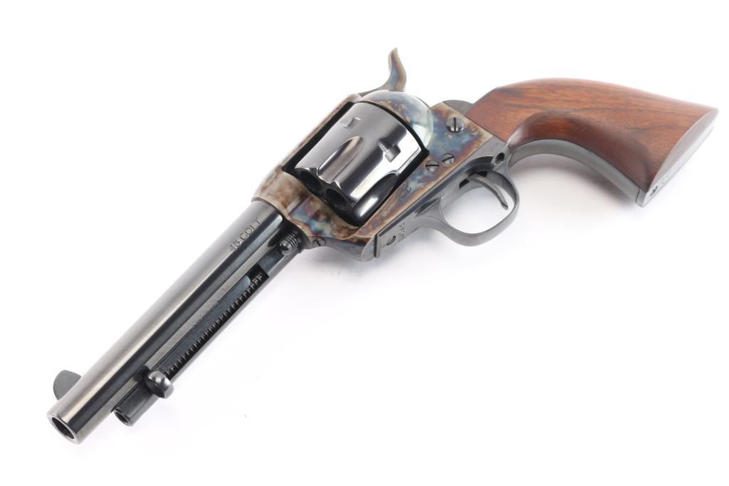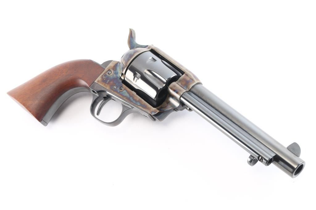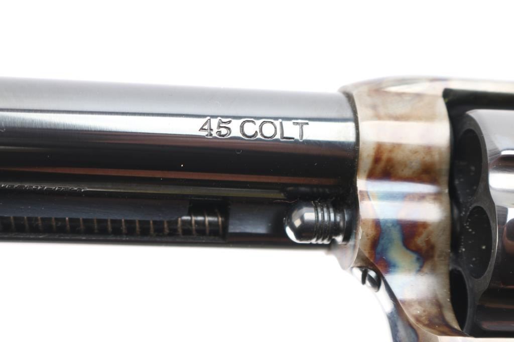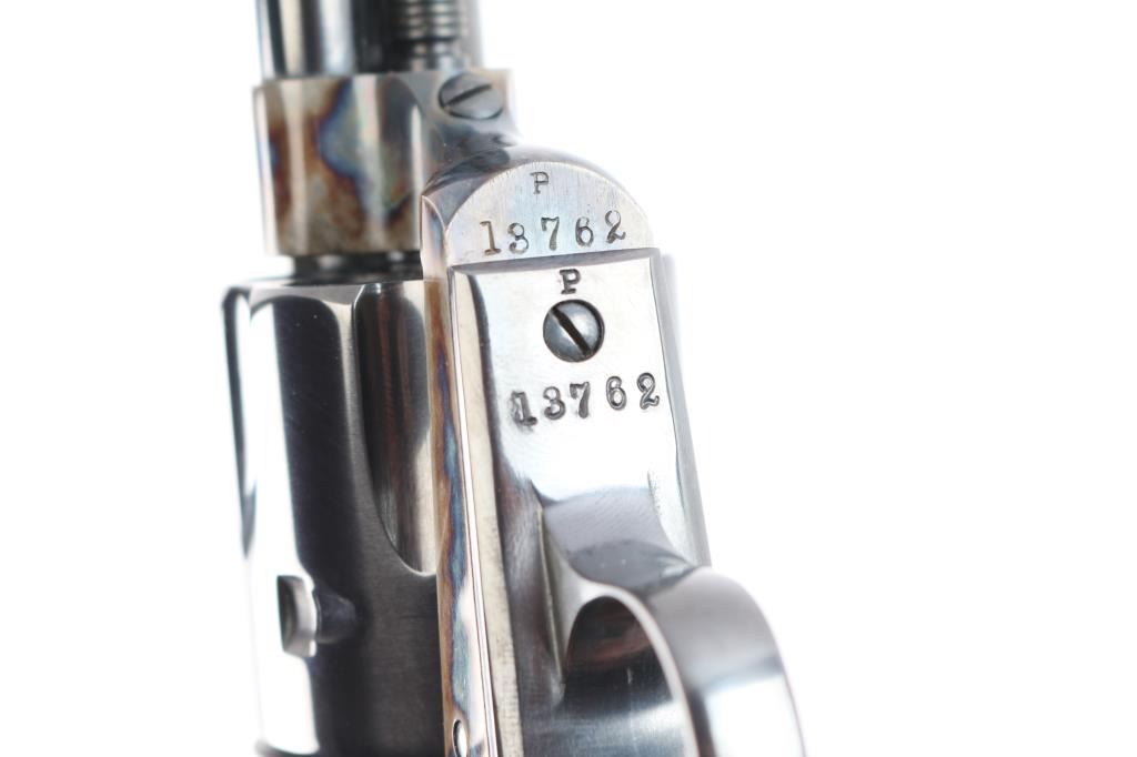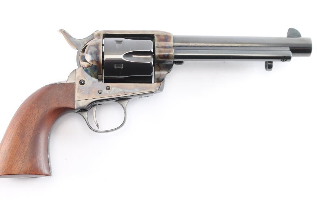 Replica of the Colt 1873 "Peacemaker," a single-action revolver chambered for .45 Long Colt, parts imported by United States Patent Fire Arms Mfg. Co.(USPFA) form Hartford, CT. Revolver was built in the United States using Uberti parts. USPFA was founded in 1993 and eventually sued by Colt for using the word 'Patent' in the business name. In consequence, USPFA became the United States Firearms Mfg. Co. (USFA). These early pistols with the patent marking in the address line were only made for a couple of years and are coveted by collectors. Manufactured circa 1994-1995. Revolver features a blued 5.5" round barrel, fixed blade front sight, notched frame rear sight, thin smooth curved trigger, fluted six-round cylinder, collard cylinder pin head, 'screw' cylinder pin retainer, firing pin mounted on hammer nose, checkered hammer spur, bullseye ejector rod button, smooth grip straps, and single-piece smooth hardwood grips. Barrel, cylinder, trigger guard, and grip straps have a gloss blued finish, while the frame and hammer have a color case finish. The color-case finish may be a coating rather than a metal treatment. The original blued finish retained is approximately 98% with only superficial scratches. The color-case finish is very good with no observed handling marks, but it appears that a small amount of the finish has peeled, or flaked off. Metal displays no rust or deformation. Wood grips are excellent, and the action is smooth and crisp with a tight lock-up. Bore is bright with strong rifling, and the cylinder chambers are also excellent. Pistol includes original black cardboard box with paperwork.