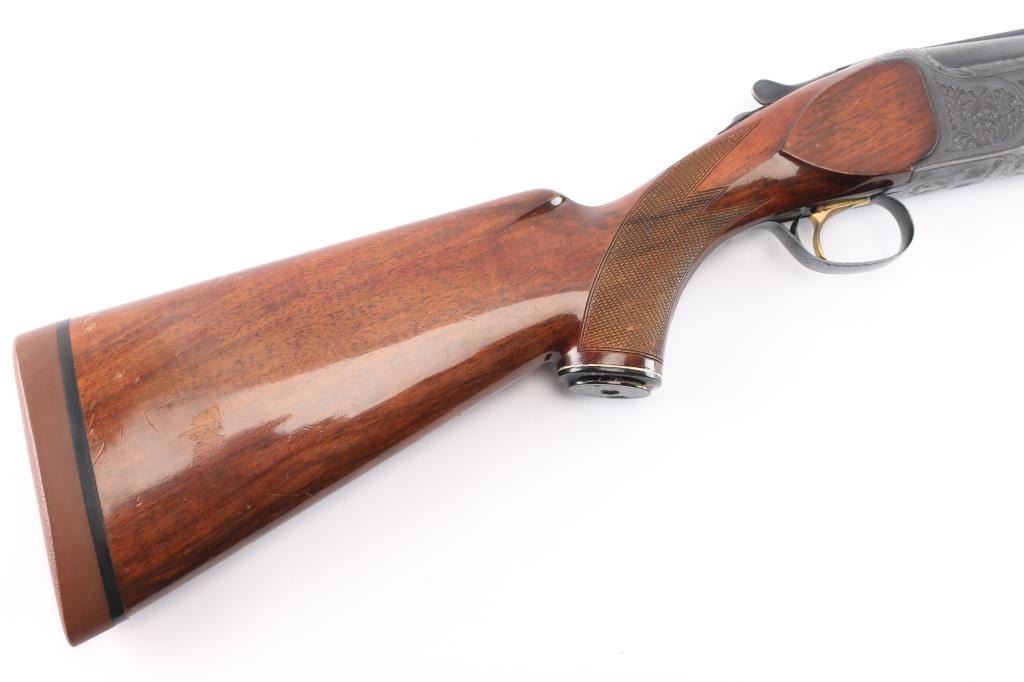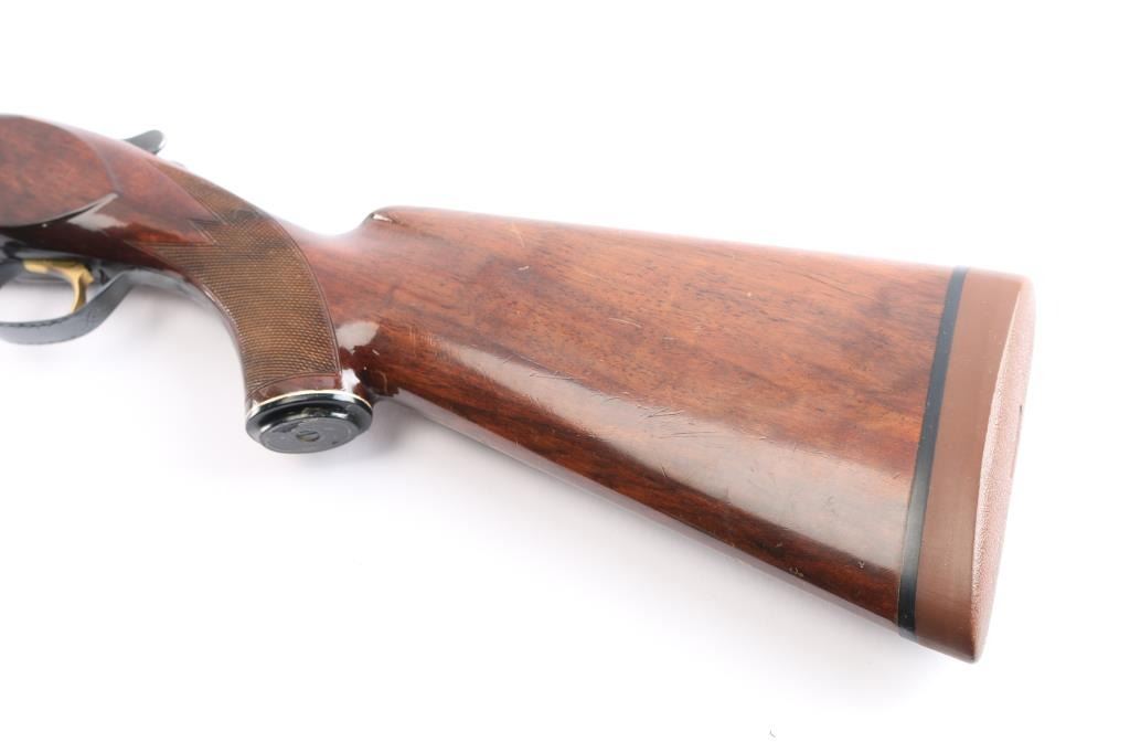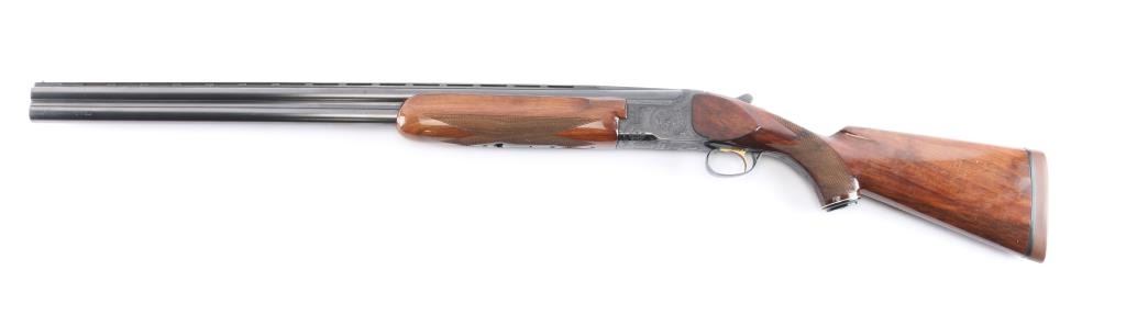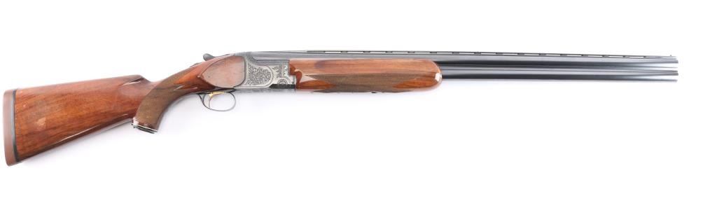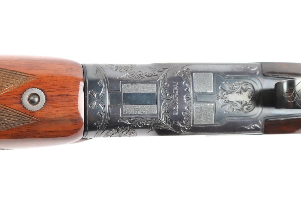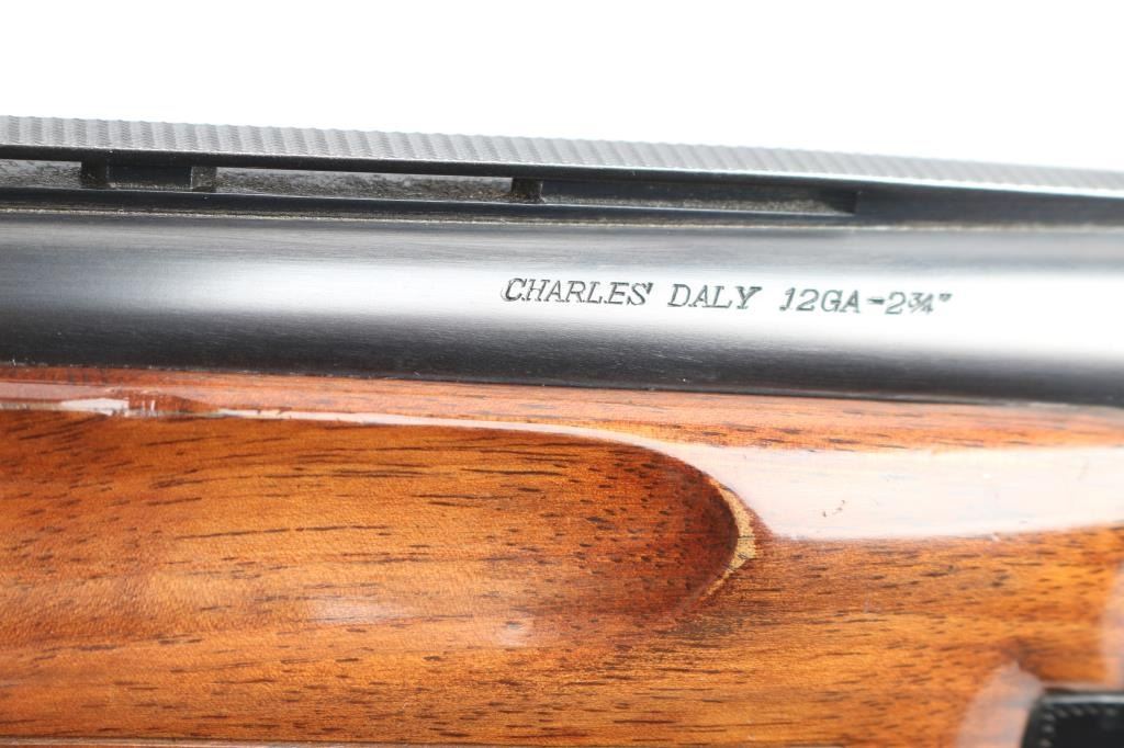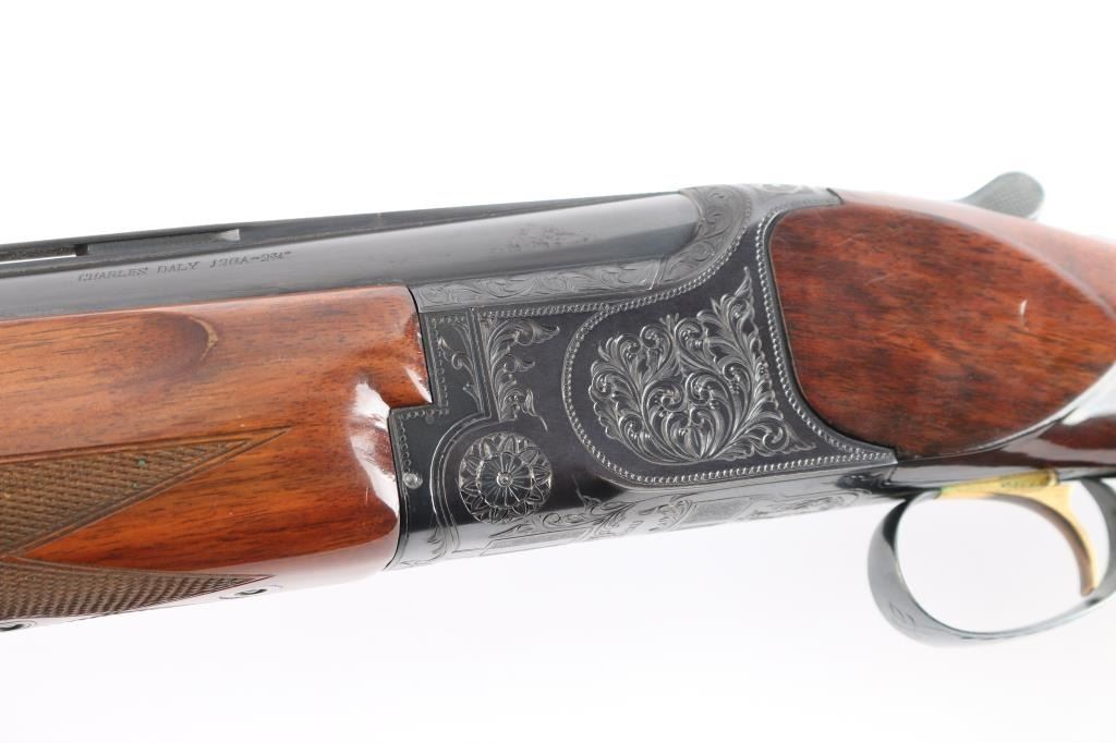 Japanese made over and under box-lock shotgun chambered for 2 3/4" 12 Gauge shells. Miroku made Charles Daly shotguns from the late 1960s to the early 1970s. Superior grade shotgun, featuring a blued finished 28" ventilated ribbed barrels, fixed chokes marked for & measure Full / Mod, steel bead front sight, steel mid-bead, selective ejectors, single curved smooth gold-toned inertial trigger, checkered top lever, and serrated sliding tang safety and barrel selector. The high gloss walnut furniture consists of a semi-pistol grip shoulder stock with checkering at the wrist, checkered grooved forend with Deeley latch release, long lower tang, 13-1/2" length-of-pull, 1-3/8" drop at comb, 2-1/4" drop at heel, black grip cap with white spacer, and a brown solid rubber Decelerator recoil pad. The receiver displays limited coverage floral scrolls, and edge designs. The engraving extends to many of the small parts including the top lever, trigger guard, sides of the top barrel, and on the forend parts. Receiver, forend, and barrels all have matching serial numbers, '552890.' The original blued finish remaining is approximately 98% with light scattered scratches, and light edge wear at the muzzle and triggerguard. Bores look excellent and bright, and the action is smooth with tight lock-up & the top lever resting centered. Furniture wood is good to very good with a scattered nicks and dings on the buttstock, a nickel size patch of finish loss on the right side of the buttstock, and some finish losses on the handguard edges where most are on the buttstock. The metal shows a couple small spots of pitting along the barrels left side in front of the forend. The grip cap is showing some delamination. Condition is NRA Good.