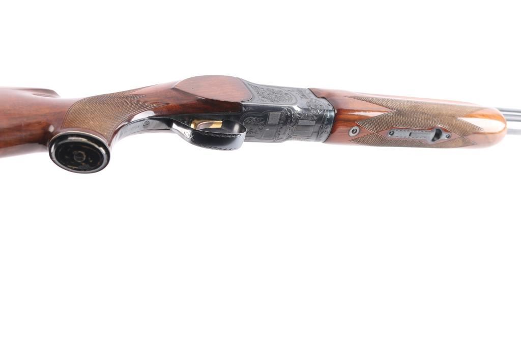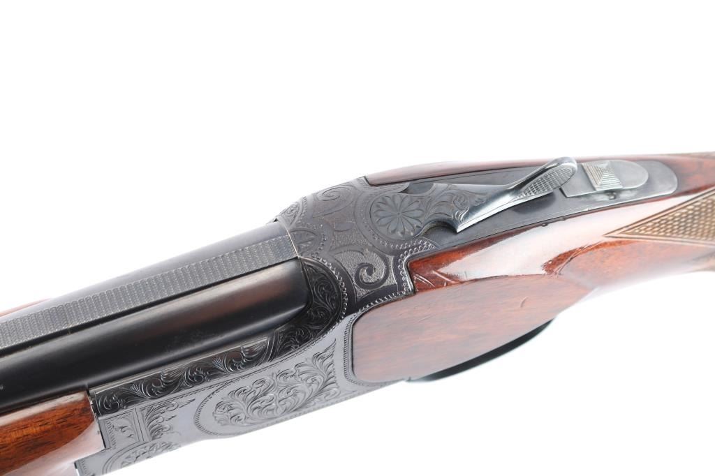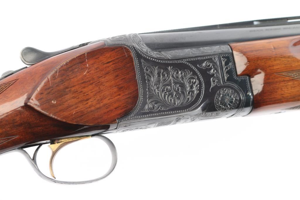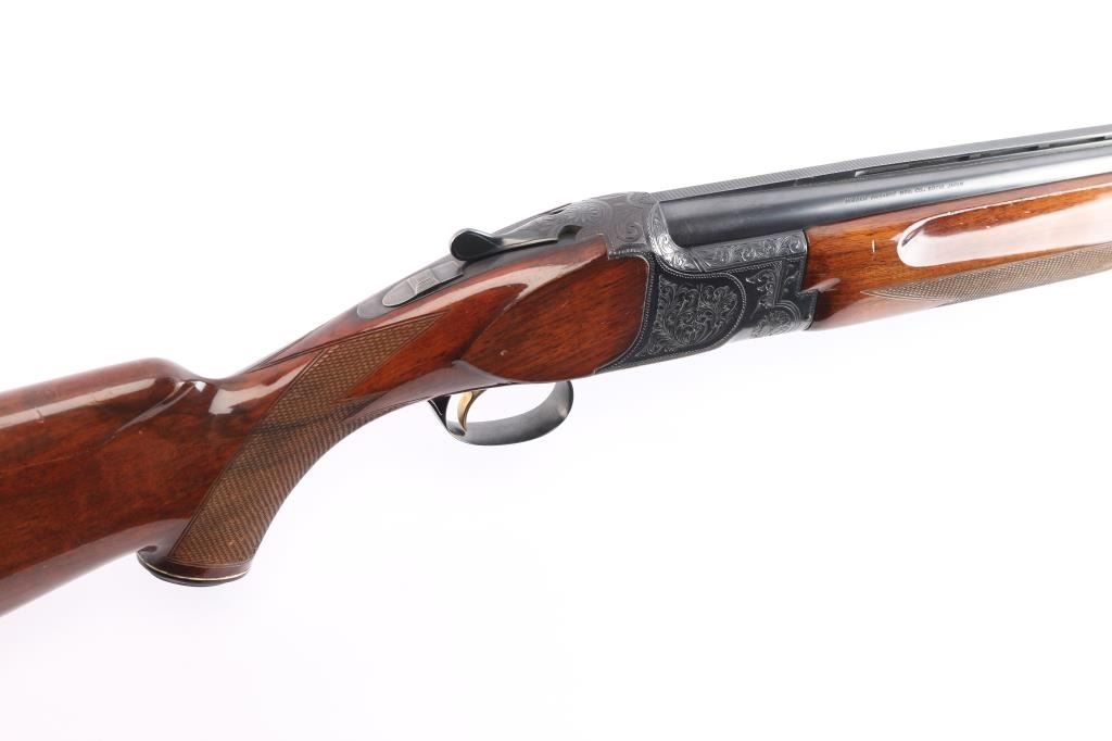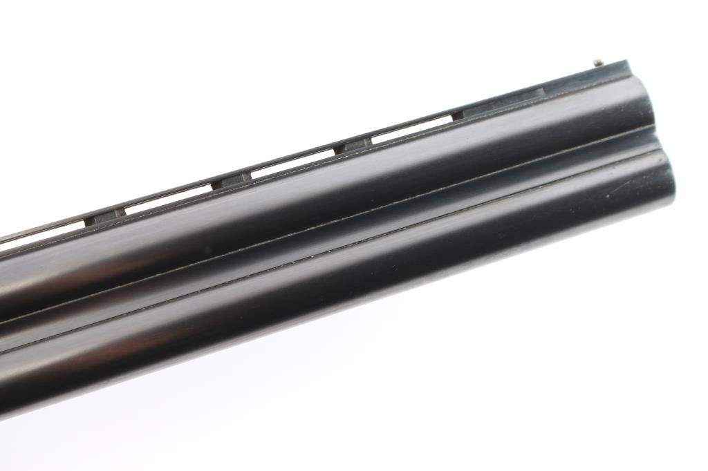 Japanese made over and under box-lock shotgun chambered for 2 3/4" 12 Gauge shells. Miroku made Charles Daly shotguns from the late 1960s to the early 1970s. Superior grade shotgun, featuring a blued finished 28" ventilated ribbed barrels, fixed chokes marked for & measure Full / Mod, steel bead front sight, steel mid-bead, selective ejectors, single curved smooth gold-toned inertial trigger, checkered top lever, and serrated sliding tang safety and barrel selector. The high gloss walnut furniture consists of a semi-pistol grip shoulder stock with checkering at the wrist, checkered grooved forend with Deeley latch release, long lower tang, 13-1/2" length-of-pull, 1-3/8" drop at comb, 2-1/4" drop at heel, black grip cap with white spacer, and a brown solid rubber Decelerator recoil pad. The receiver displays limited coverage floral scrolls, and edge designs. The engraving extends to many of the small parts including the top lever, trigger guard, sides of the top barrel, and on the forend parts. Receiver, forend, and barrels all have matching serial numbers, '552890.' The original blued finish remaining is approximately 98% with light scattered scratches, and light edge wear at the muzzle and triggerguard. Bores look excellent and bright, and the action is smooth with tight lock-up & the top lever resting centered. Furniture wood is good to very good with a scattered nicks and dings on the buttstock, a nickel size patch of finish loss on the right side of the buttstock, and some finish losses on the handguard edges where most are on the buttstock. The metal shows a couple small spots of pitting along the barrels left side in front of the forend. The grip cap is showing some delamination. Condition is NRA Good.