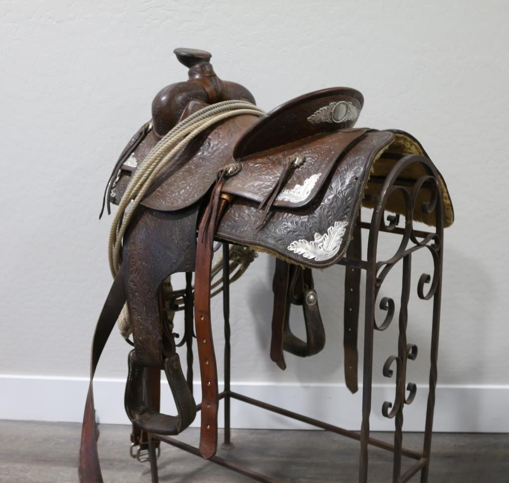 Square skirted brown leather tooled saddle with sterling silver acorn and leaf motif accents. 15" seat, unmarked, in fair to good condition. Shows age and use. Includes rope, straps