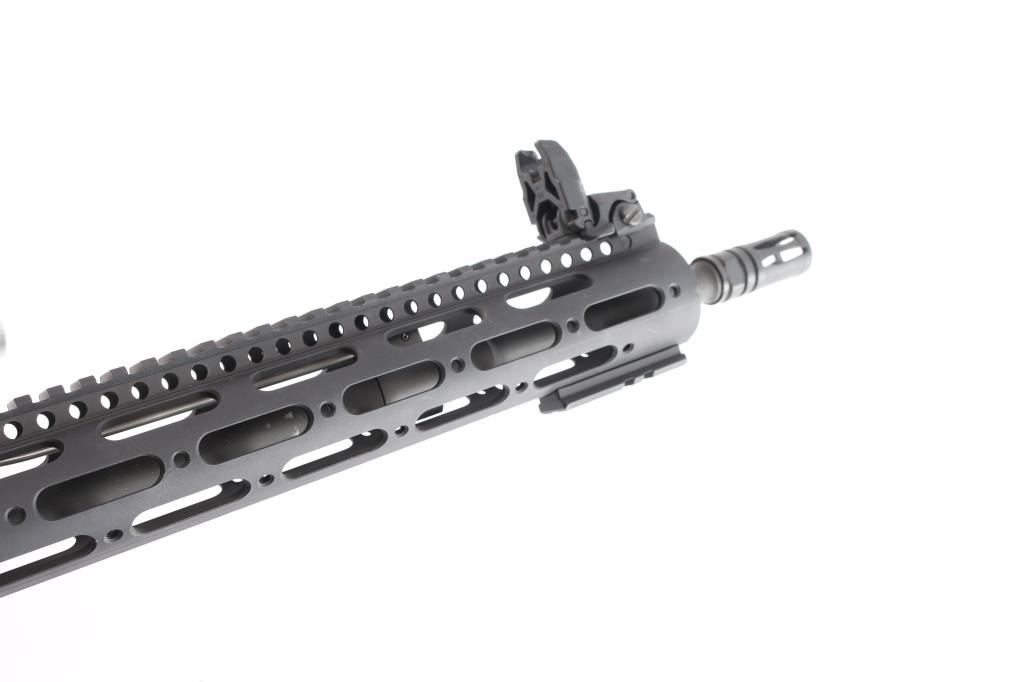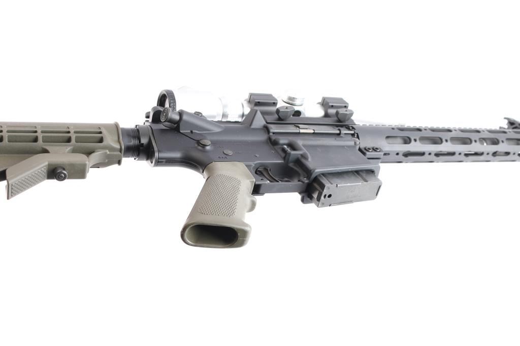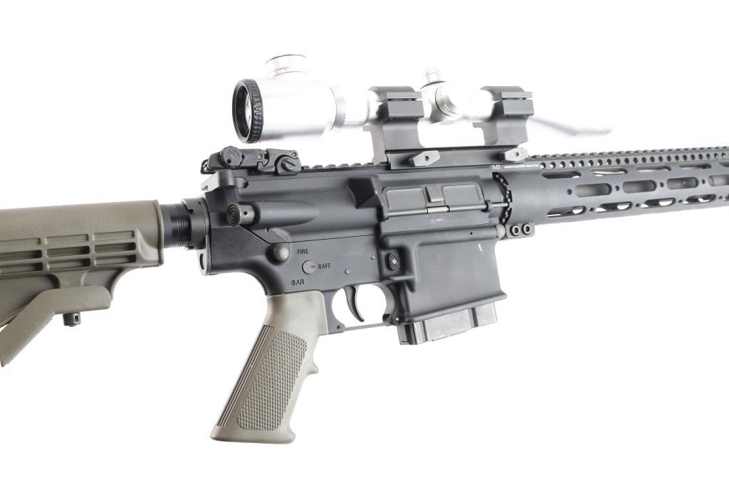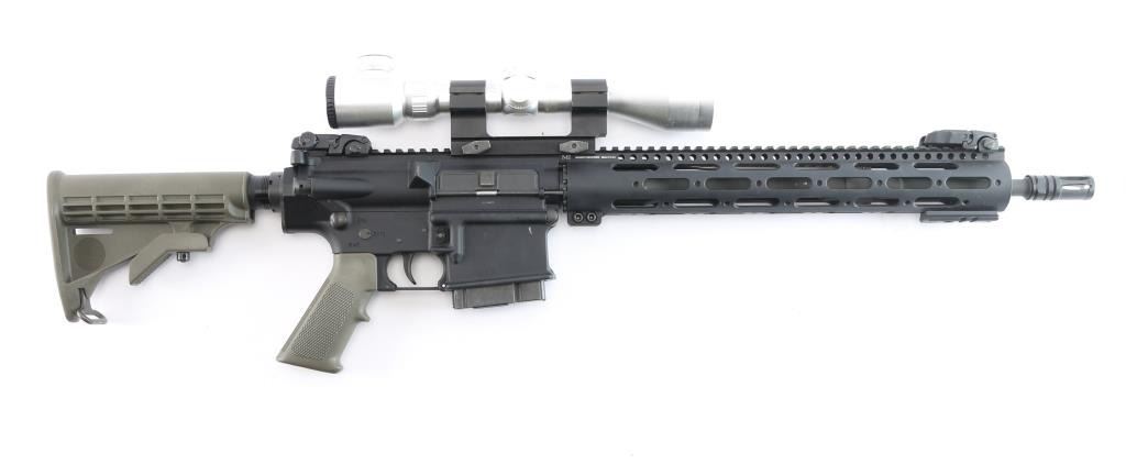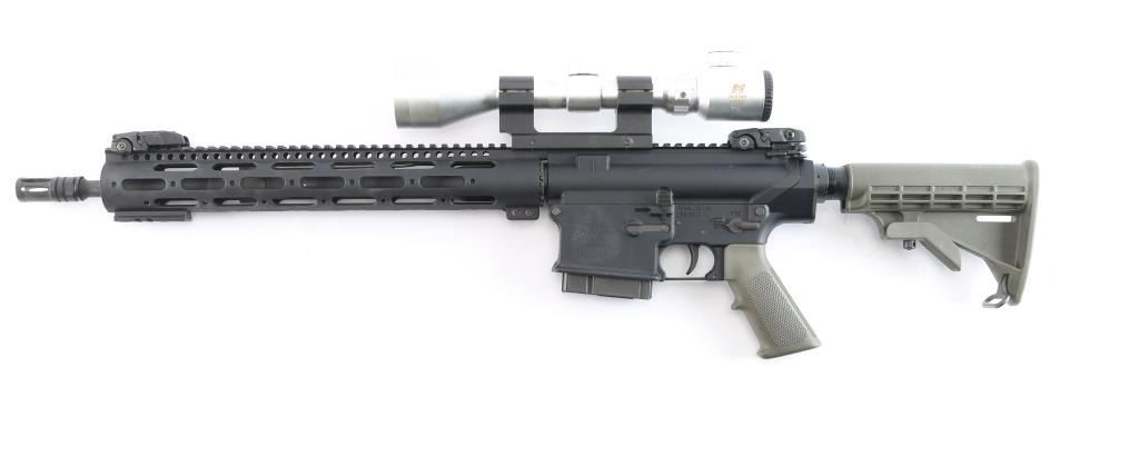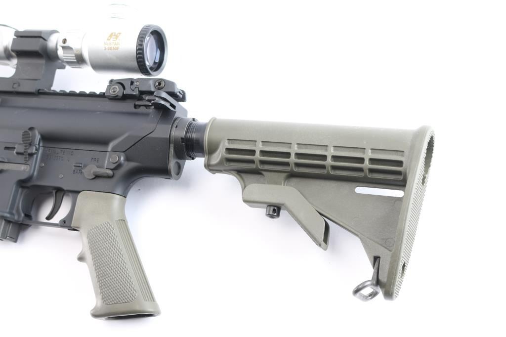 American made semi-automatic gas-impingement carbine chambered for 7.62x51mm, and manufactured in Geneseo, IL. Rifle features a black anodized finish, a 16" chrome-lined chromoly barrel with a 1:11.25" twist rate, A2 style bird cage flash suppressor, Magpul 'MBUS' adjustable folding back-up sights, smooth curved two-stage trigger, serrated receiver mounted manual safety, spring loaded ejection port cover (spring in wrong orientation for function), T-marked 'flat-top' upper receiver, six-position receiver extension, standard charging handle, annular cut bolt assist, 15" aluminum free-float handguard with rail attachment points and a top picatinney rail (added bottom/front rail segment), standard buffer spring and buffer, shell deflector, OEM green M4 style buttstock, OEM green A2 checkered and finger grooved pistol grip, serrated bolt release paddle, flared magazine well, and annular cut push-button magazine release. The original black anodized finish retained is approximately 97% with light scratches on the barrel, edge wear around the ejection port, and minor losses along the picatinney rail. Metal displays no rust, but there is a small nick on the right side of the magazine well that can be felt. Bore is bright with strong rifling, and the furniture is excellent. The action is smooth and crisp, but the dust cover needs repair. Rifle comes with a single-piece aluminum mount holding a silver colored NcSTAR 3-9x50F scope with a duplex reticle that incorporates windage and elevation markings. Scope is bright and in good working order with slight discoloring. Includes one magazine total.