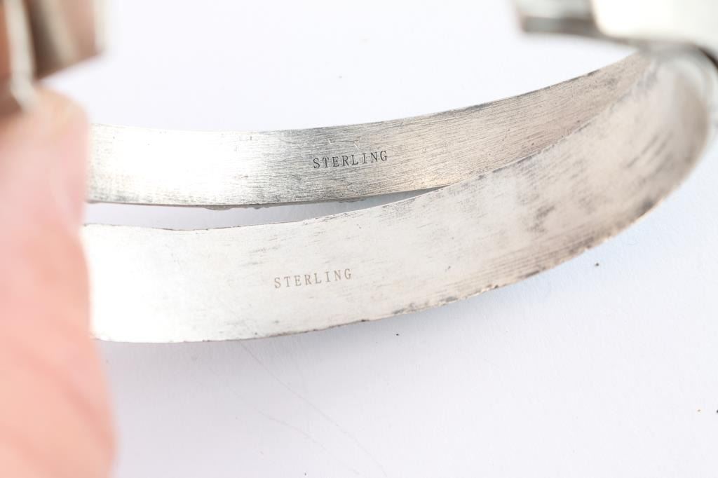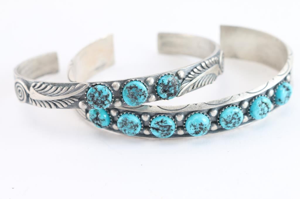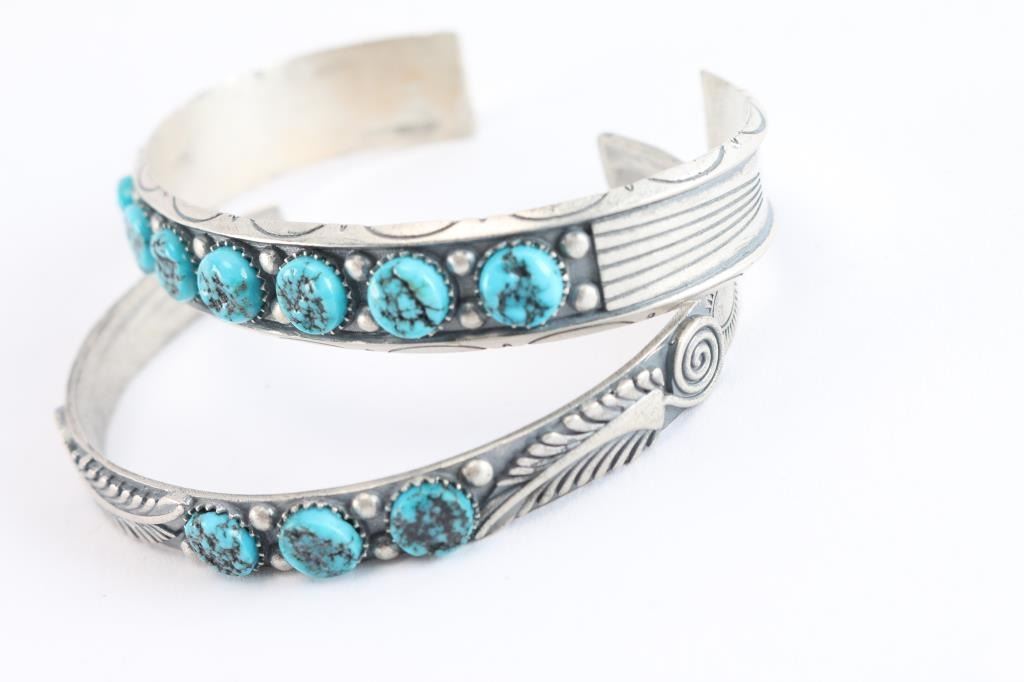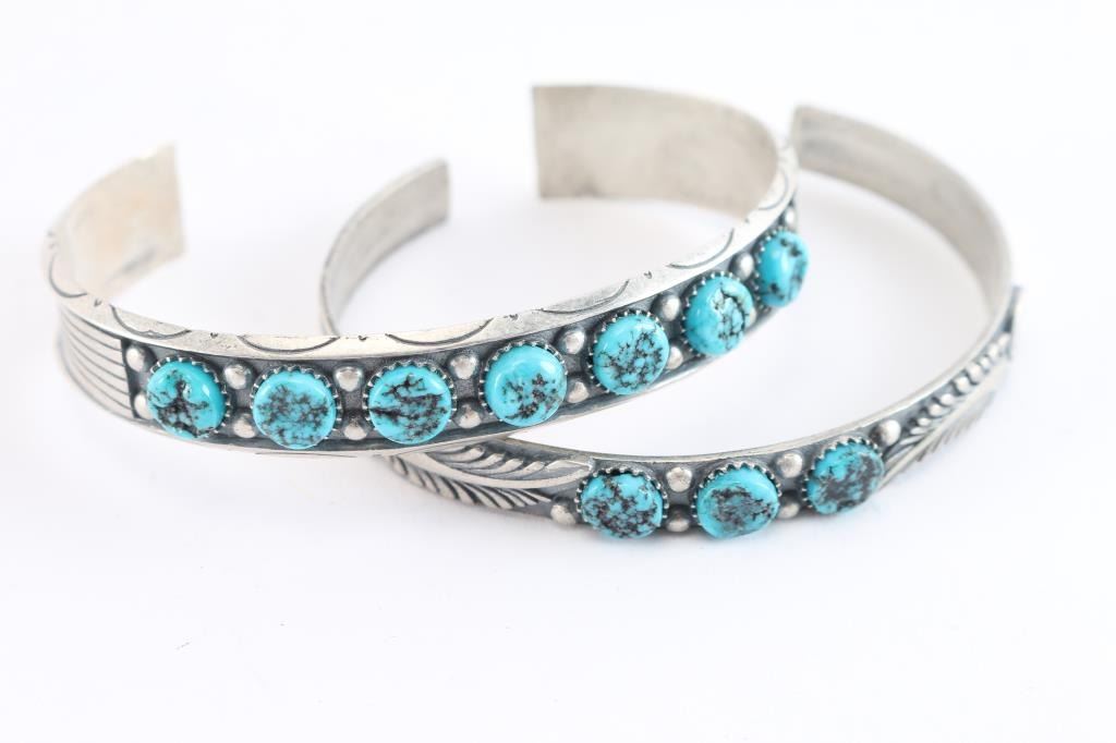 A) Smaller cuff with 3 round turquoise stones set in satin sterling silver; B) larger cuff features 7 turquoise stones in satin sterling silver.